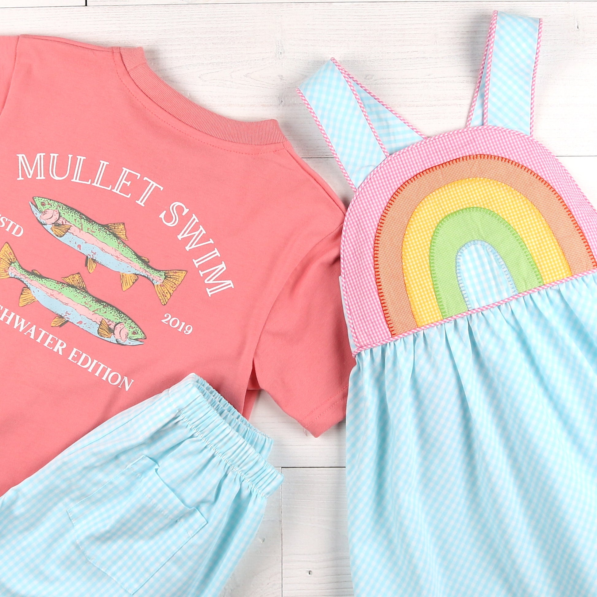 These shorts coordinate with our Rainbow and Rainbow Trout Collections for matching sibling outfits.