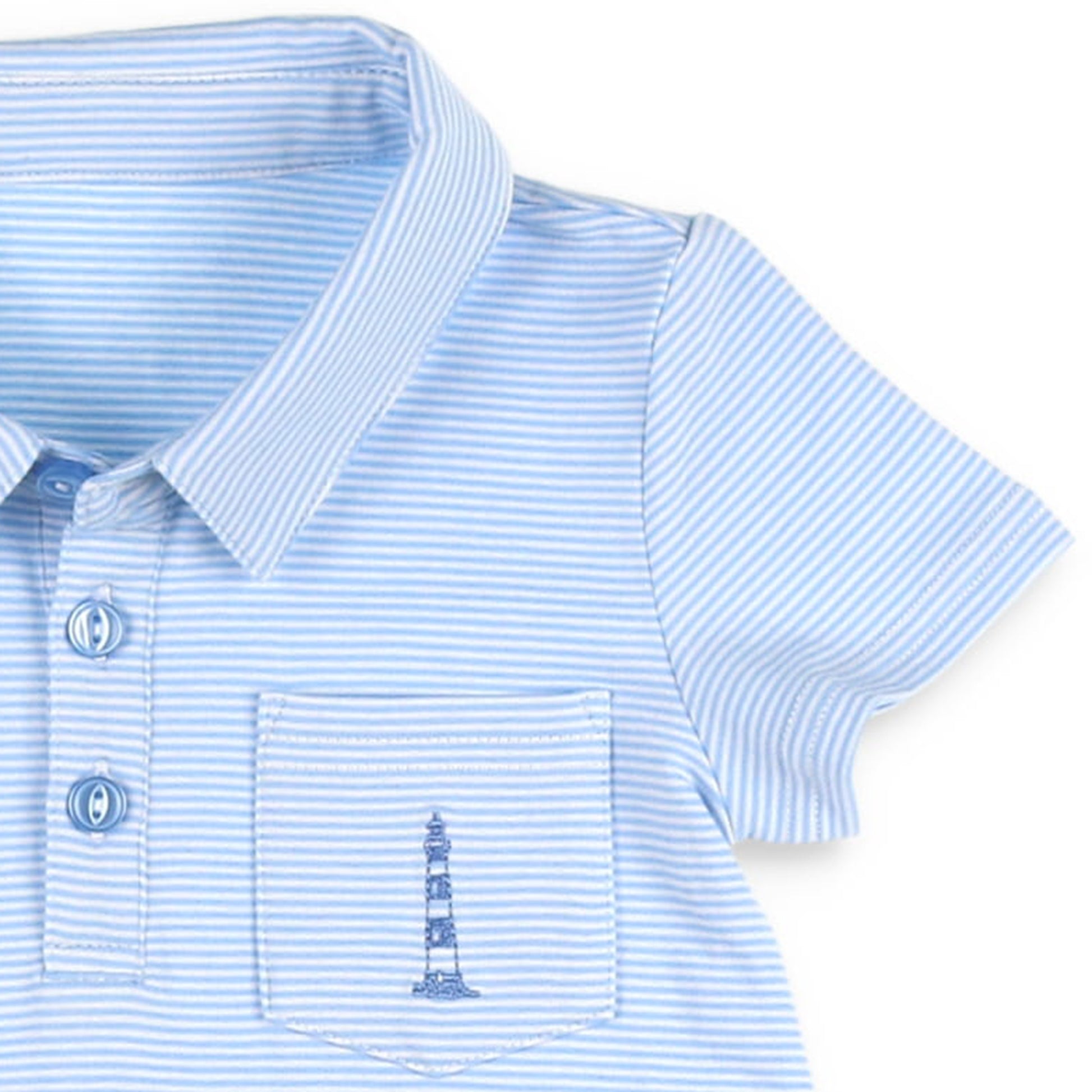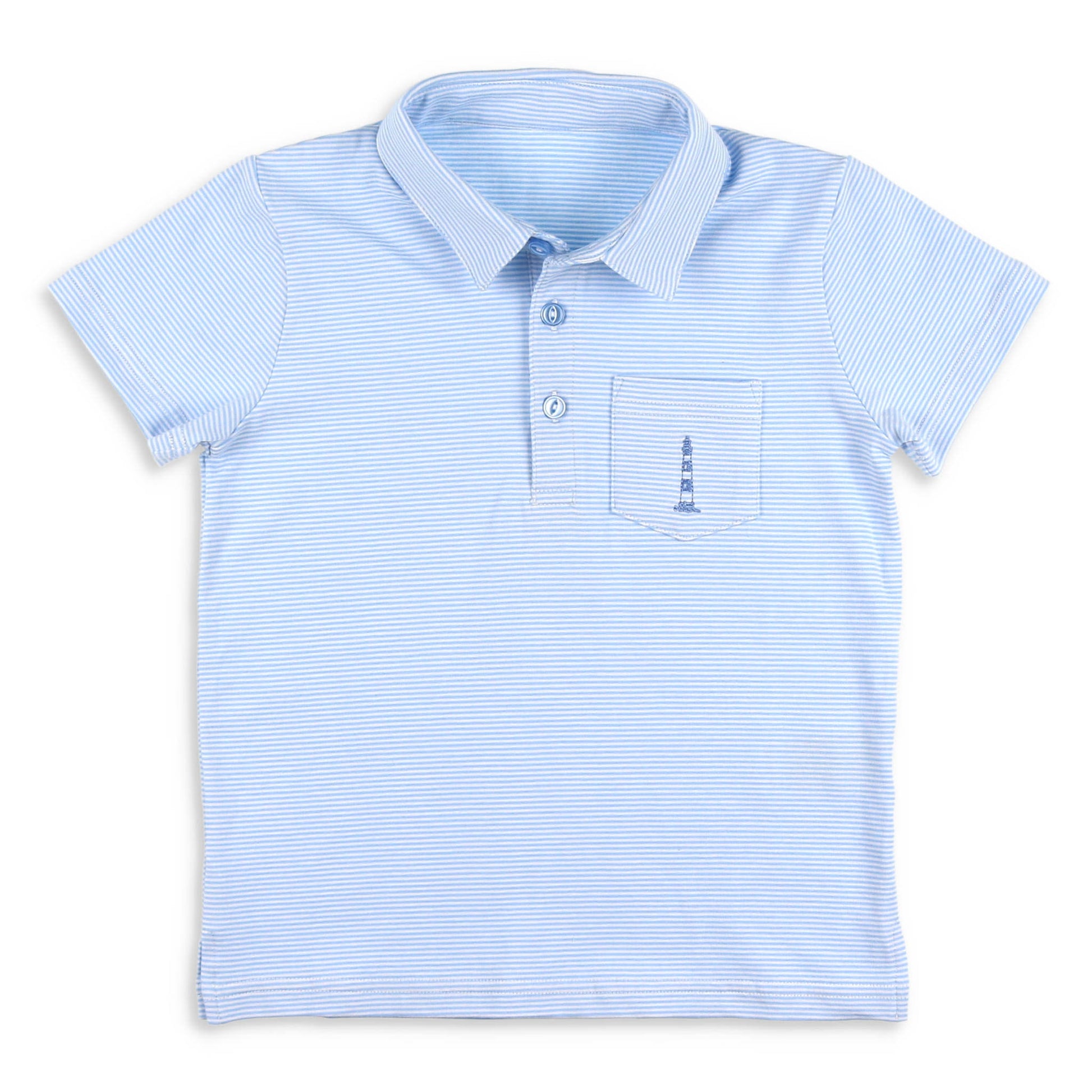This boys classic, blue and white stripe, short sleeve, polo shirt by Serendipity is perfect for any spring or summer adventure, especially that beach vacation. Pair with our Shrimp Shorts or Button shorts!