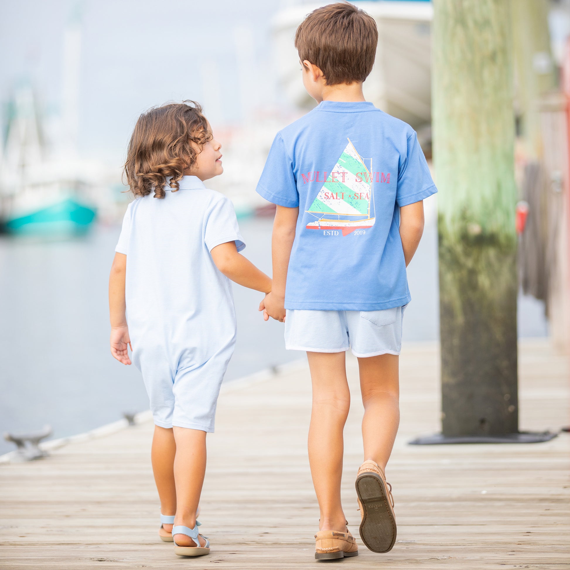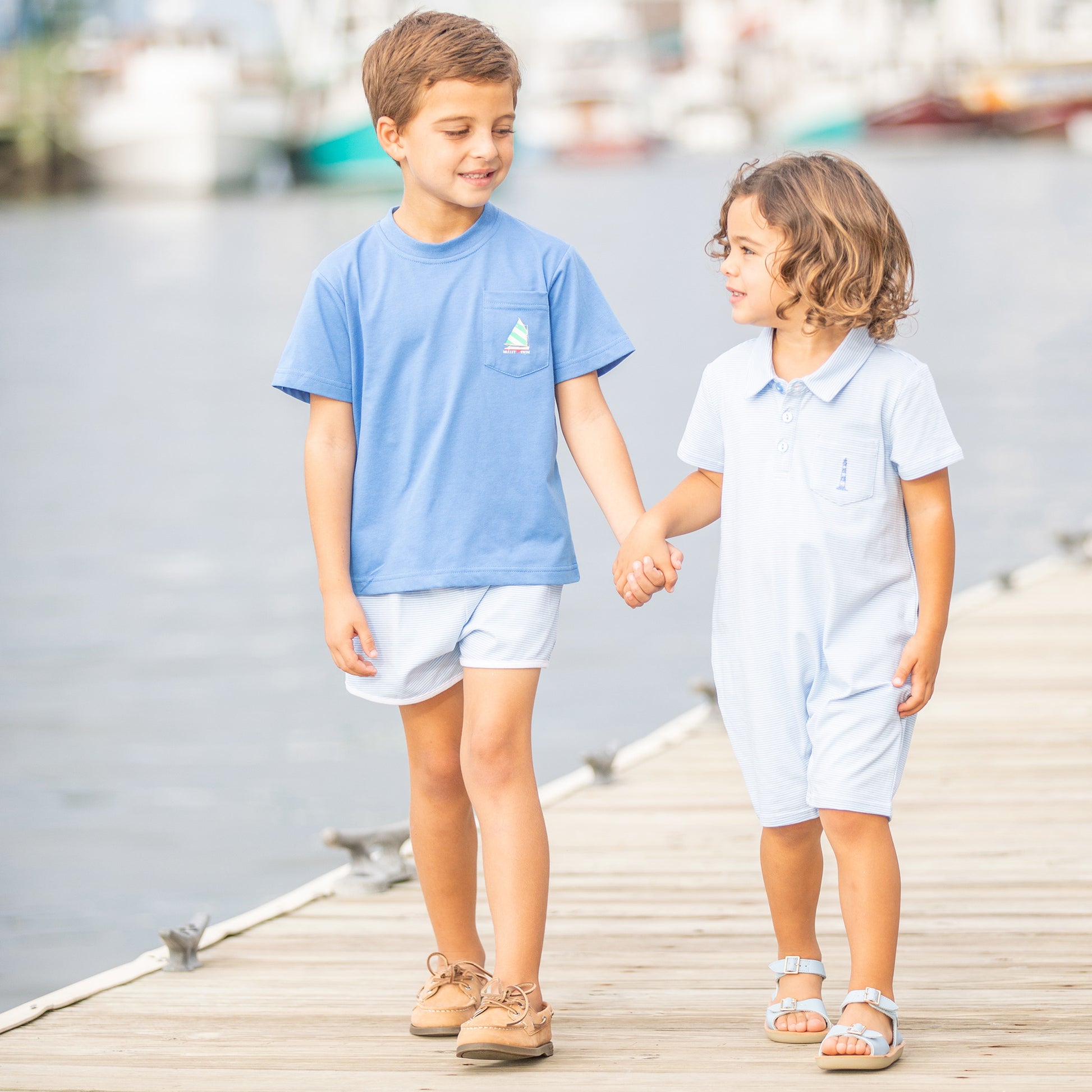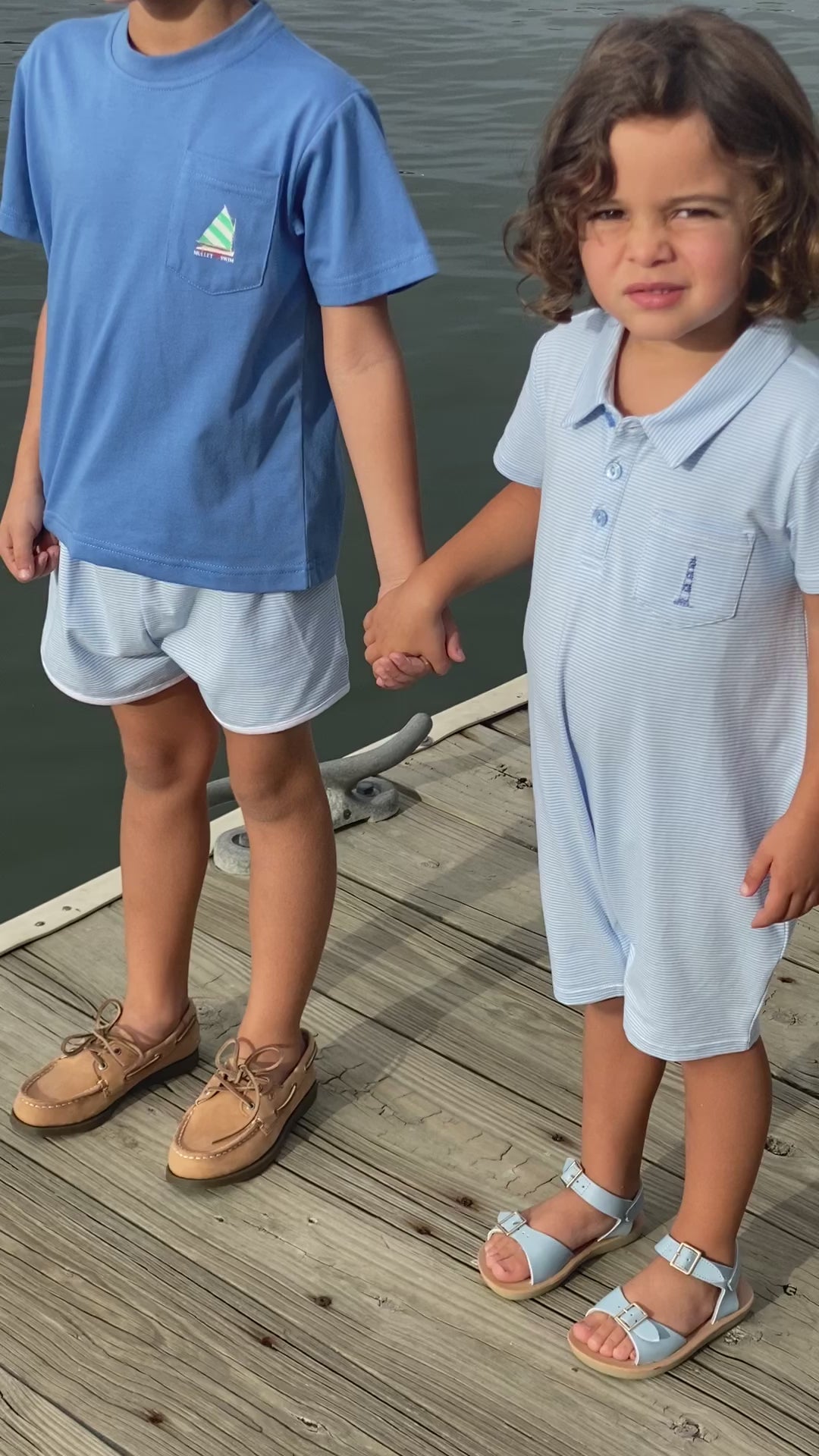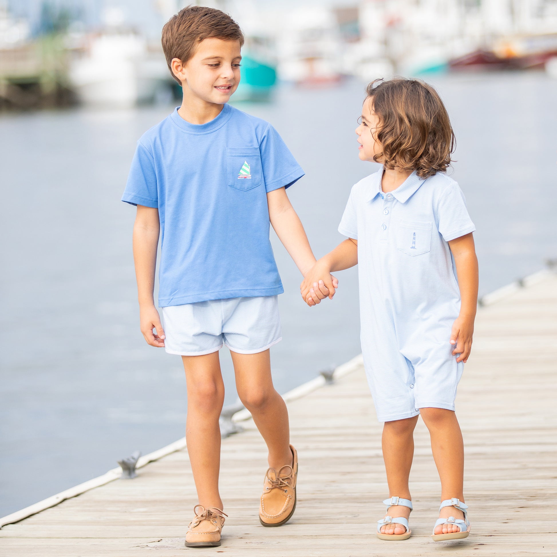These blue and white stripe shrimp shorts feature a cotton blend fabric, two piping trimmed side pockets, a lined elastic waist with a white drawstring, and a back pocket. Coordinates with our Avery Stripe collection. Pair with many of our graphic tees or any of his favorite T Shirts and have your fellow jumping at the chance to explore and play during these spring and summer seasons.