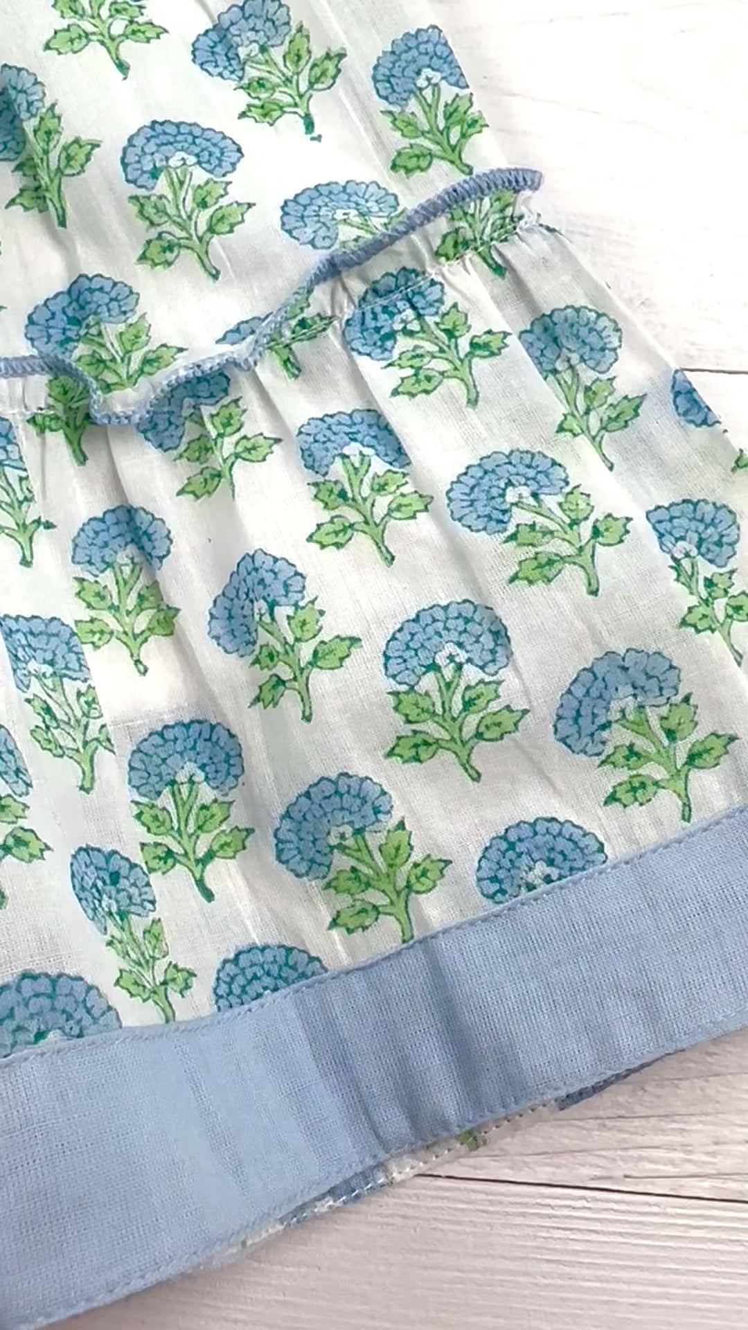 This comfortable and effortless sundress features a hand smocked bodice, soft blue tie shoulder straps, blue serge trim on the ruffles on the skirt tiers, blue grosgrain trim on the hem, and a Jaipur inspired hand printed block print crafted in India, of fresh light blue hydrangeas on summery white cotton fabric. So carefree and comfy!