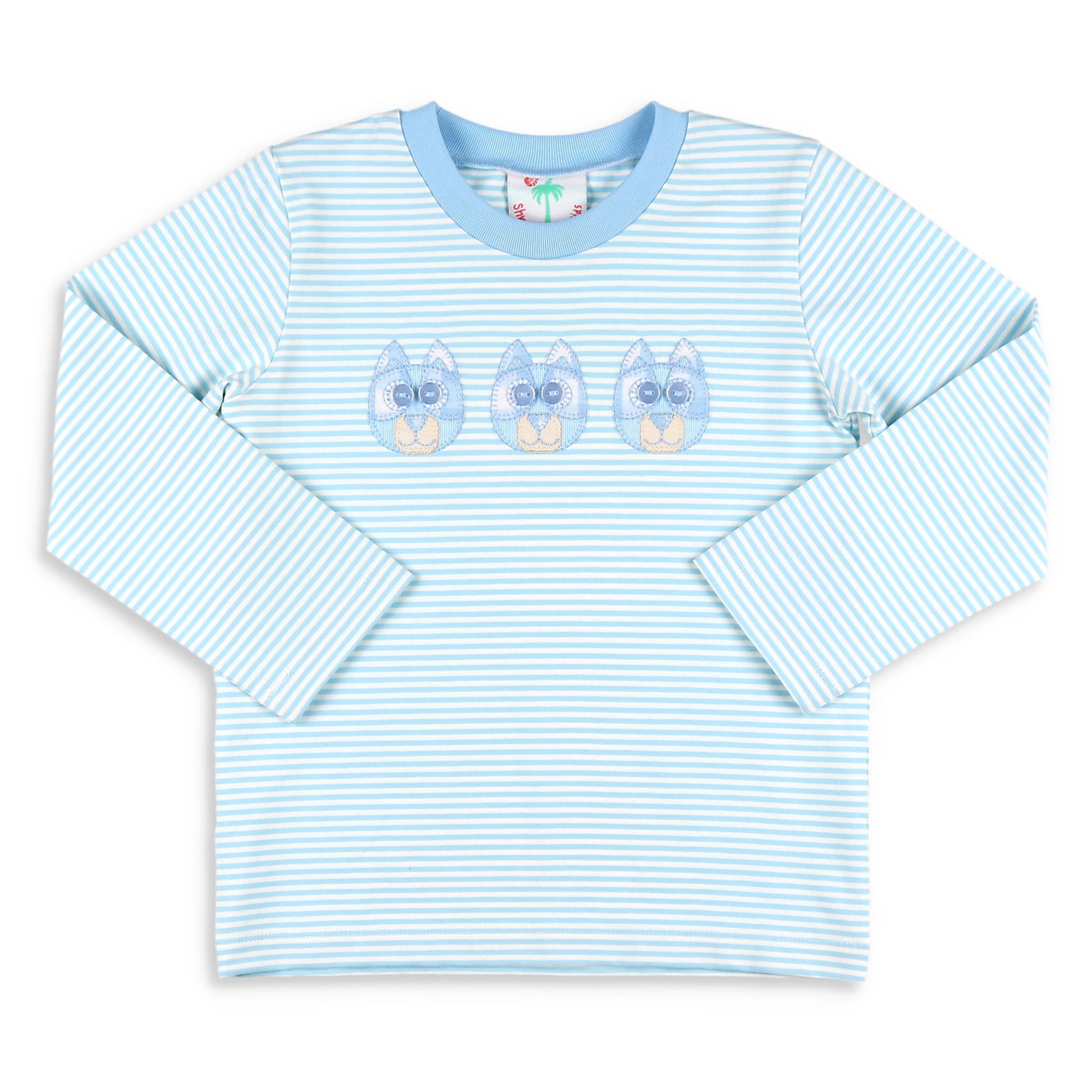 This fun, easy-to-wear, comfy tee shirt, features a light blue and white stripe cotton knit fabric, a blue banded neckline, long sleeves, and three appliqued Blue Healer puppy heads in blue and white, with blue button eyes across the chest. Pair with his favorite jeans, or our khaki or light blue Shrimp Pants for such a happy and vintage outfit, and it will surely become one of his favorites!