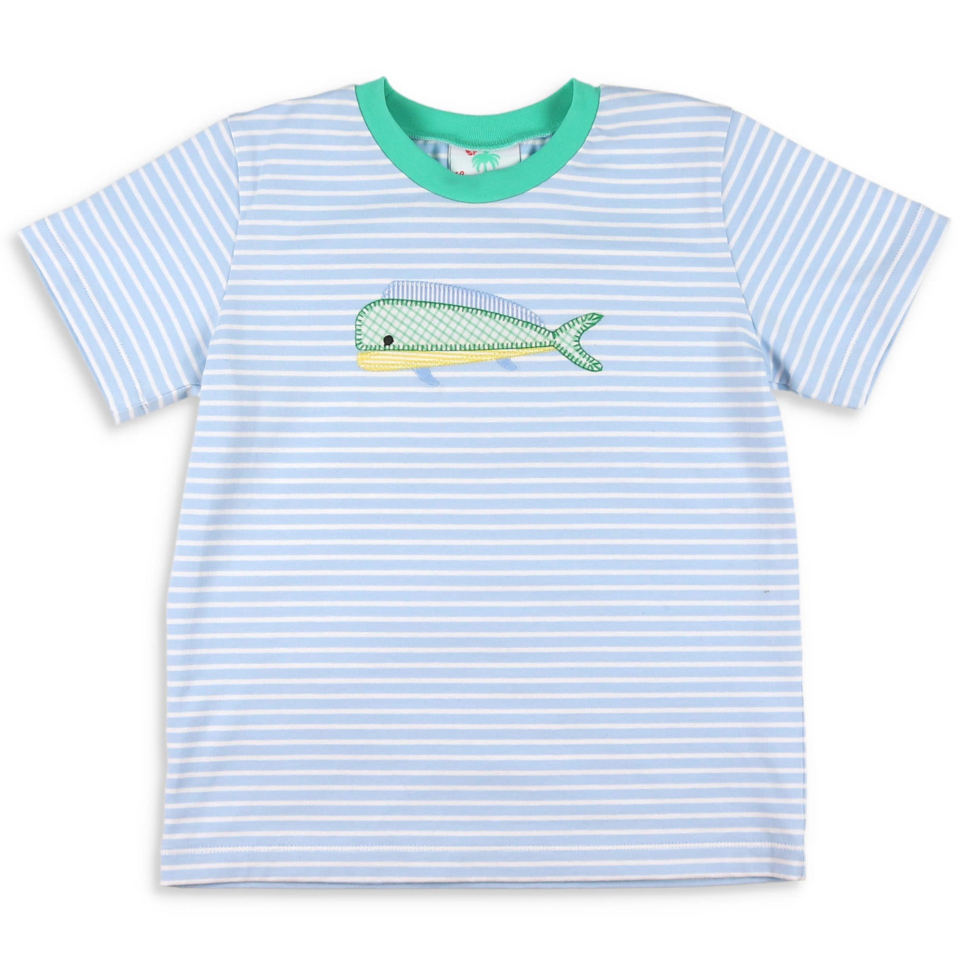 This boys classic, blue and white stripe, short sleeve, tee shirt/romper by Shrimp and Grits Kids, with the green banded collar, is perfect for any spring or summer adventure, especially that beach vacation. The giant fish applique in green window pane check and yellow and white stripes makes it even more fun!