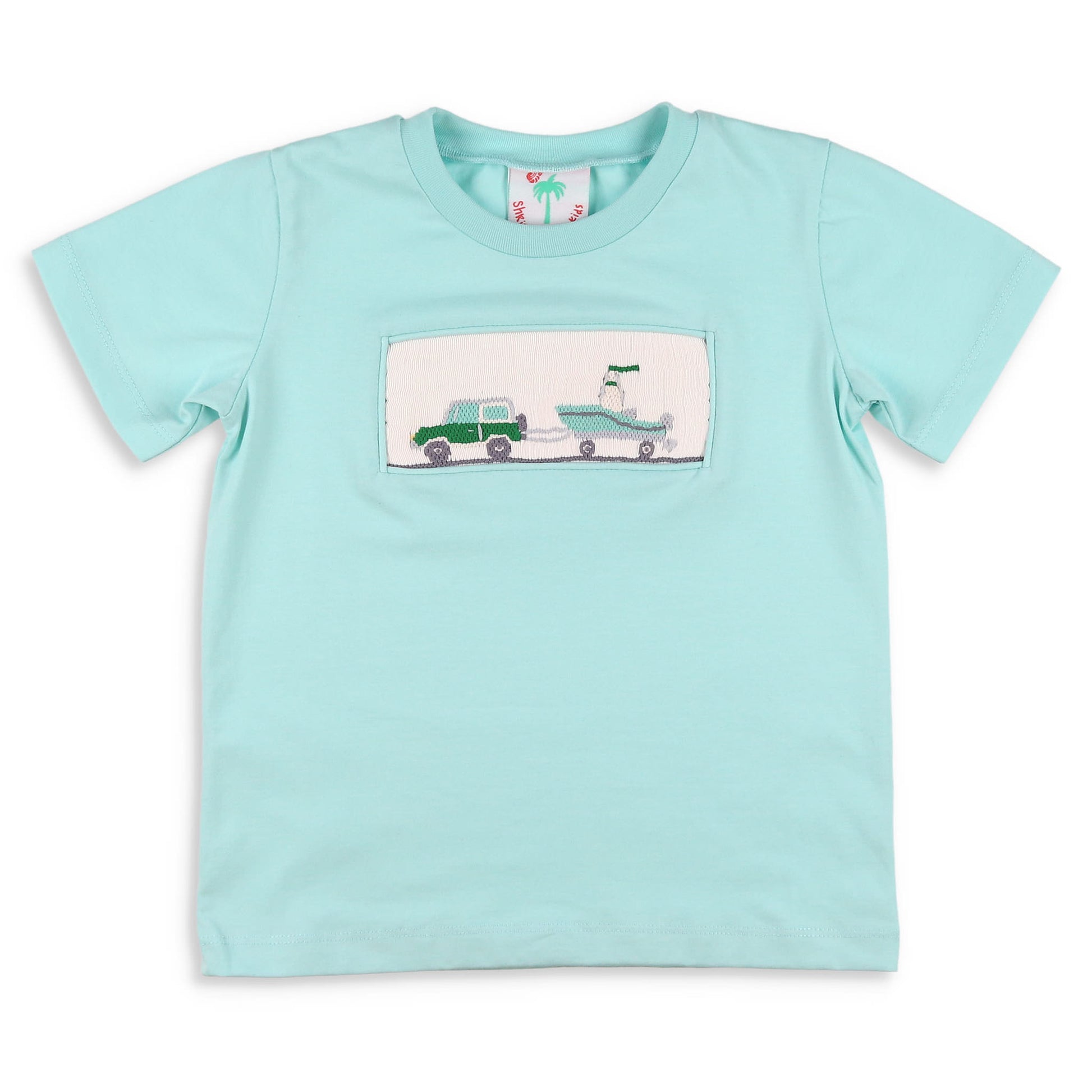 This short sleeved, aqua boys tee features a vintage SUV hauling a motor boat, hand smocked along its front and trimmed with aqua piping.