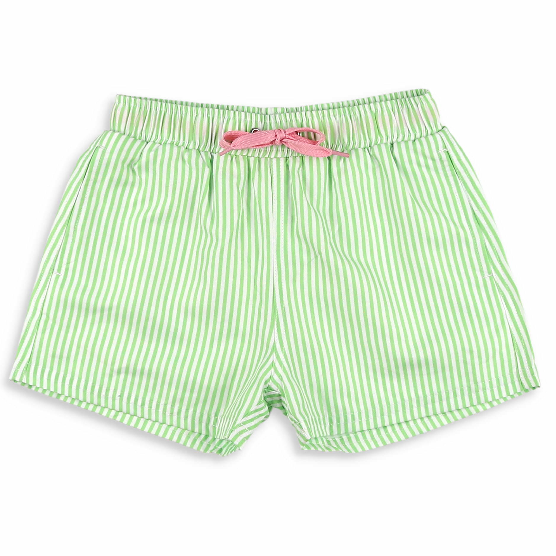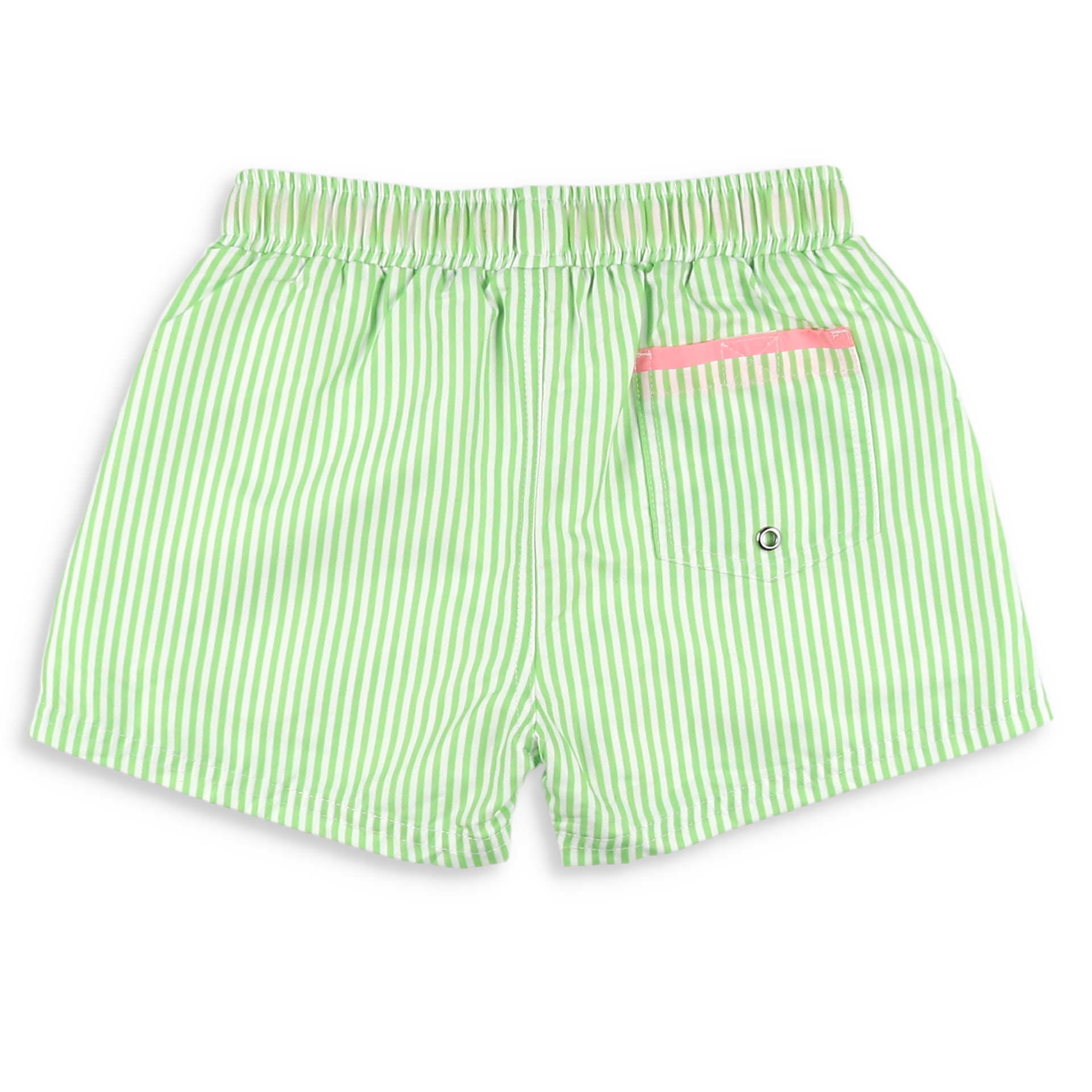 The fresh green and white stripe fabric, a super soft, mesh, boxer brief liner, the two side pockets, an elastic waist band and pink tie drawstring, and a handy pink trimmed back pocket, will have your fellow jumping at the chance to swim and play at the pool or beach, in this baby swimsuit, toddler swim trunks, or boys bathing suit during these spring and summer seasons.