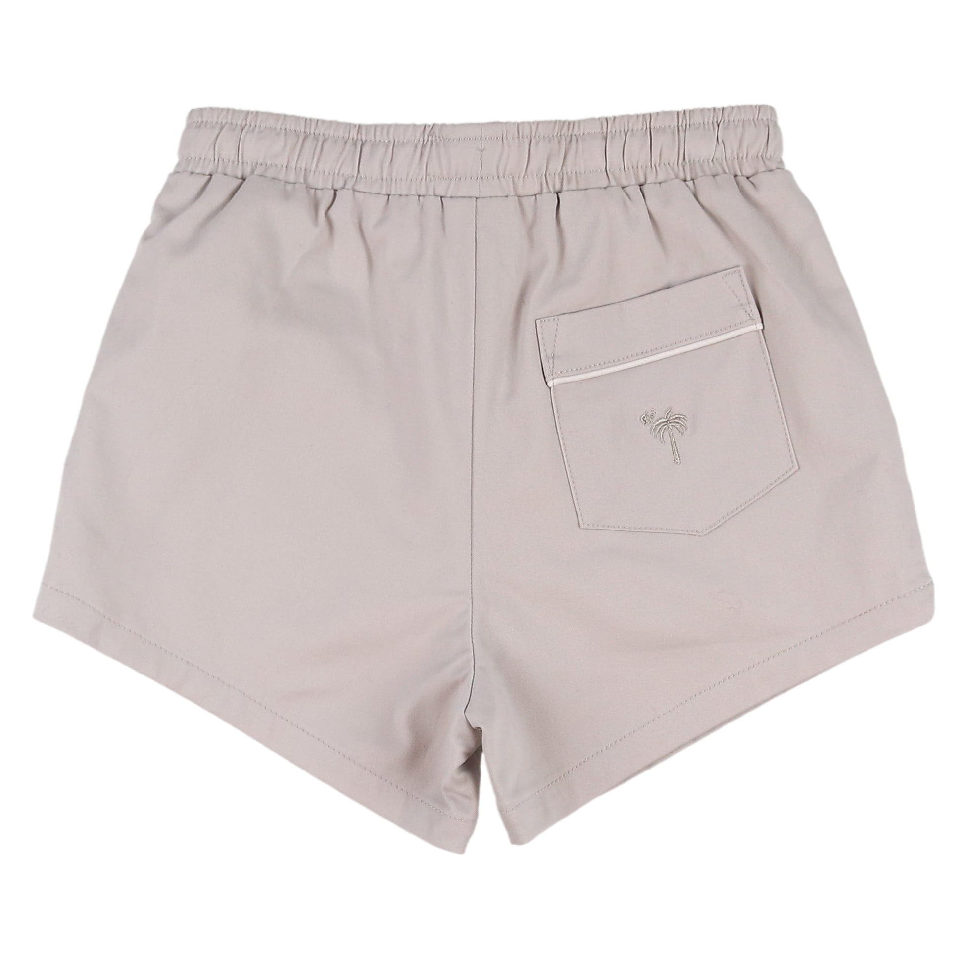 These classic Boys Khaki Shrimp Shorts feature a khaki cotton twill blend fabric, two white piping trimmed side pockets, a terry cloth lined elastic waist with a functional white drawstring, and a back pocket.