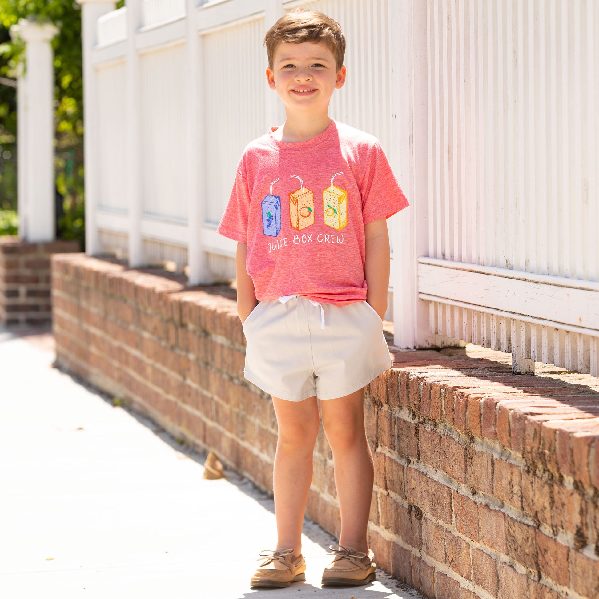These classic Boys Khaki Shrimp Shorts feature a khaki cotton twill blend fabric, two white piping trimmed side pockets, a terry cloth lined elastic waist with a functional white drawstring, and a back pocket.