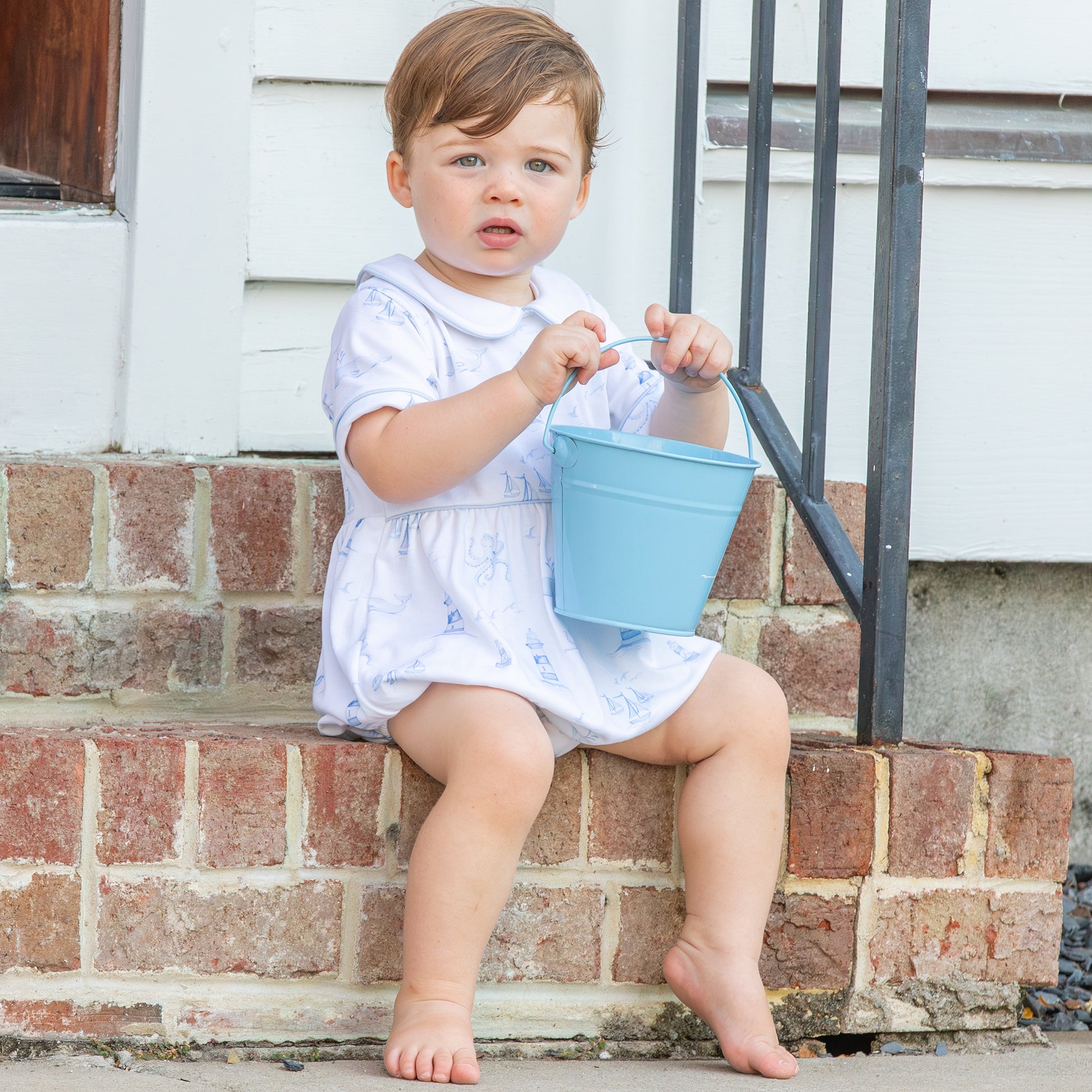 Featuring a nautical blue light house and sea creature toile print on soft white Pima cotton with light blue piping trimming the white Peter Pan collar, around the sleeves, and light blue piping accenting the bodice, makes this baby boy bubble as cute as it is versatile!