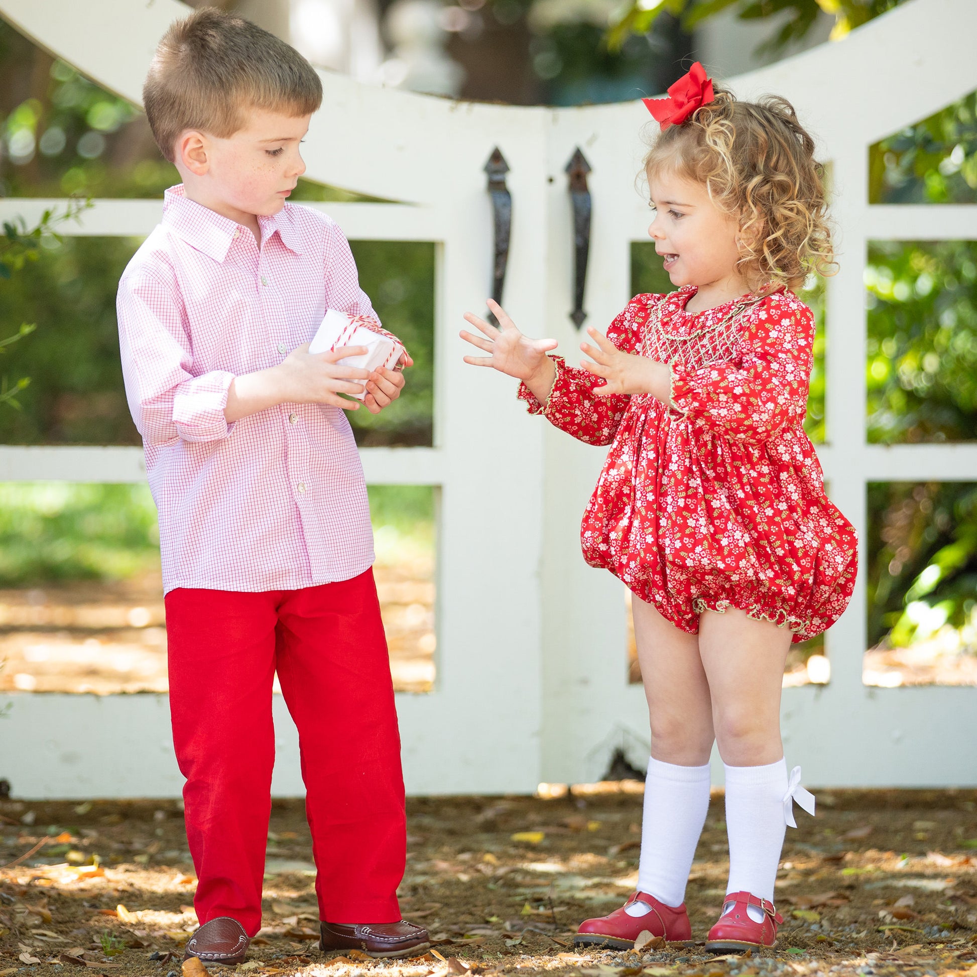 He will be ready for that winter adventure, or that special Christmas holiday occasion!ย It will coordinate with so many of our twill pants and cords!ย Make it even more special with a personalized monogram! And with our Red Corduroy collection, his siblings will have coordinating outfits. What a great photo opp this will make, especially in front of the Christmas tree or for Valentine's Day!