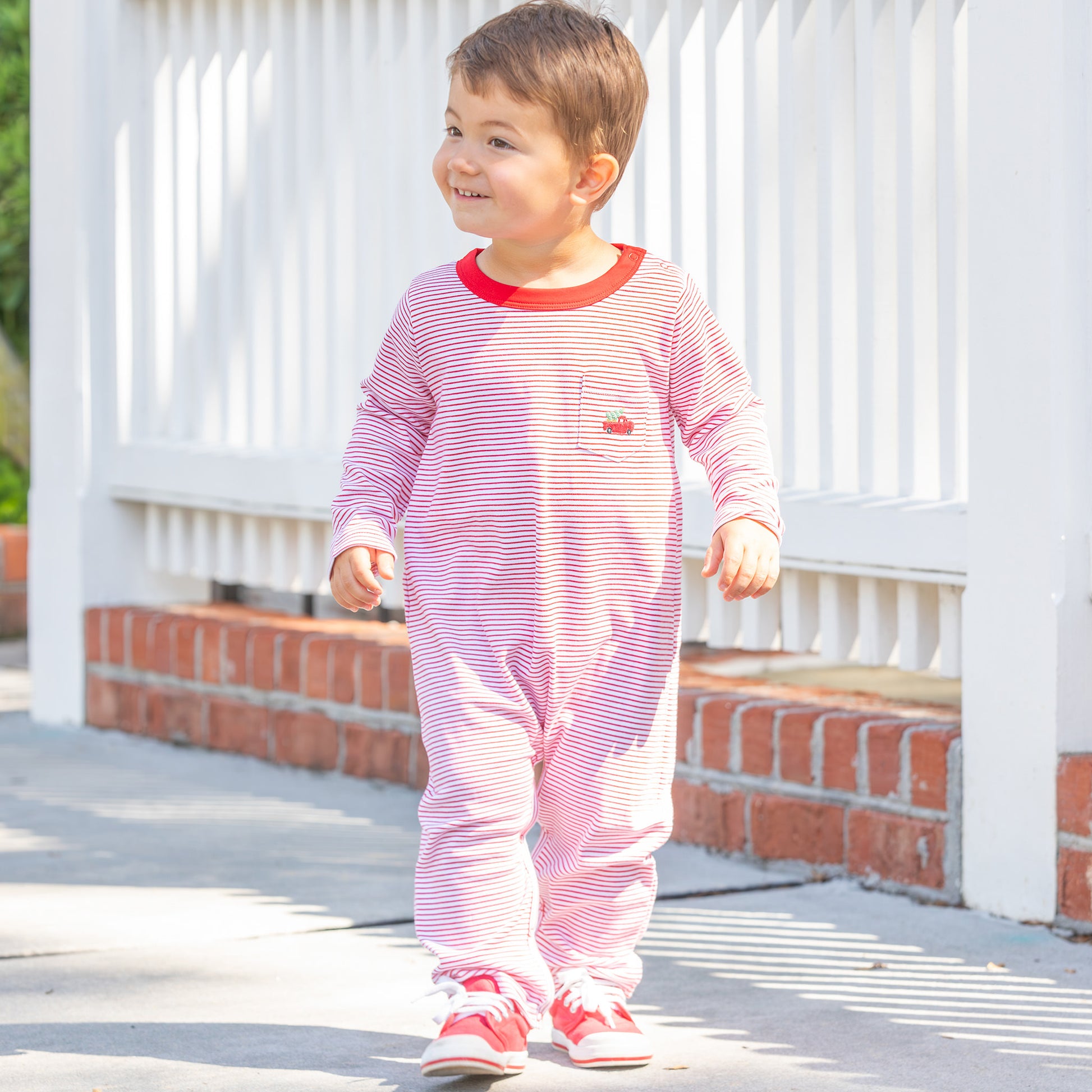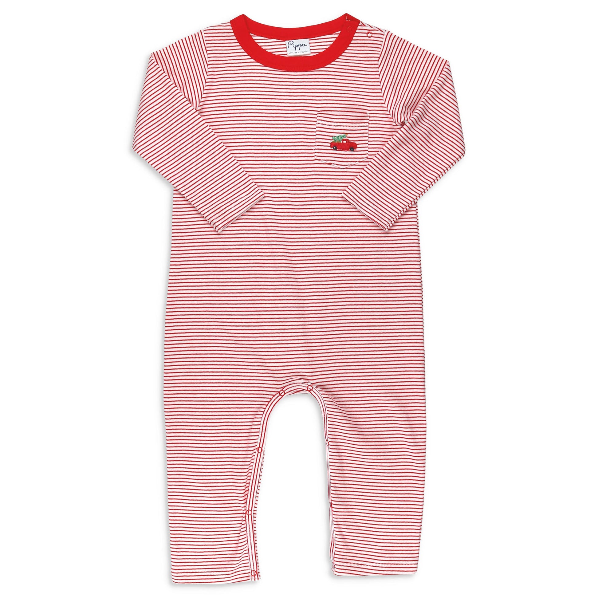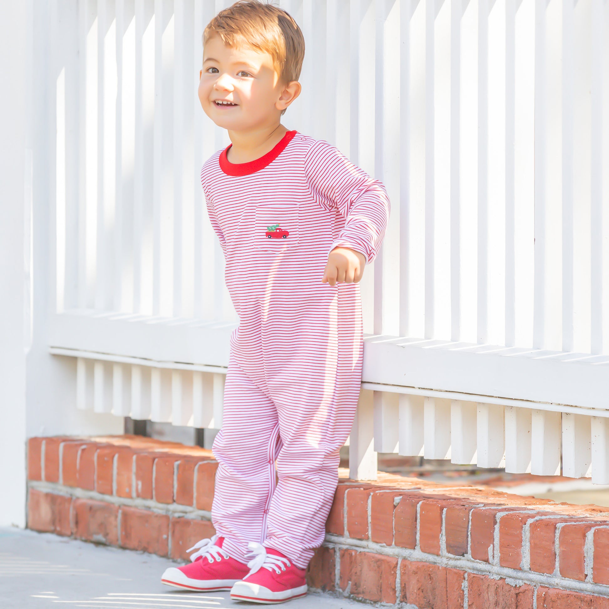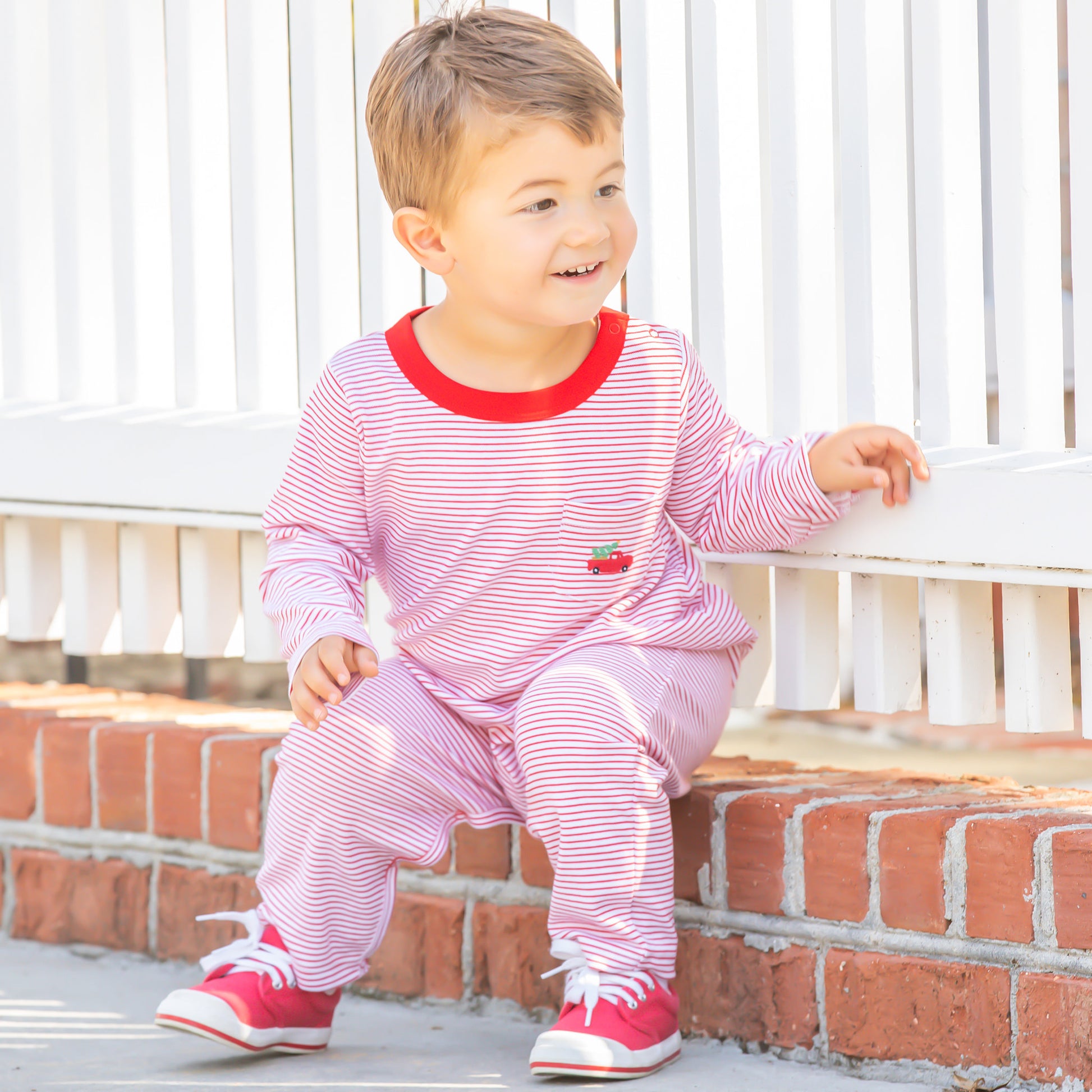Featuring red and white stripe super soft Pima cotton, with a red banded neckline, a front pocket sporting a happy vintage pick up truck hauling a Christmas tree on it, shoulder snaps and snaps at the legs, makes this so easy for quick changes! This classic Jon Jon will be one of your little boy's favorite go to comfy outfits.