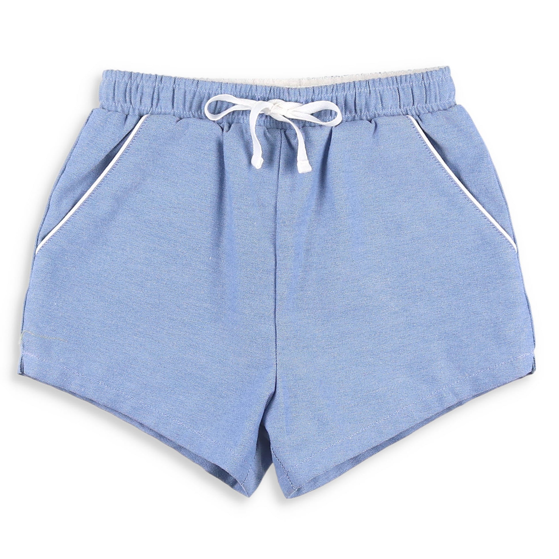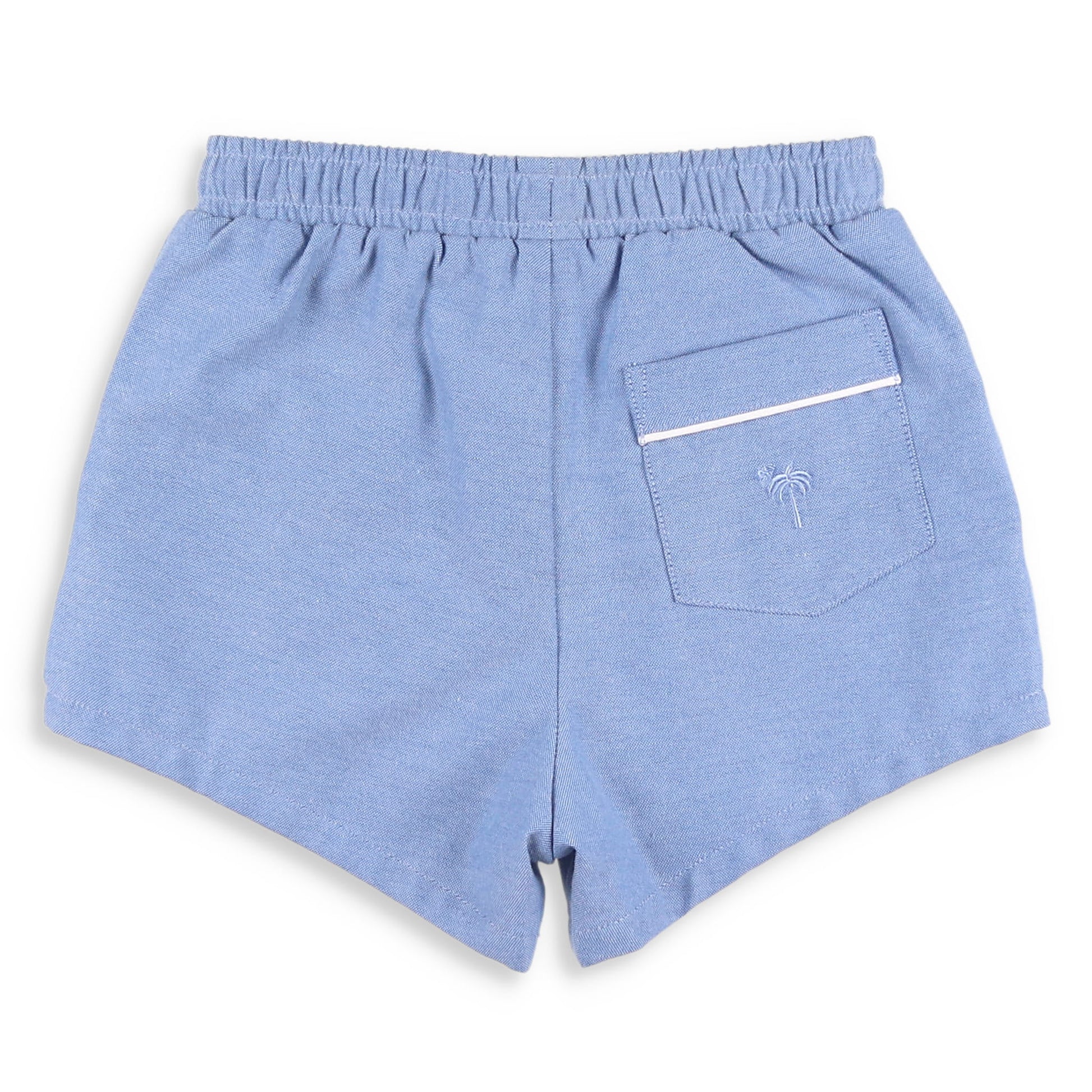 These Boys Shrimp Shorts-Blue Oxford feature a dusty blue cotton blend fabric, two white piping trimmed side pockets, a terry cloth lined elastic waist with a white drawstring, and a back pocket with a palmetto tree logo.