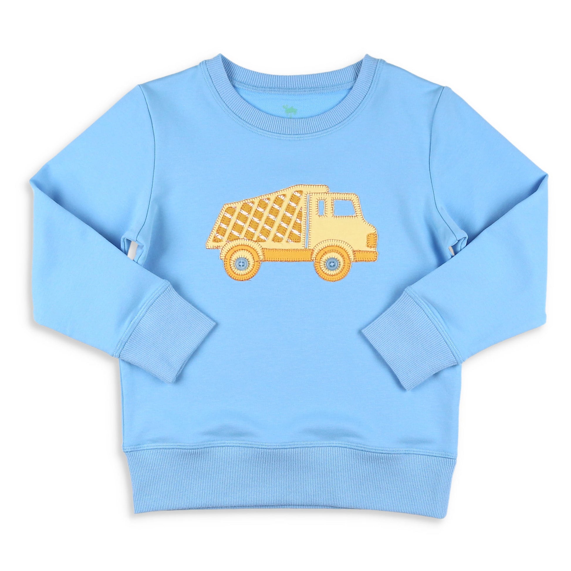 This casual, blue, long sleeve, lightweight outerwear is perfect for any fall or winter adventure, and he'll look the part for a trip to a job site. The accent stitching trim around the neckline, above the cuffs, and above the hem, and the dump truck applique makes it even more cute!