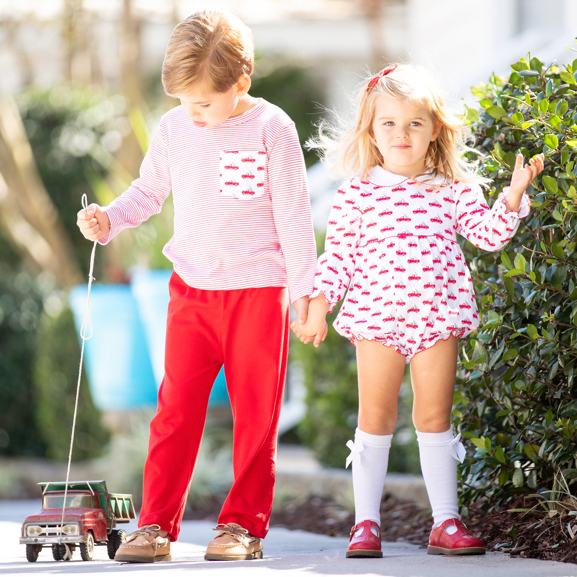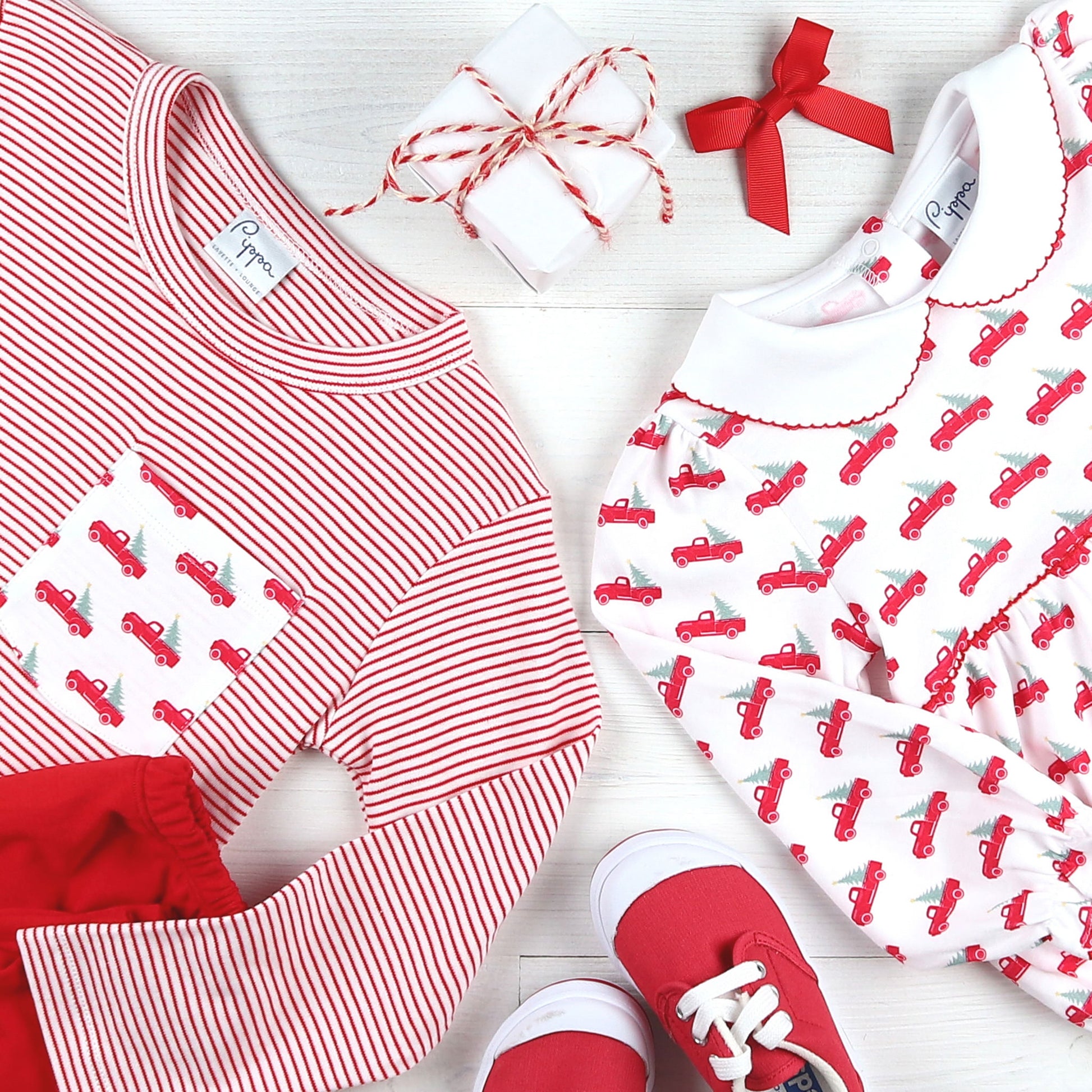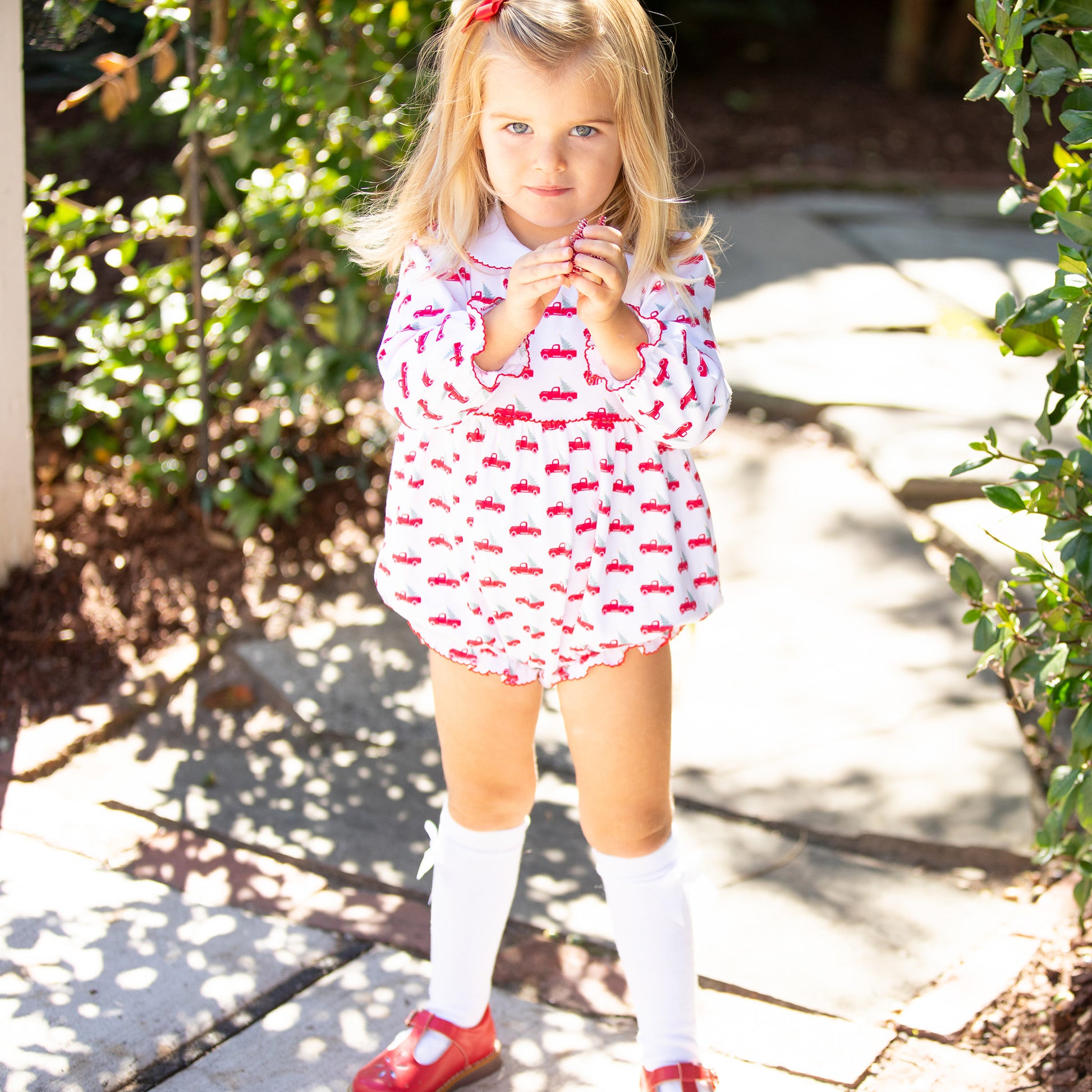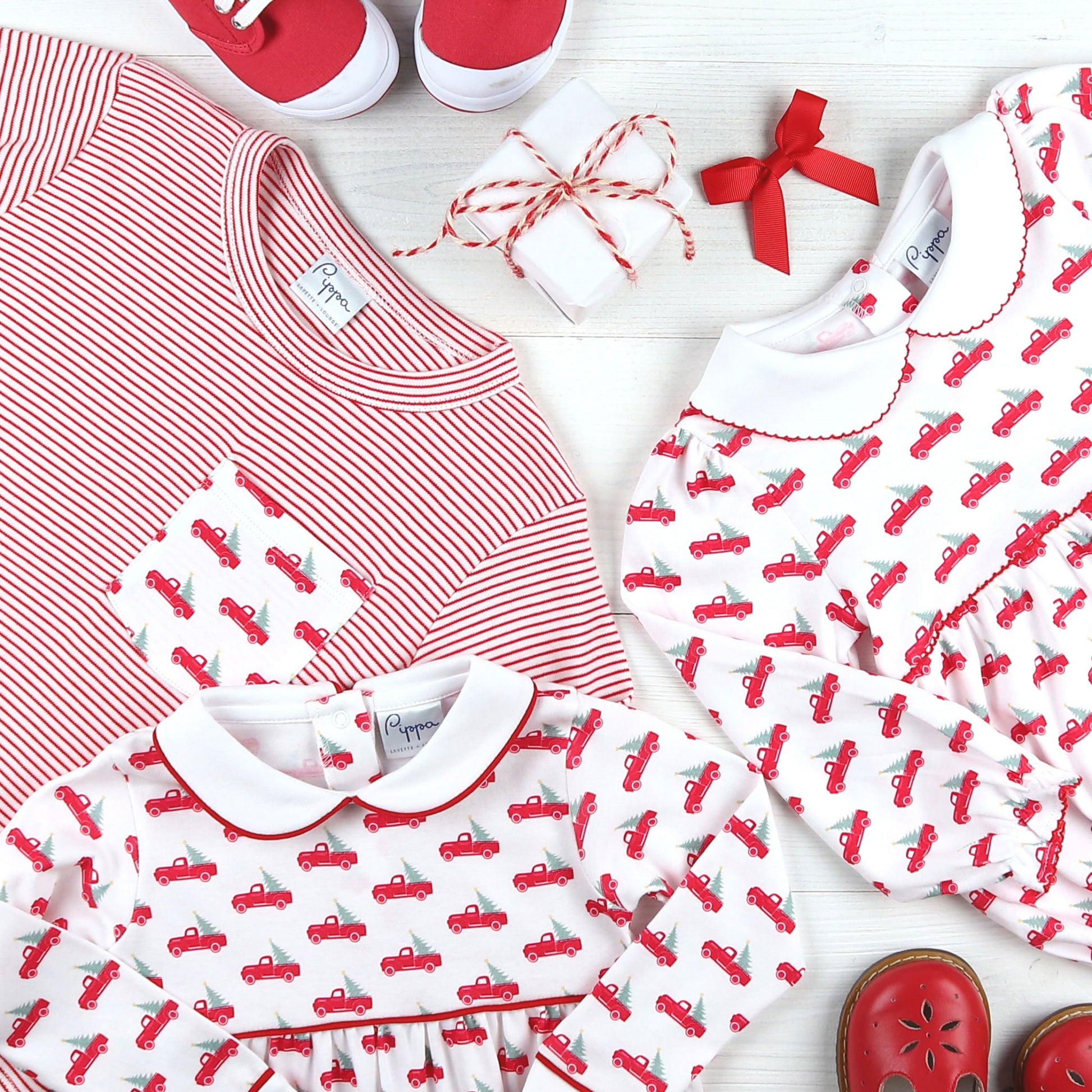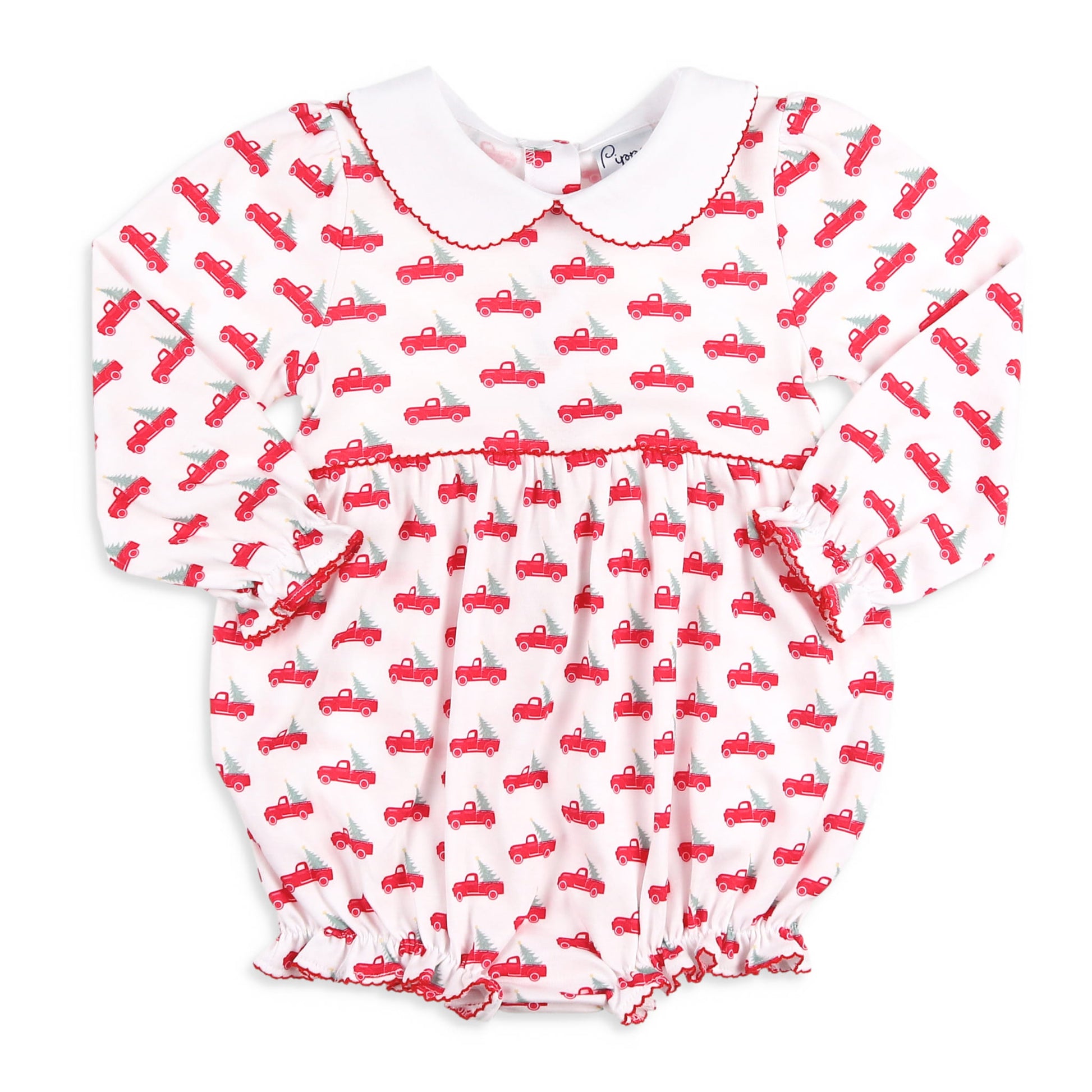 There's nothing like the excitement of choosing a Christmas tree to begin the holiday adventures! This Christmas Trucks Pima Ruffle Bubble by Pippa is sure to exude excitement and a joyful feeling!