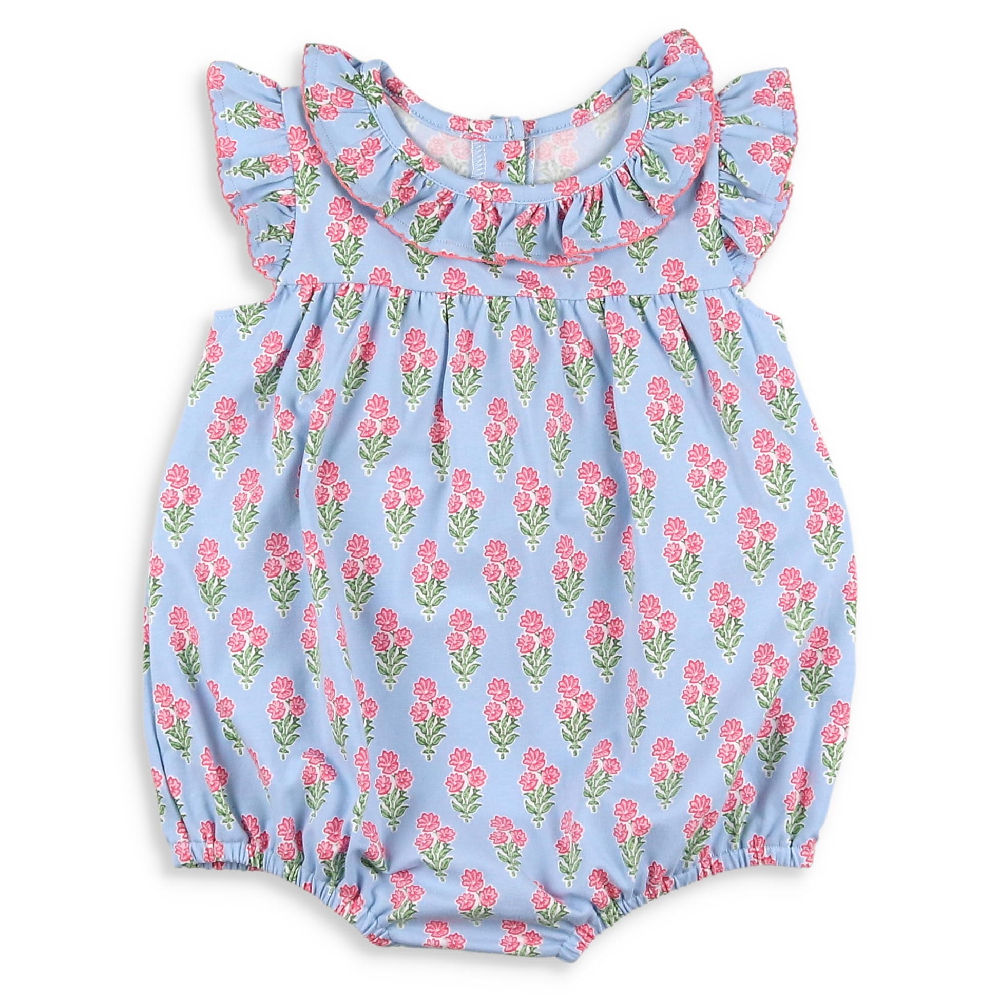 This adorable little baby bubble or toddler bubble features a coral floral bouquet print on periwinkle blue fabric with aย coral serge trim ruffle collar and ruffle sleeves, creating a quaint picture!ย The custom back buttons just make it more practical!