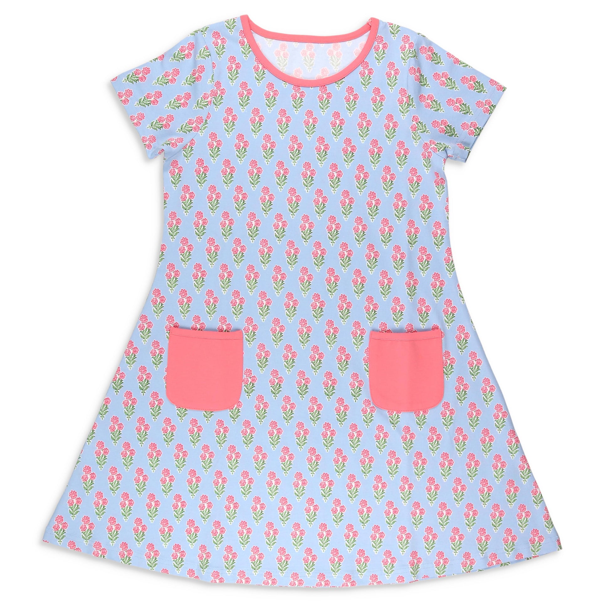 This adorable and easy girls playdress features a coral floral bouquet print on periwinkle blue fabric with a coral trimmed neckline and trimmed cap sleeves, creating a sweet picture! The two fun coral pockets, just makes this dress even more special.