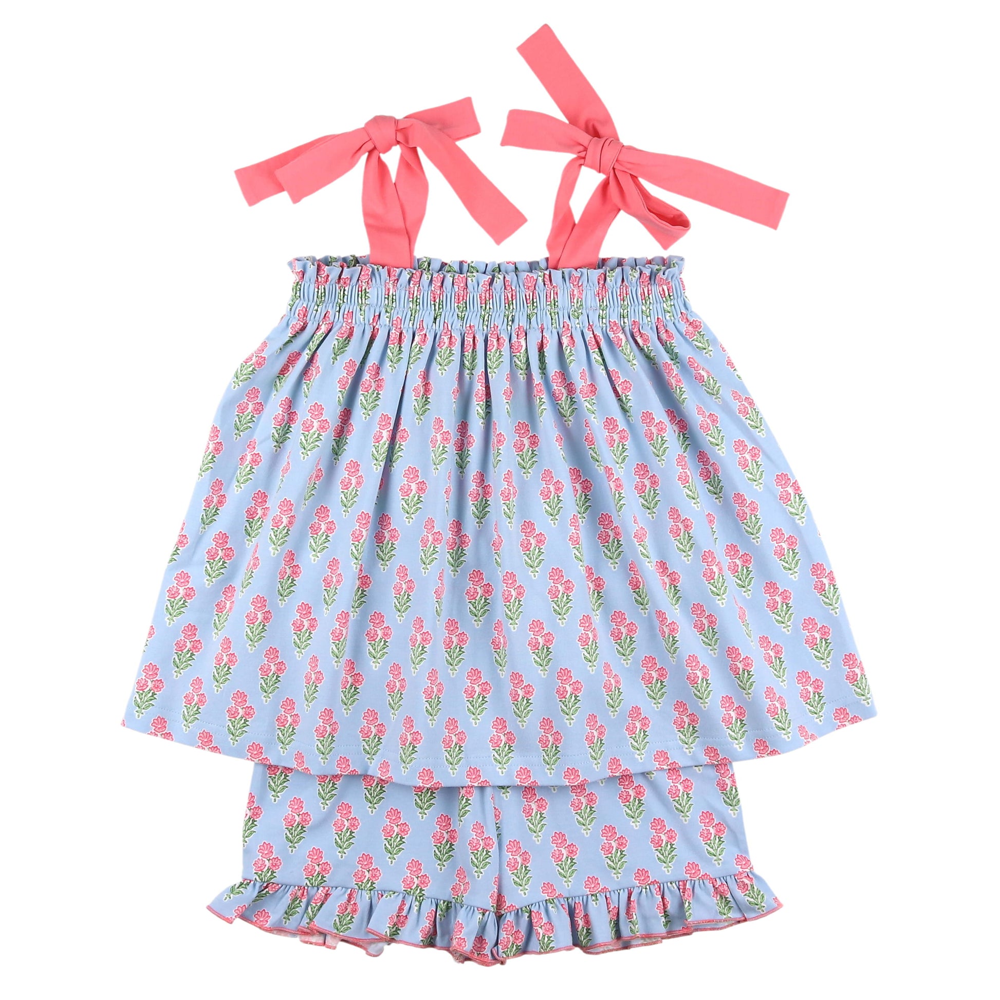 This adorable and whimsical two piece smocked short set features a coral floral bouquet print on periwinkle blue fabric with a hand smocked bodice and coral shoulder ties on the top, and it includes coral serge trim ruffle shorts with a drawstring waist, all creating a precious and playful picture!