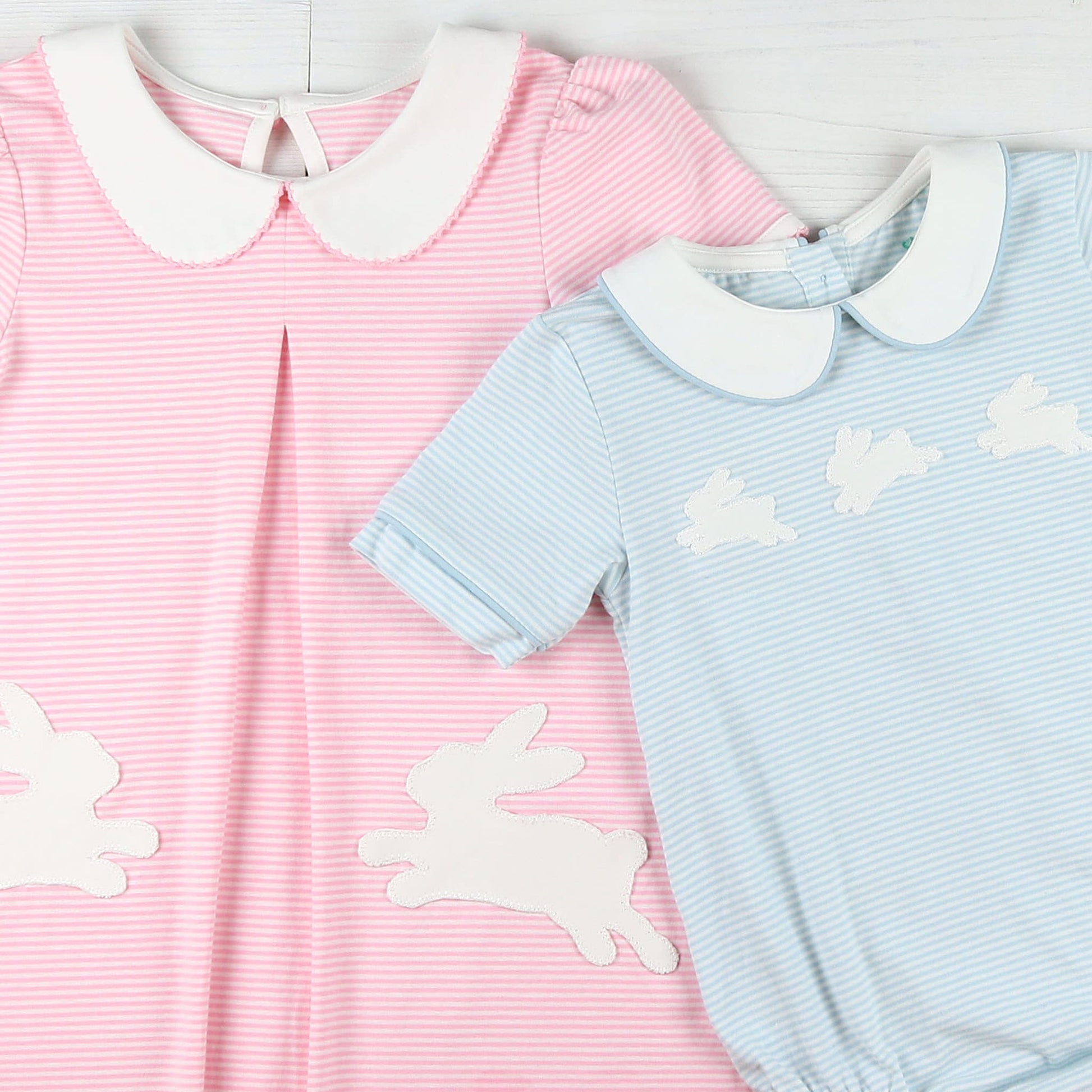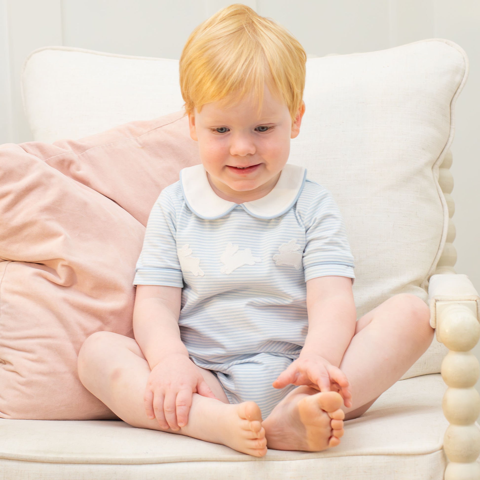 This handsome bubble features a light blue and white striped soft cotton knit fabric with blue piping trimmed short sleeves and a piping trimmed white Peter Pan collar. The three white applique bunnies across the chest, just add to the cuteness!
