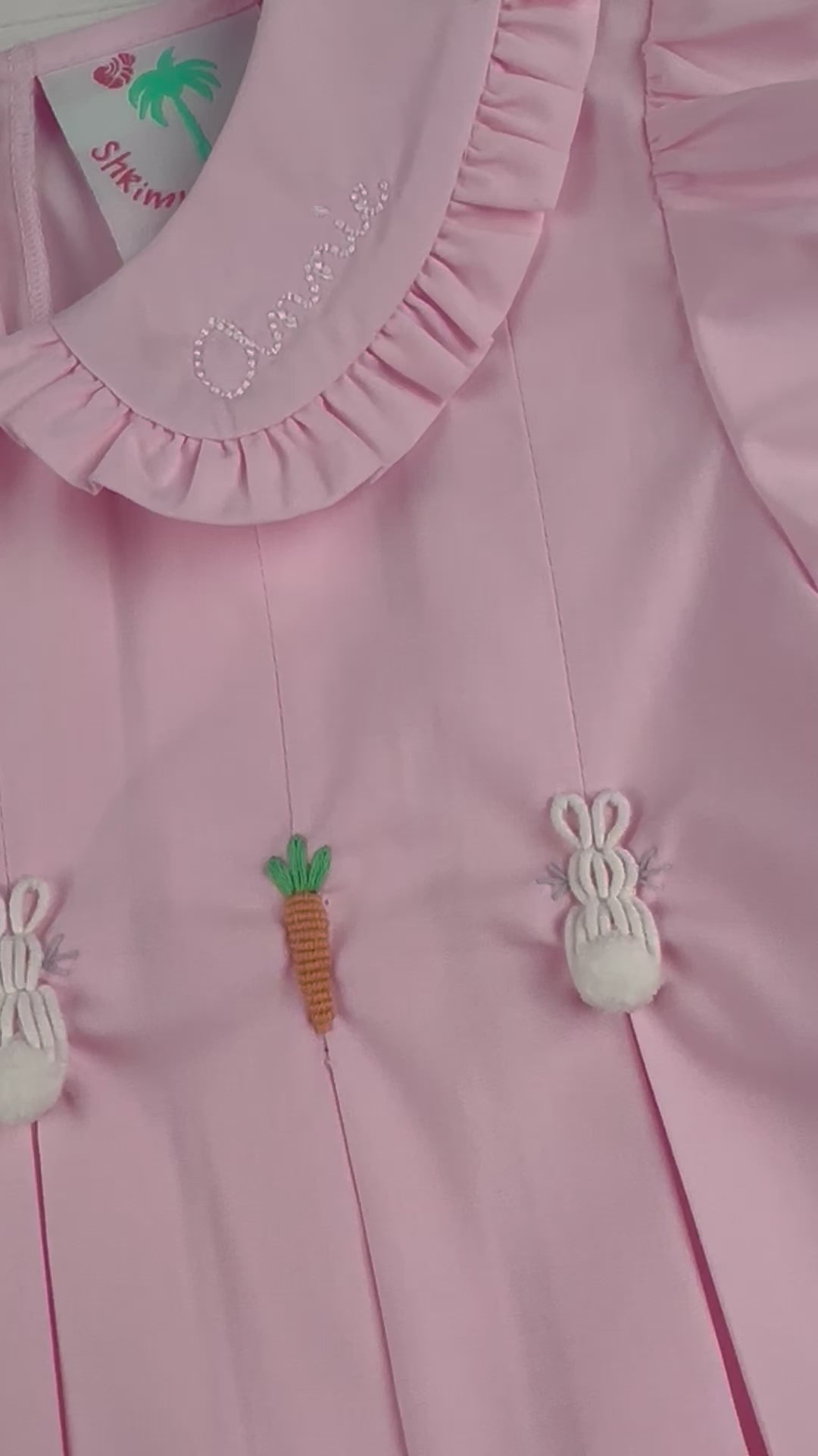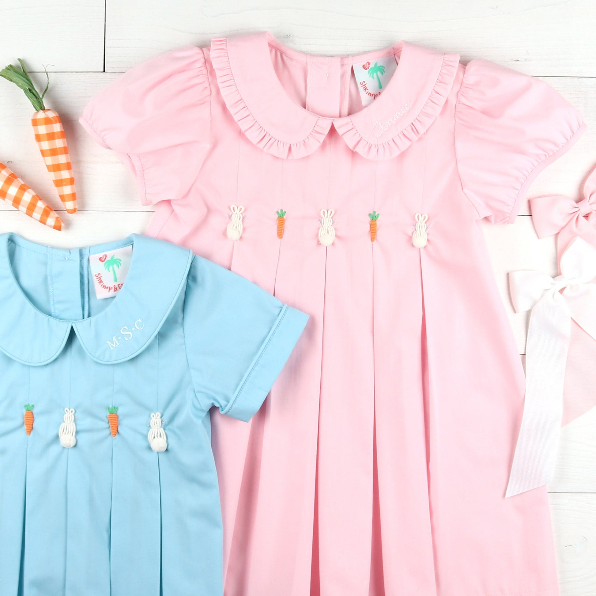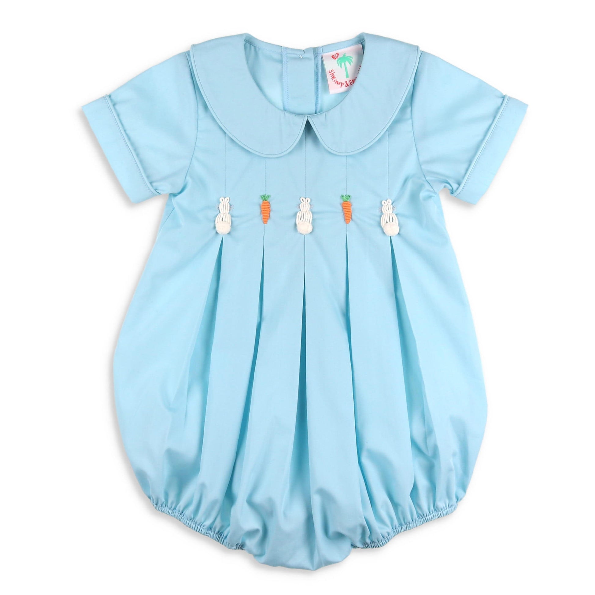 The classic, Easter Bunny Bubble comes in soft Easter egg blue cotton, with custom hand embroidered white bunnies, and orange carrots at the chest. The blue piping around the collar, and the short sleeves, along with the pleating under the bunnies, make it the sweetest Easter outfit for your little boy! Personalize the collar to make it even more special!