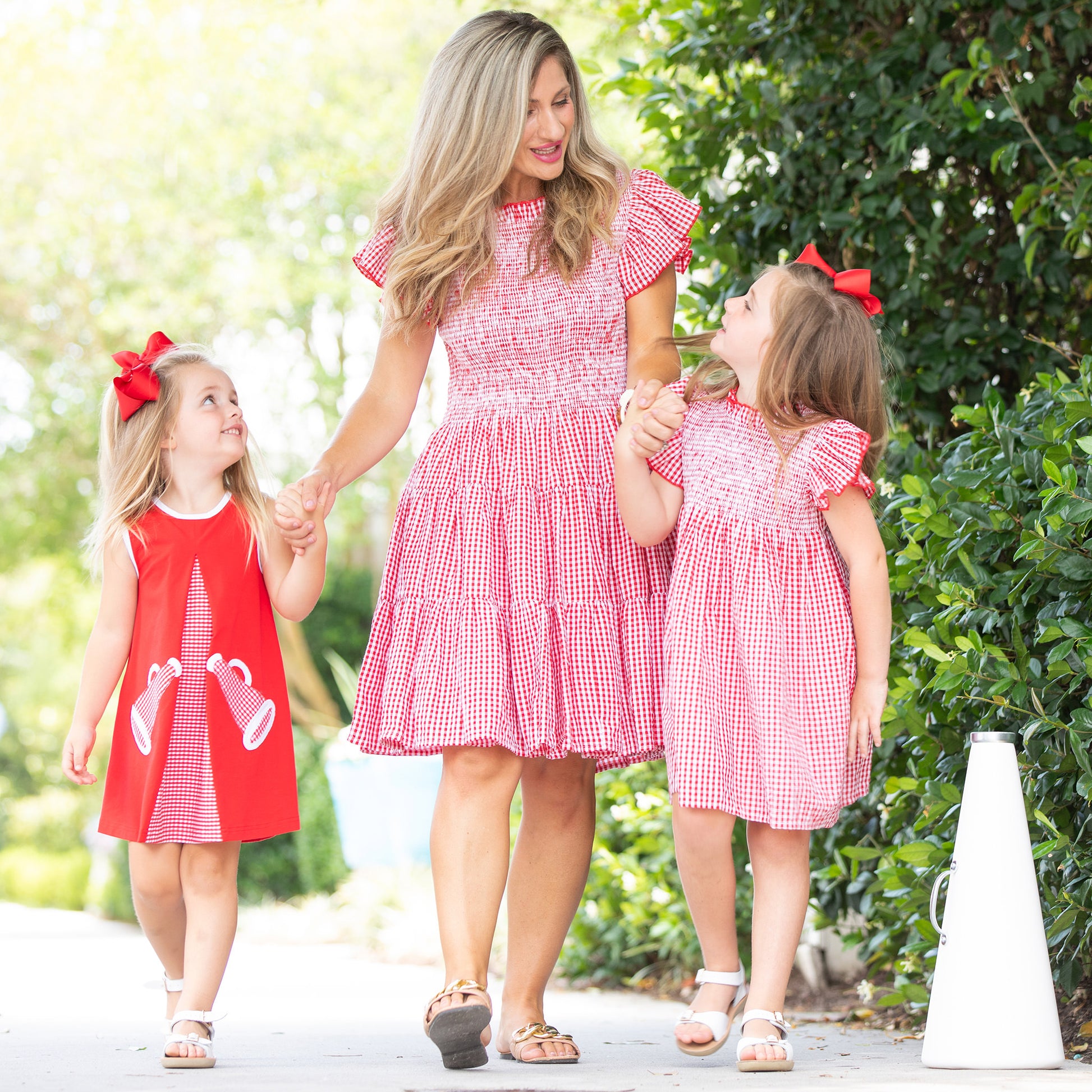 This versatile, wear anytime dress is perfect for an early fall football game, especially if your favorite team sports these colors! And matching with your mini has never been more stylish! Make sure to shop the Gameday Girls Dress-Red Check by Ella Gray for your daughter! And with our Gameday Collection, you can also have coordinating sibling outfits for the perfect photo opp!