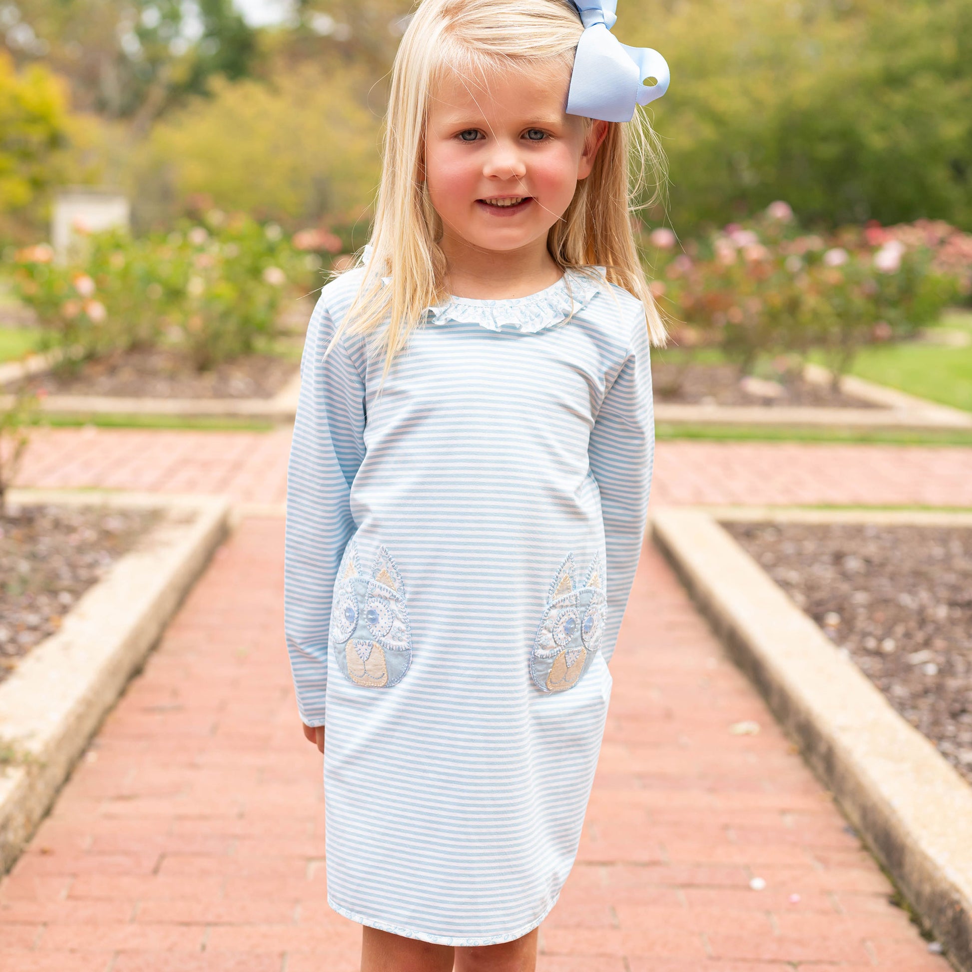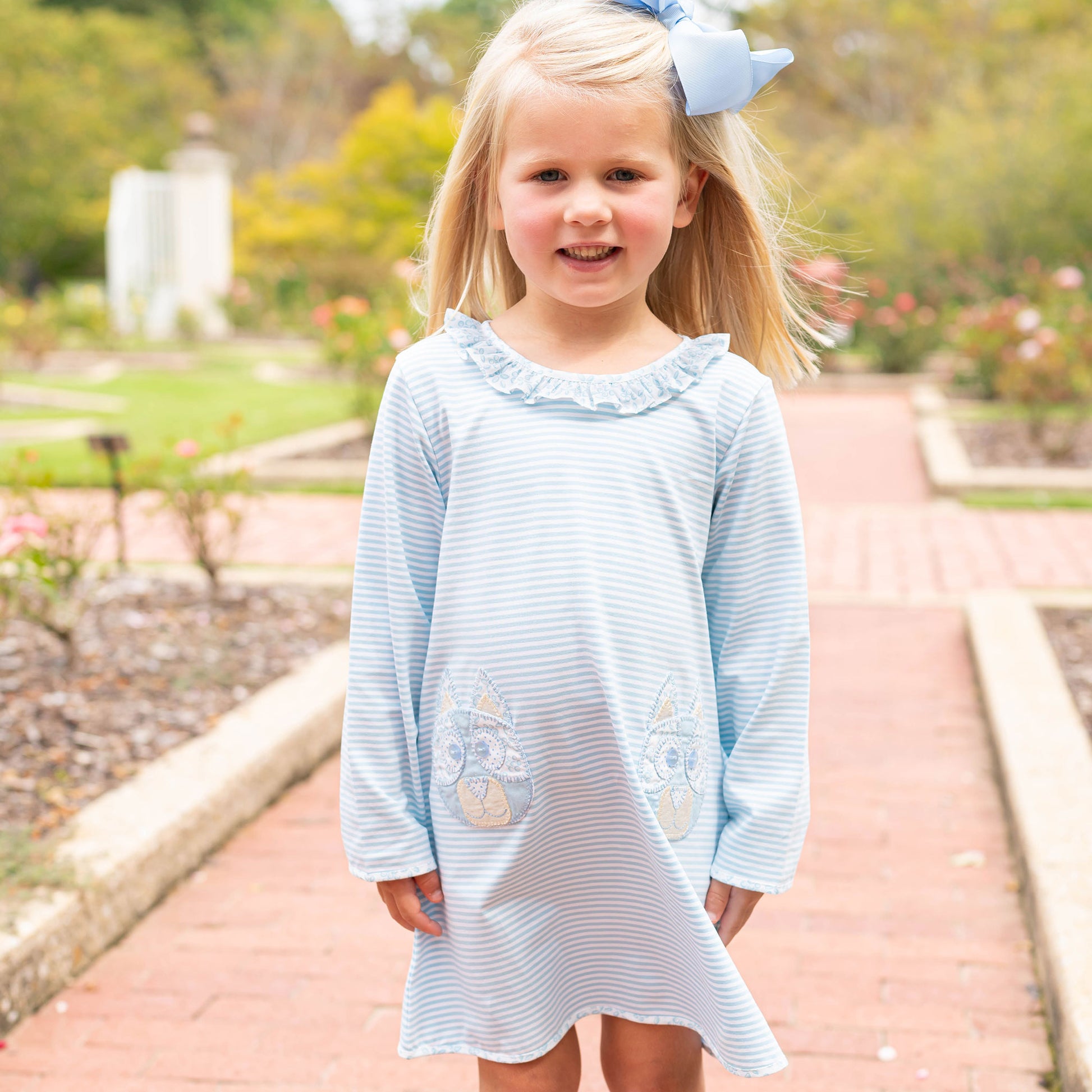 This feminine, easy-to-wear, comfy dress, features a light blue and white stripe cotton knit fabric, a floral print ruffle collar, floral print trim on the long sleeves and at the hem, and two appliqued Blue Healer puppy heads in blue and white, with blue button eyes, front pockets. Such a happy and vintage outfit, and it will surely become one of her favorites!