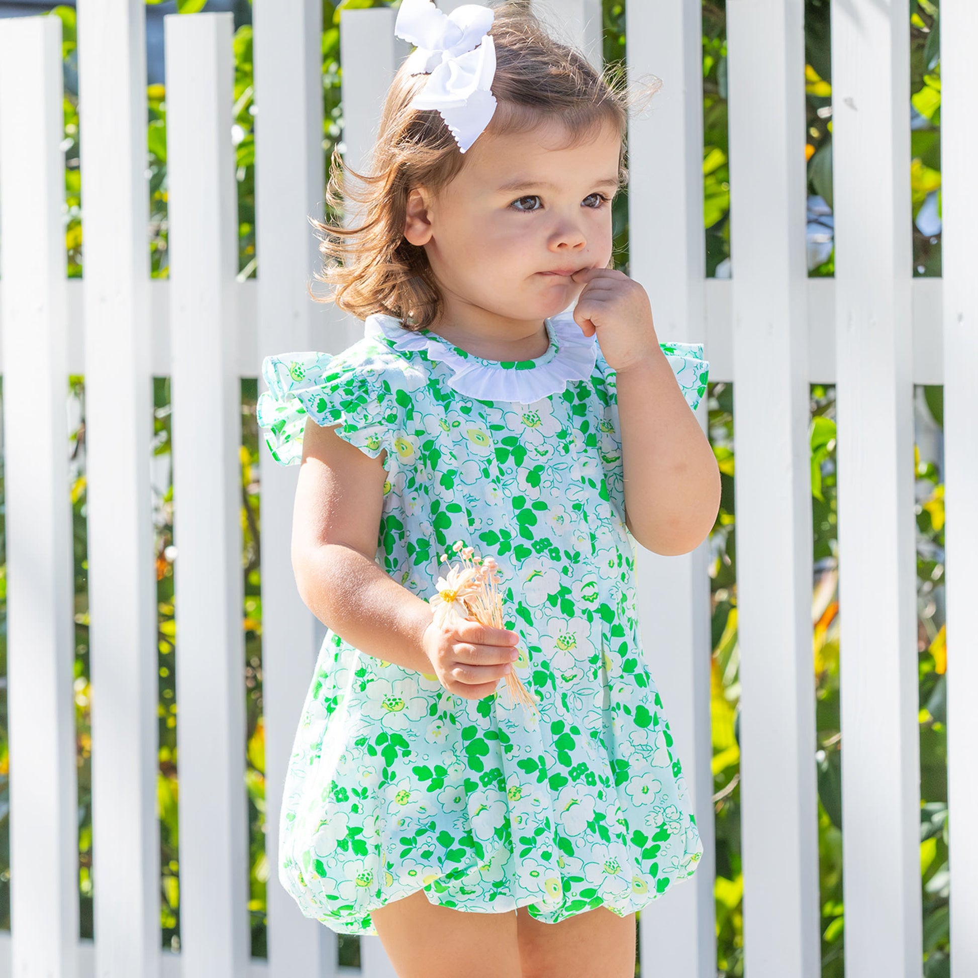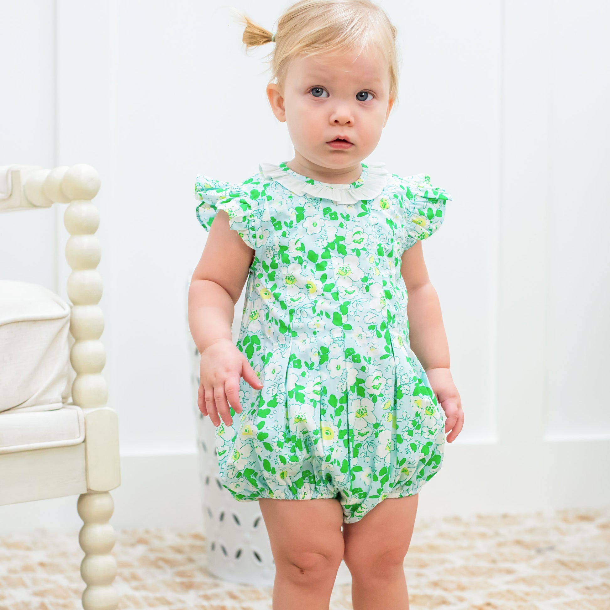 This adorable and feminine little girls bubble, features a delicate floral print in white, yellow and green on sky blue fabric with a white ruffle collar, angel sleeves, and a pleated creating a quaint retro picture! The custom buttons at the back and snaps at the legs, just makes this bubble even more special.