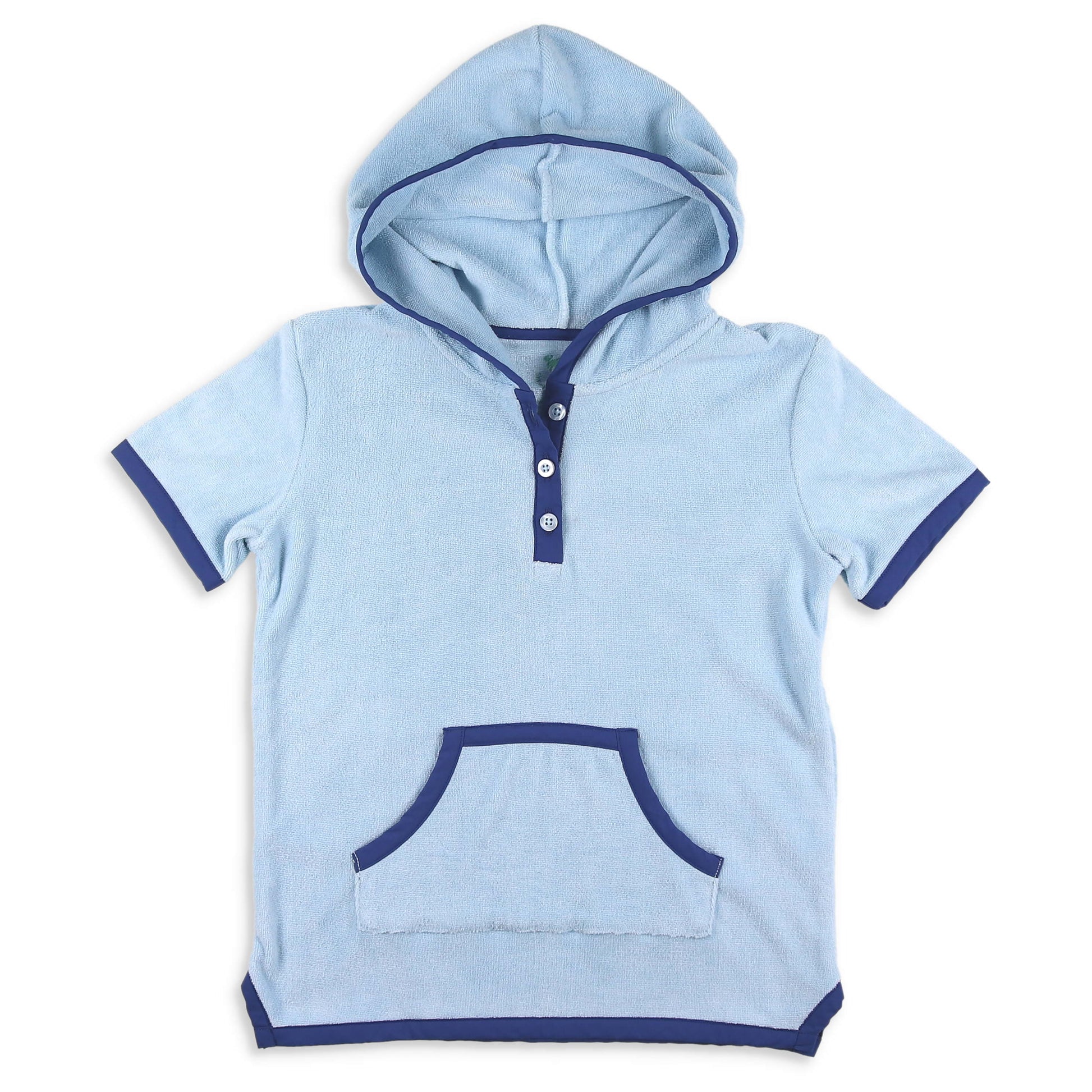 This practical coverup features light blue terry cloth like fabric, navy blue trim along the hood, button tab, the short sleeves, the front pocket, and the hem. It's the perfect weight for those windy ocean breezes, especially when getting out of the water!