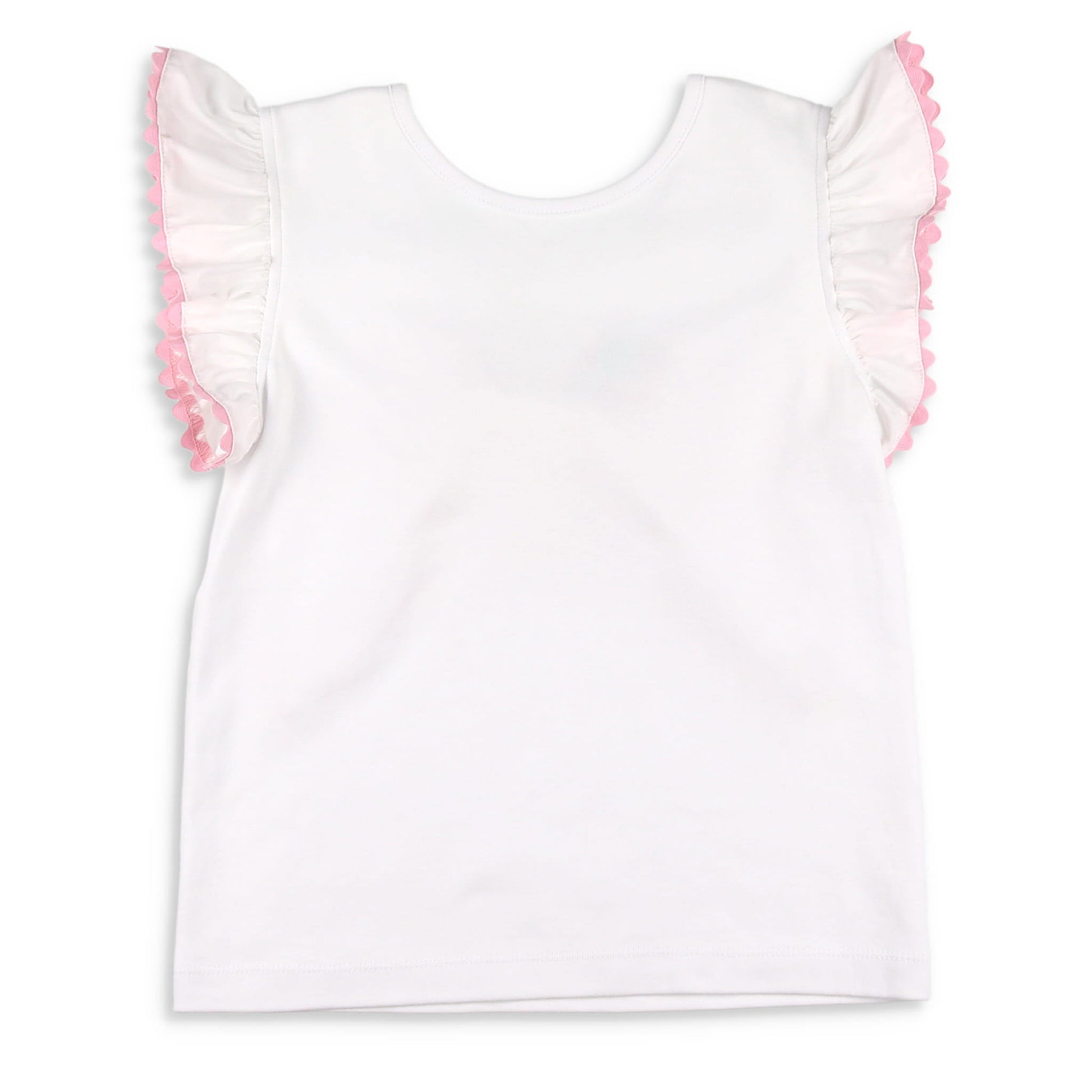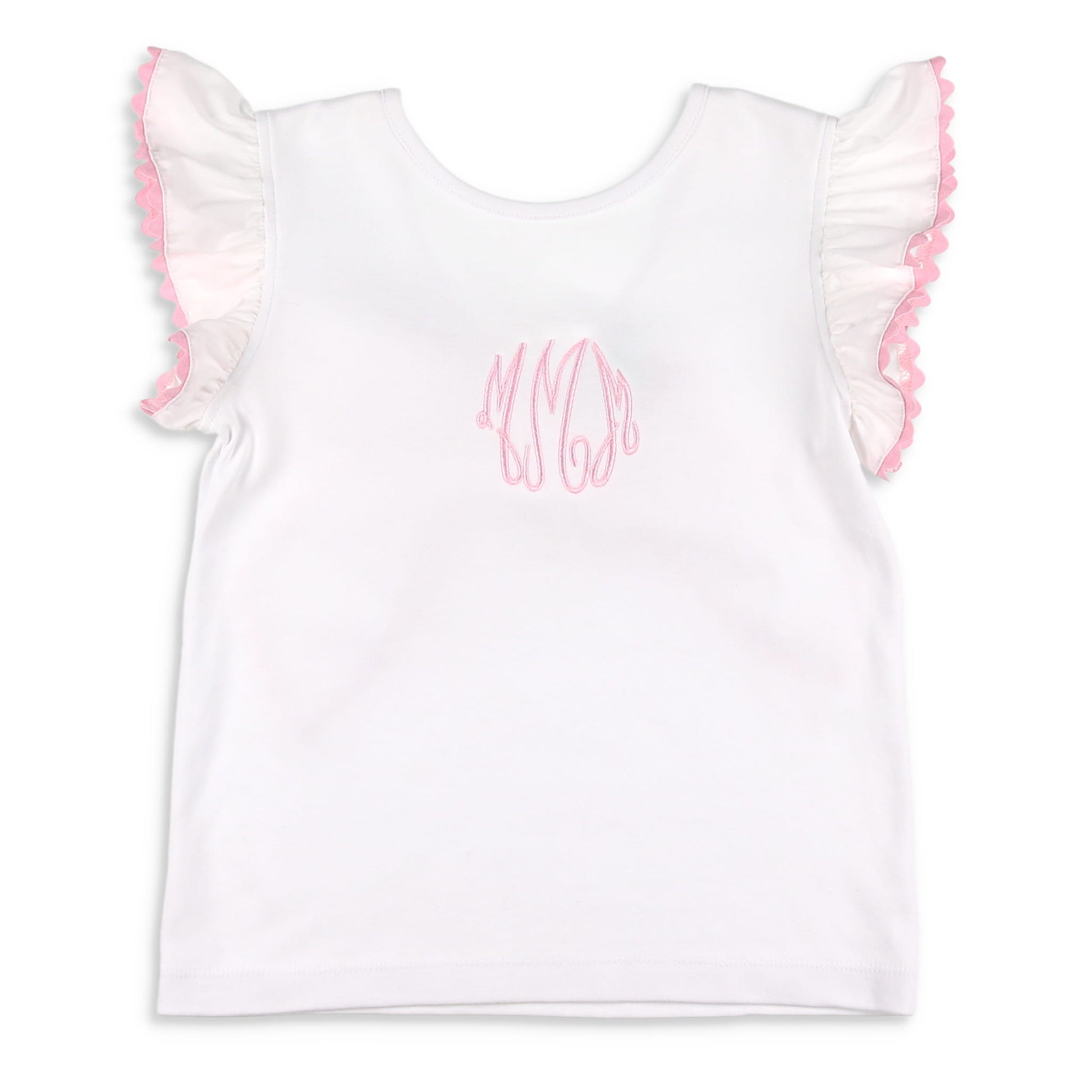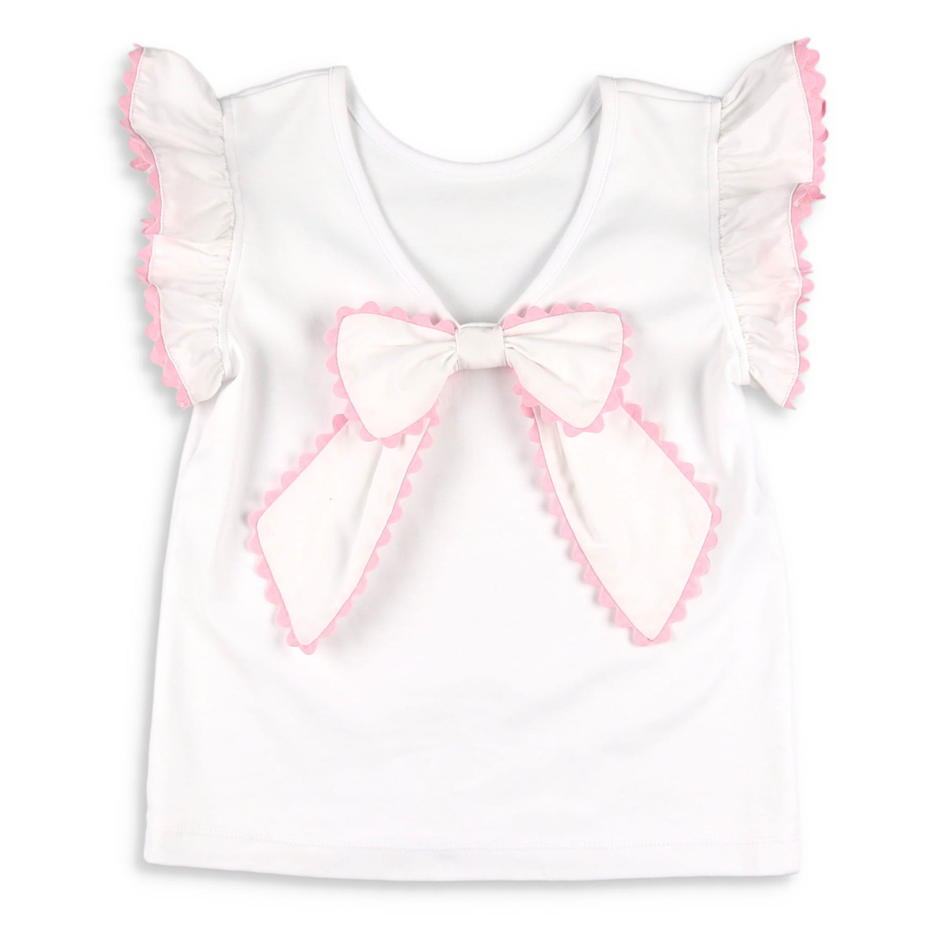 This adorable top features a white cotton knit fabric, and pink ric rac trimming the ruffle angle sleeves and the large bow in the back.ย Pair it with our Girls Smocked Mae Skirt-Lemonade or Tea Rose for a happy vintage feel!
