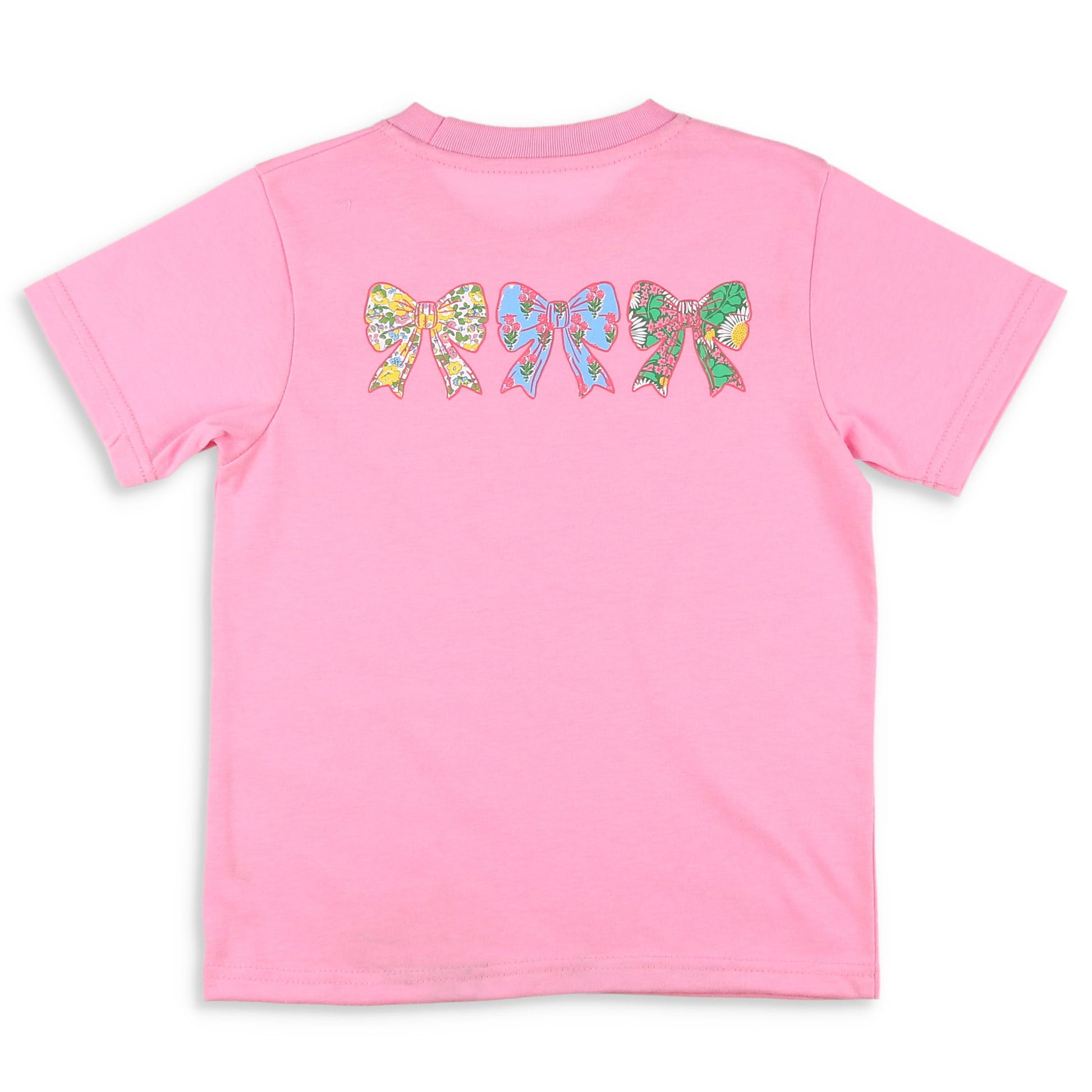 This comfy cotton fabric, girls graphic tee is a versatile pink short-sleeve shirt featuring a sweet back graphic with three large floral bows. The front has one smaller graphic bow and the words "Shrimp and Grits" on the left chest.