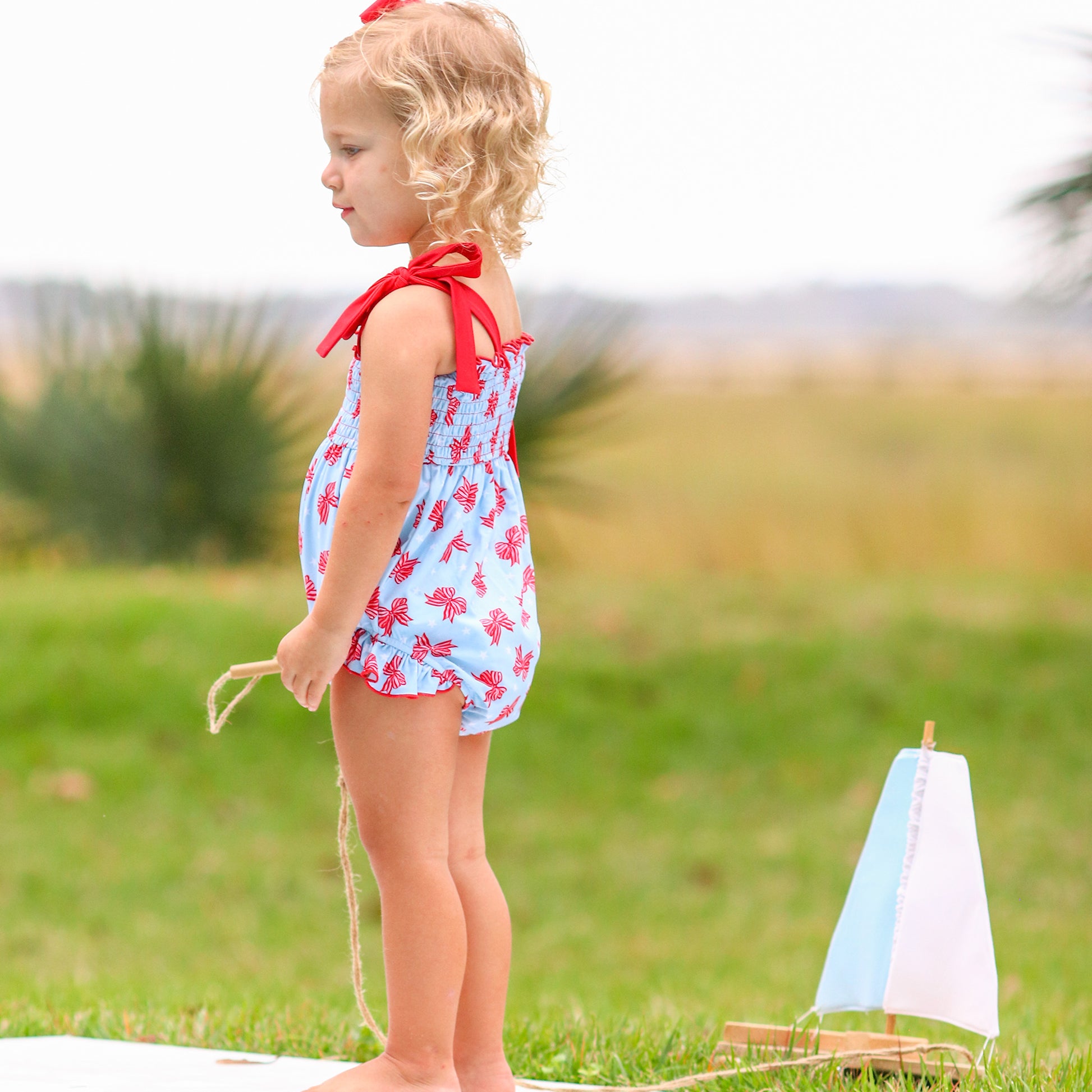 This festive one piece swimsuit features red bows printed on blue and white polka dot fabric, red shoulder ties, red serge leg ruffles, and a custom smocked top, all creating a darling vintage look! This bathing suit will have your daughter looking so cute, while staying comfortable at the pool or beach during these spring and summer seasons.