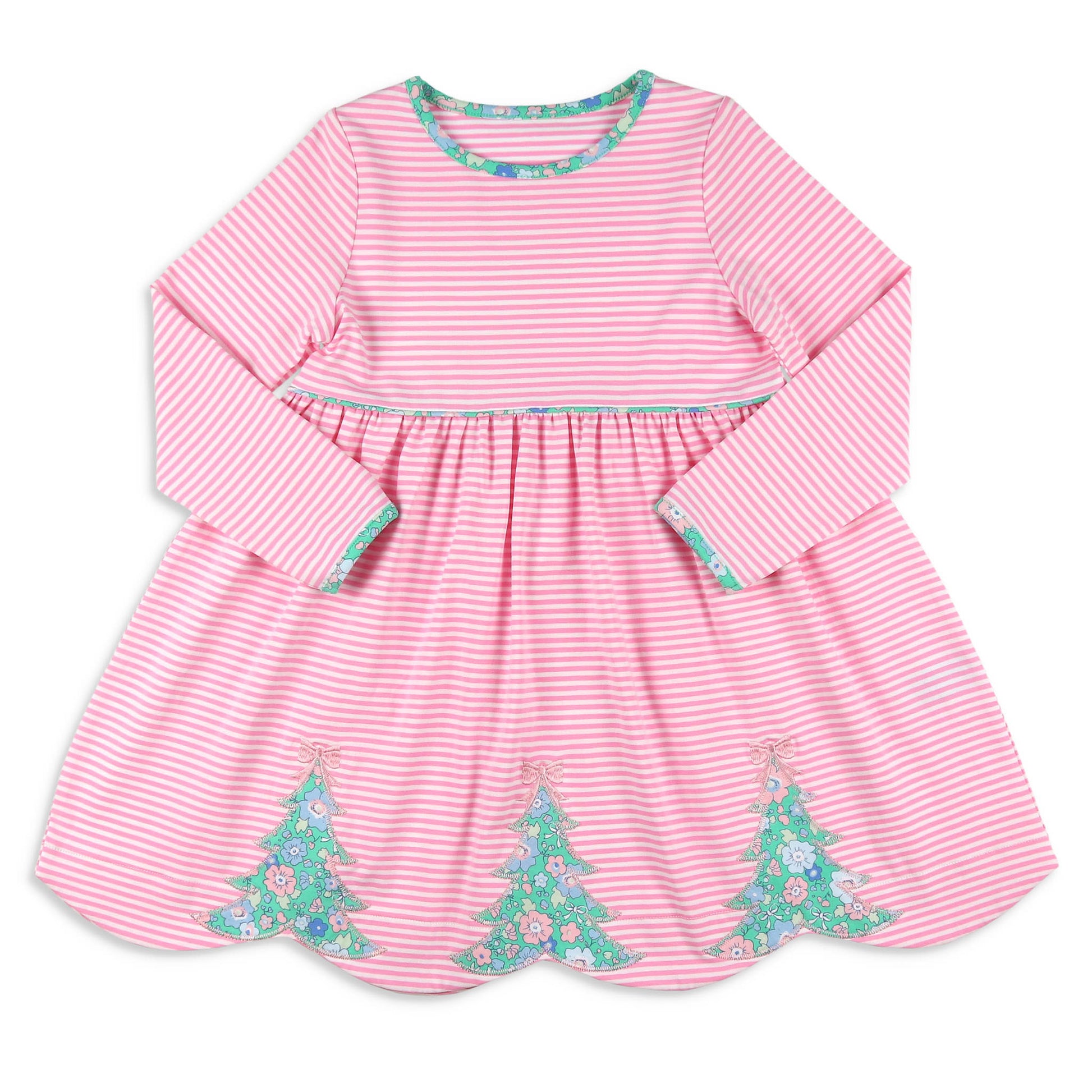 This feminine festive dress features a soft fabric in pink and white stripe, a floral trimmed neckline, trimmed long sleeves, and floral piping across the waist. The scalloped hemline with three floral applique Christmas trees just makes this a truly special outfit.