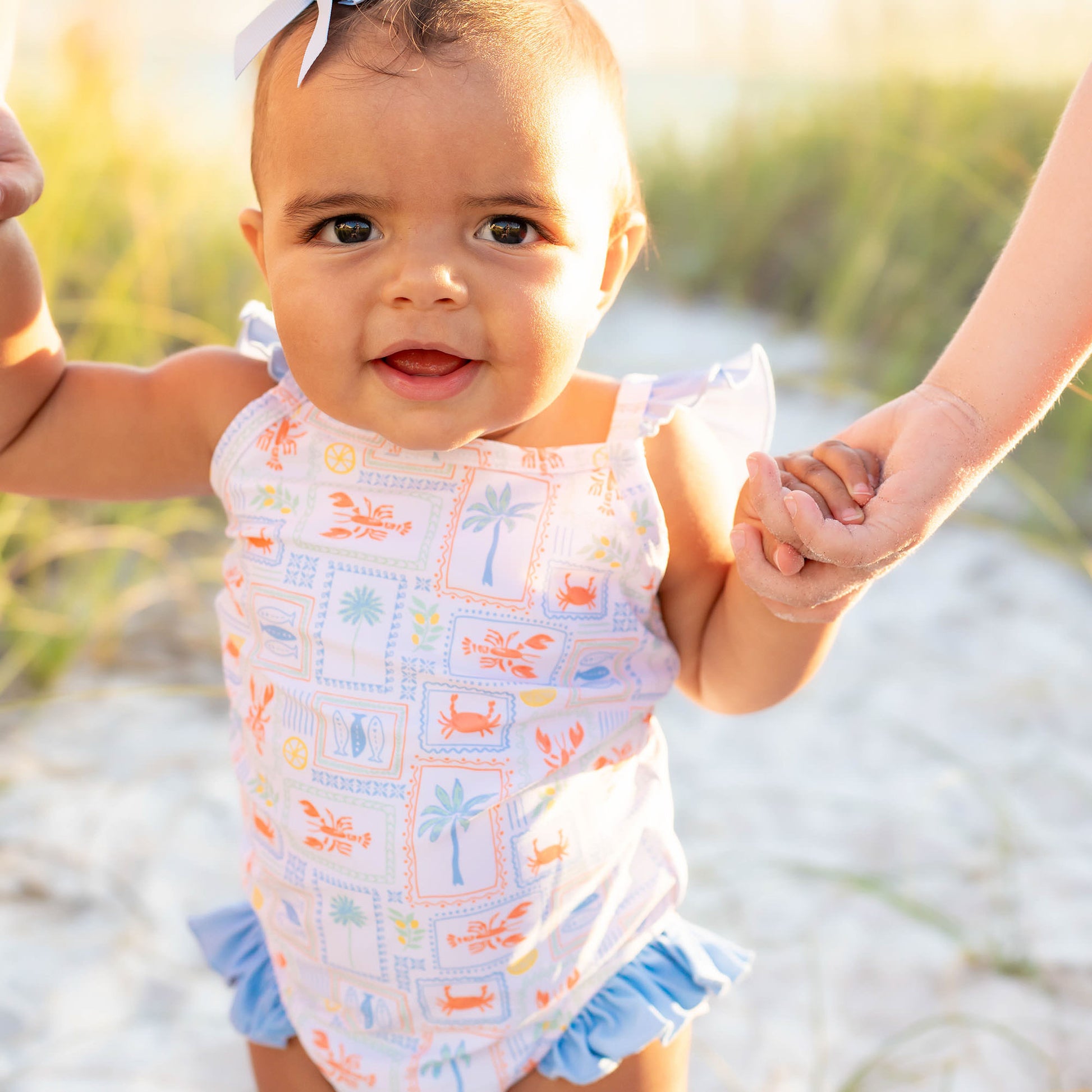 What a sweet addition to her baby swimsuit, toddler bathing suit, or girls beach wardrobe and it's perfect for pool and ocean fun all spring and summer long! And with our Coastal Crab and Coastal Cove Collections, the matching sibling outfits will make a great photo opp! Ready for that beach vaca!