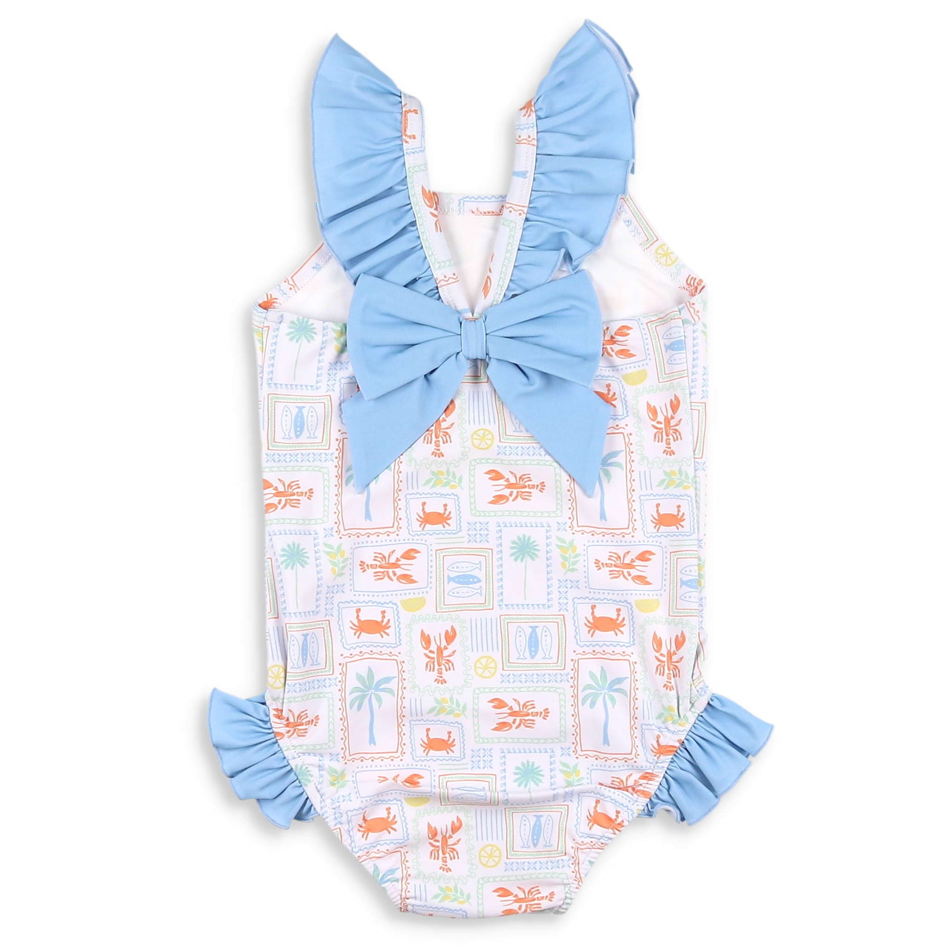 This whimsical one piece girls swimsuit, lined, features a colorful sea life and foliage print on white, with blue serged ruffle trim at the shoulders and neckline, a V ending in a blue bow at the back, and serged blue leg ruffles,