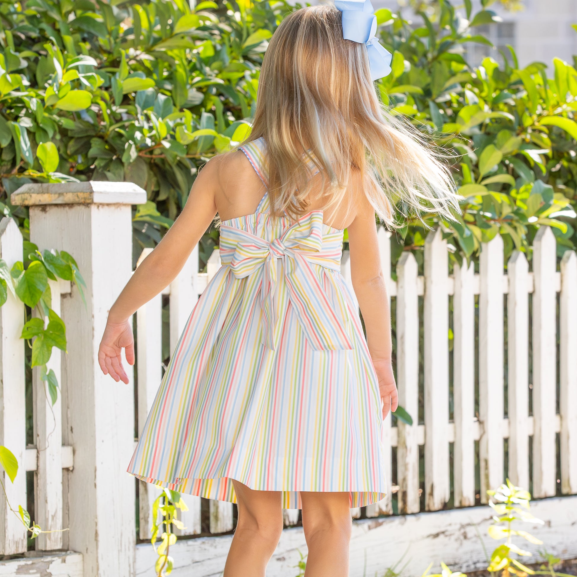 This easy-to-wear, girls sundress, or girls toddler sundress, features pastel striped cotton blend fabric, blue and white diagonal striped piping accent, blue and white gingham checked crab appliques for front pockets, yellow and white micro checked crab claws, and custom button eyes. The beloved twirl skirt and the large tie in the back give this sundress a sweet vintage feel!