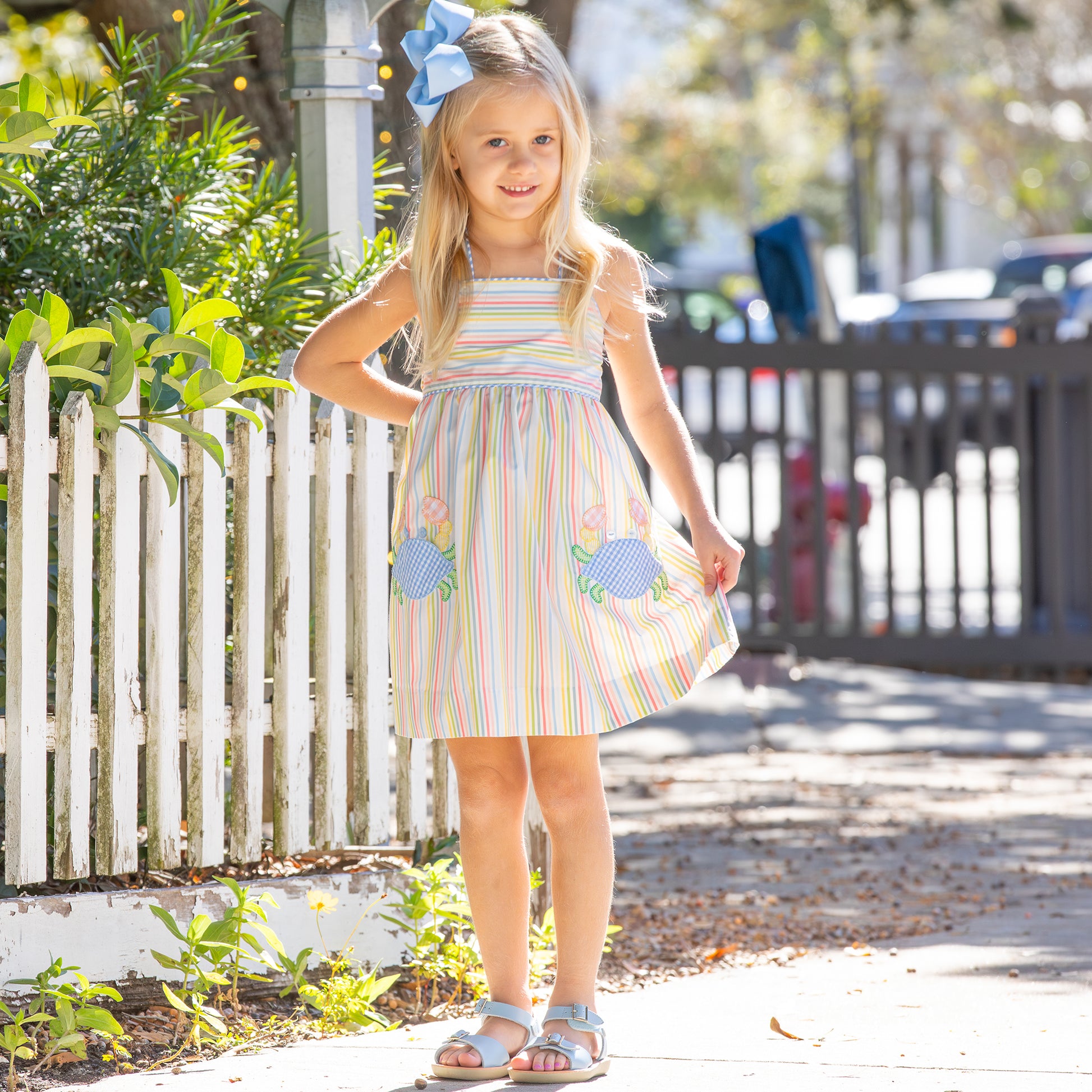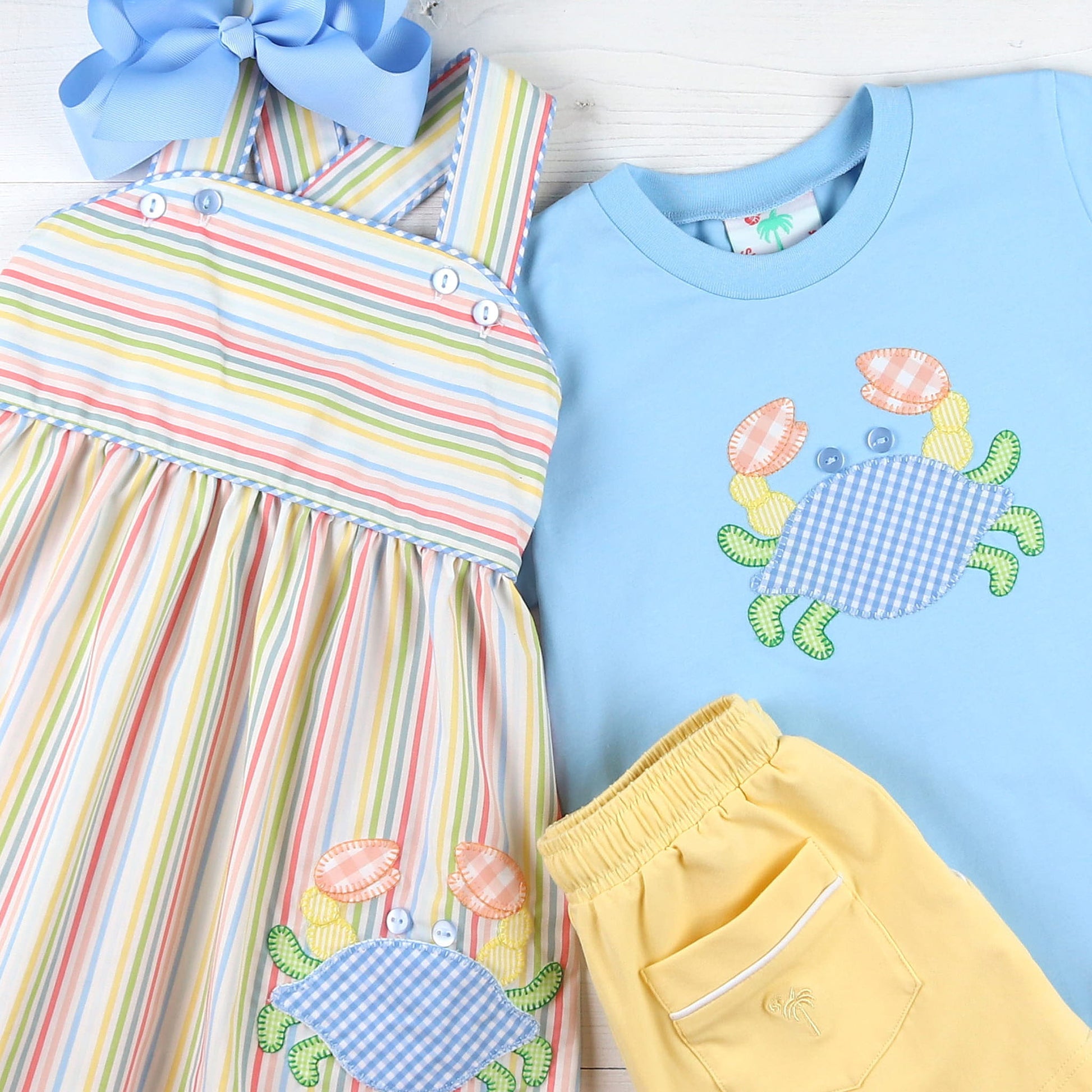 Her favorite beach memories with begin with this girls summer dress, the Coastal Crab Dress, by Shrimp and Grits Kids, and a trip to the crabbing dock!