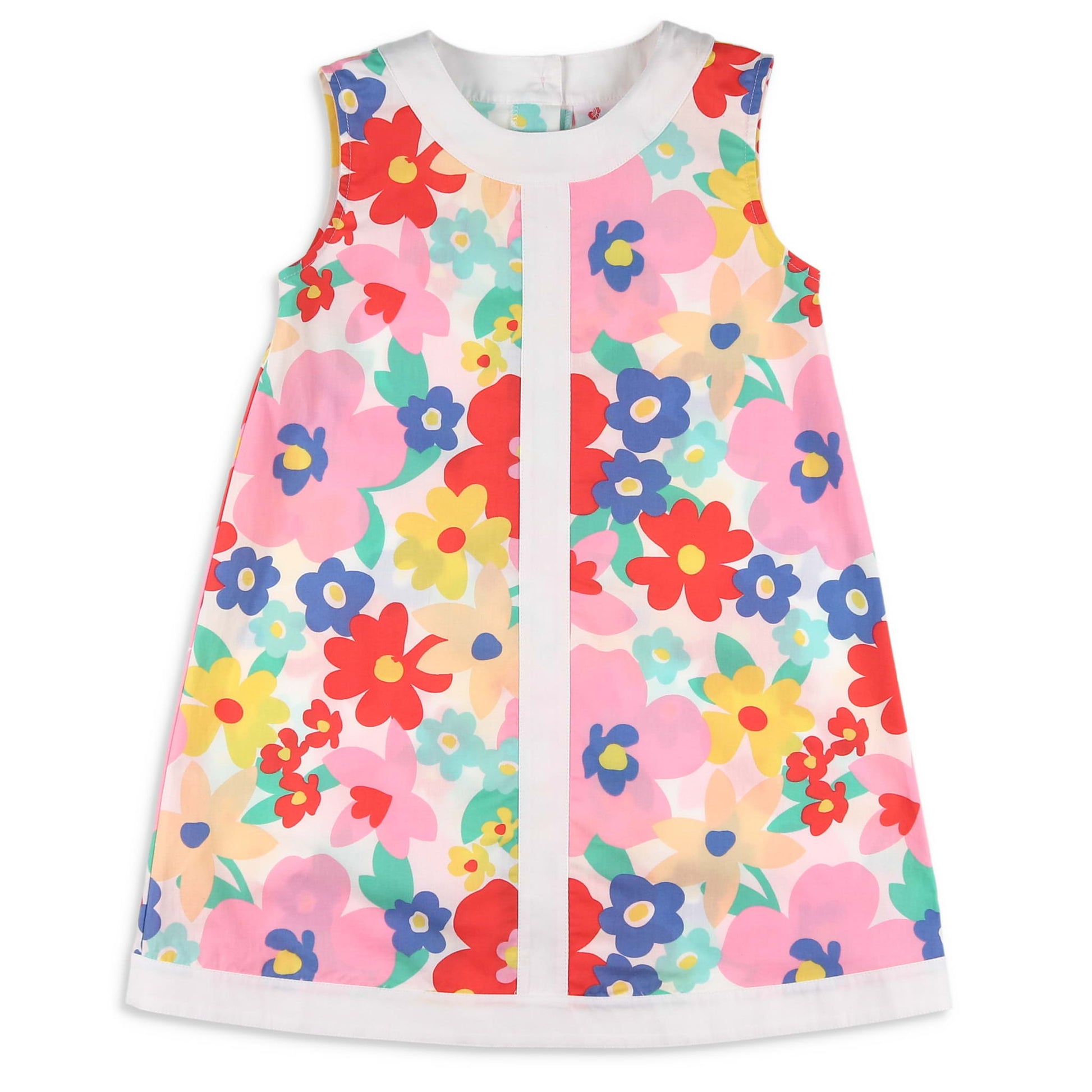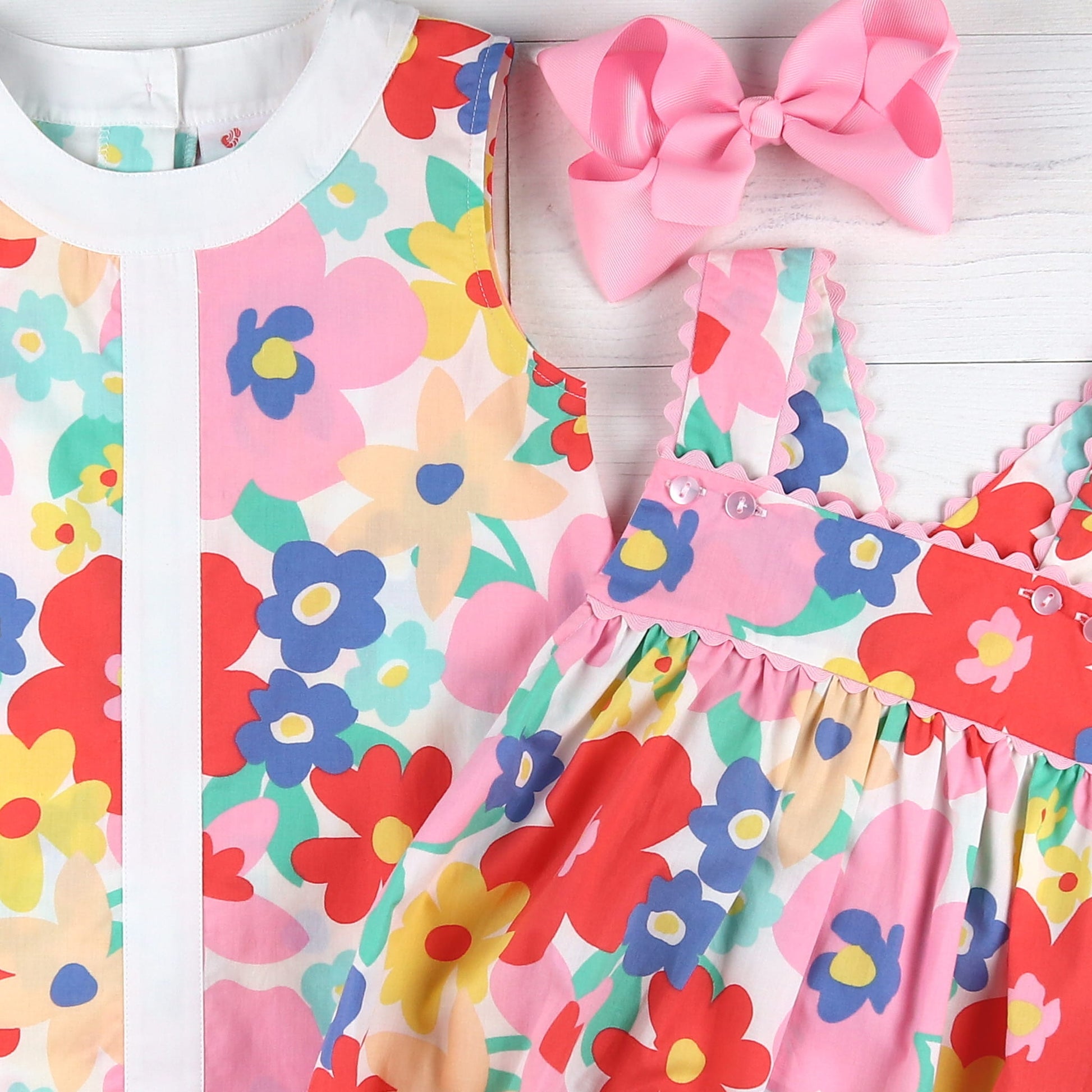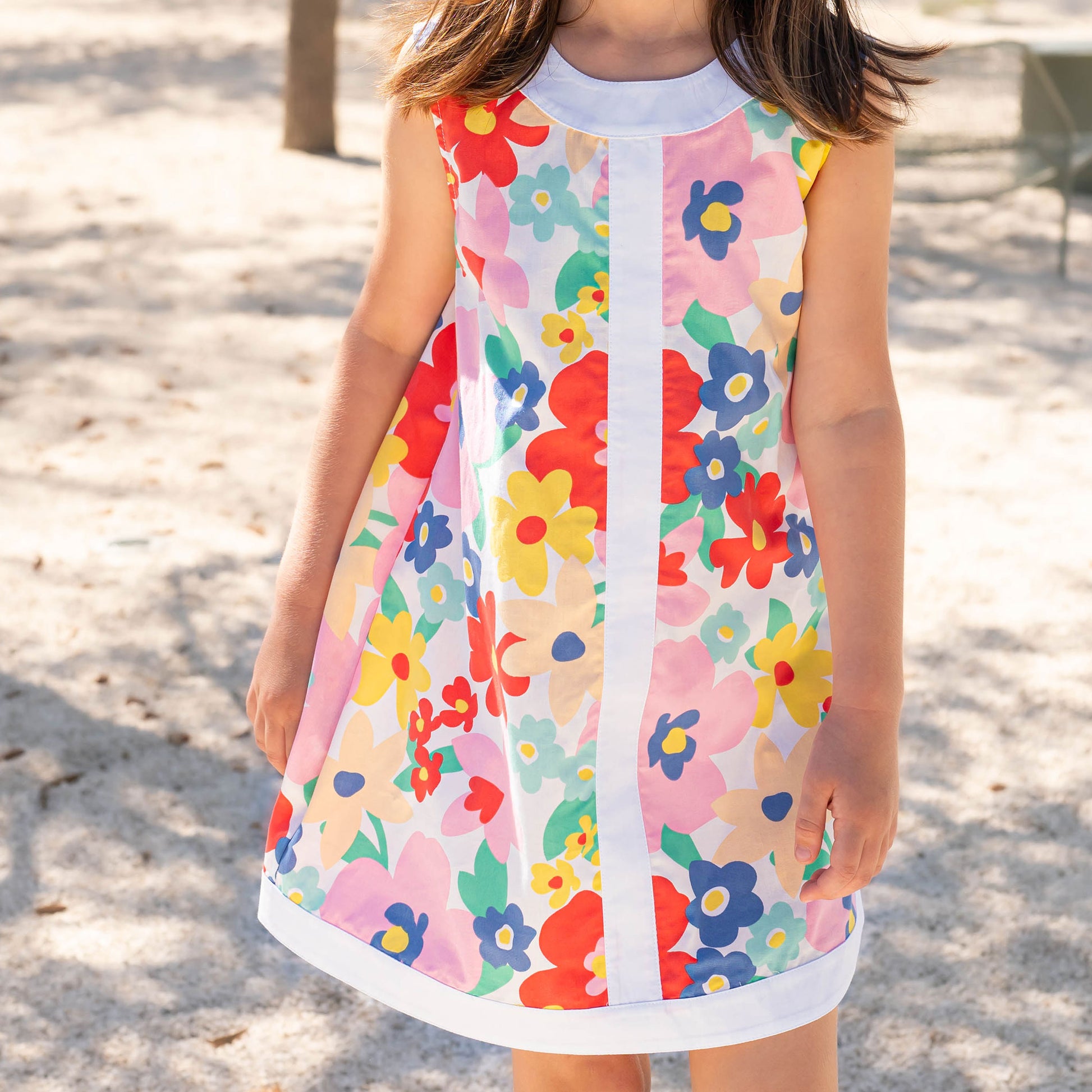 This sweet, vintage style, sleeveless dress features a bright floral print on white poplin fabric with wide white trim on the neckline, hem, and down the front, along with custom buttons at the back, making this dress as fun as it is cute!