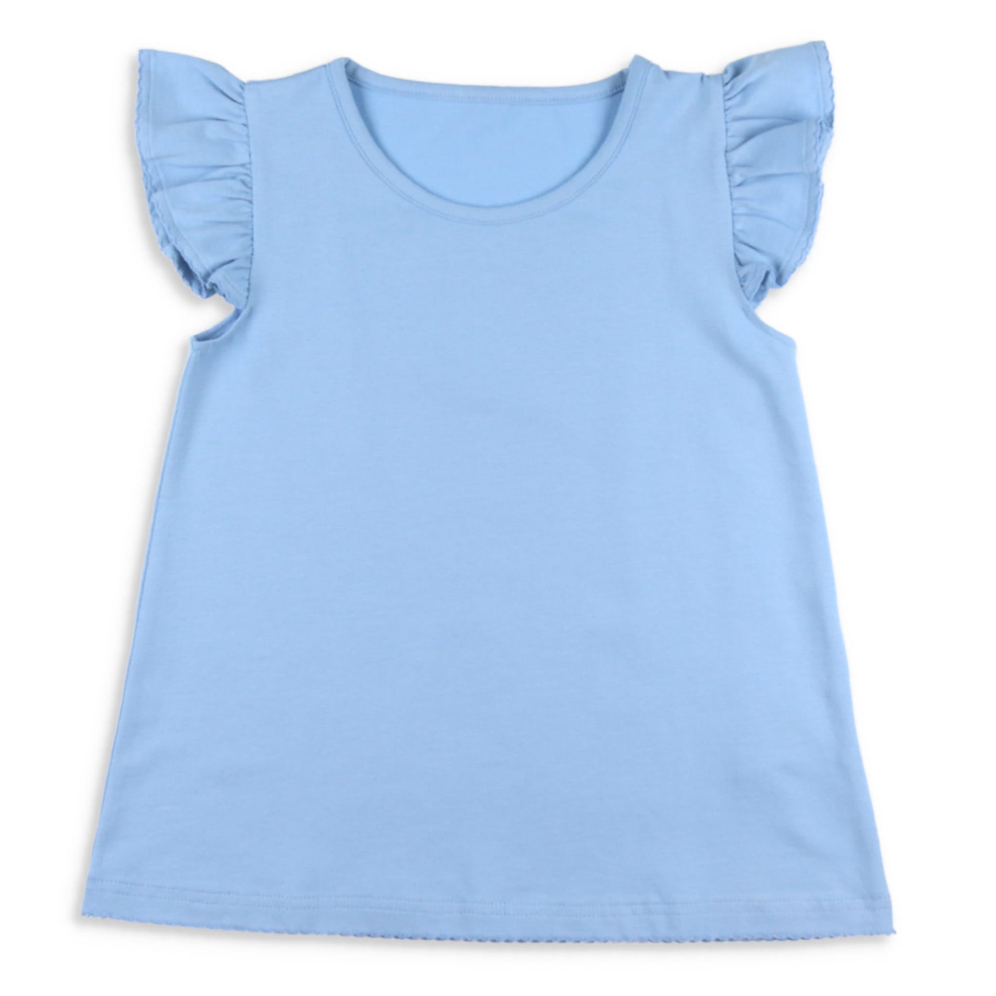 Featuring a soft cotton ocean blue knit, blue picot trimmed flutter angel sleeves, and a picot trimmed hem makes it perfect for pairing with shorts, skorts, skirts, or pants.