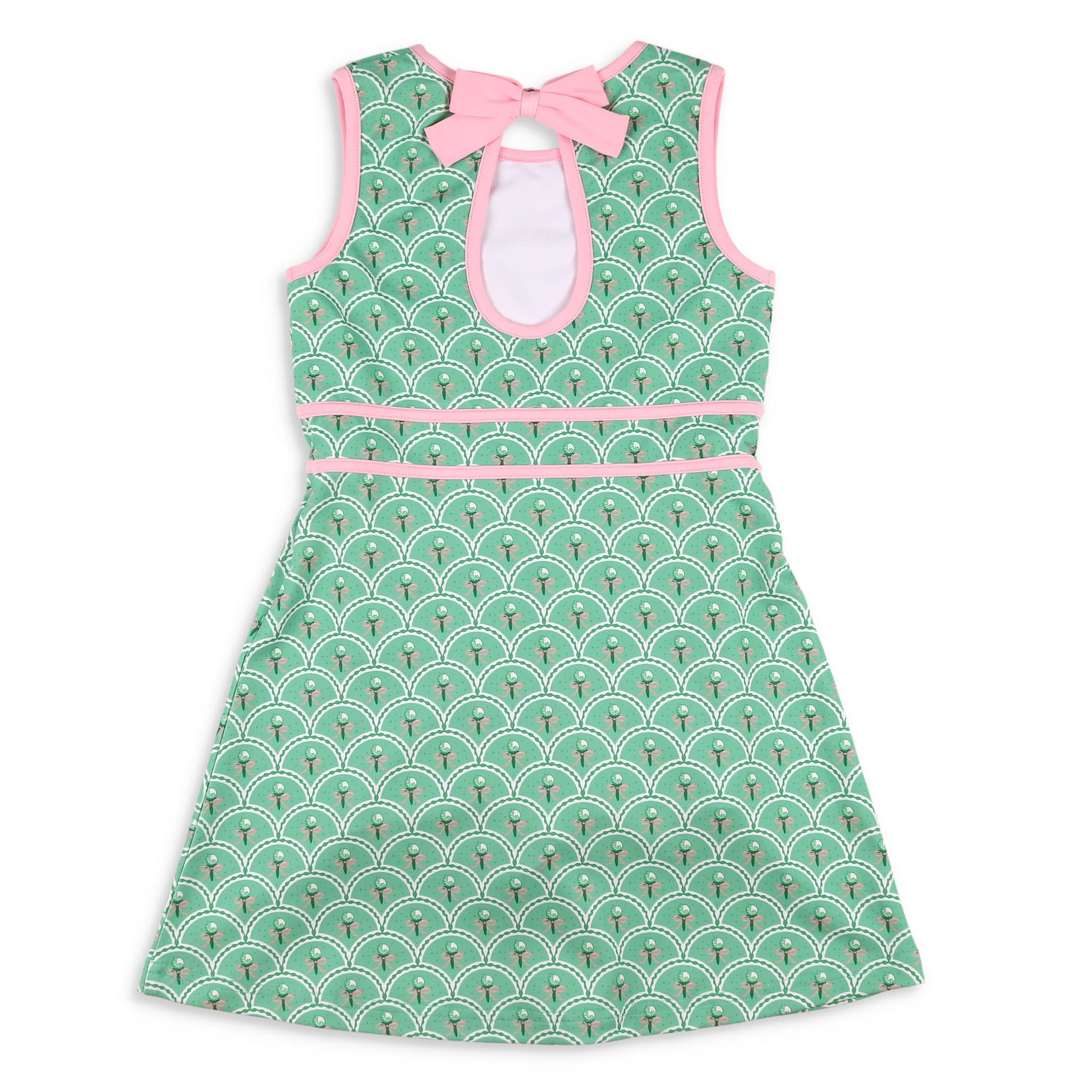 Featuring a green, white, and pink golf tee and golf ball print on green cool performance fabric, pink trim around the arms, the neckline, and the keyhole back, makes it perfect for any activity.ย The accent pink trim at the waist and the front pleat just add to the cuteness of this girls or tween summer dress!