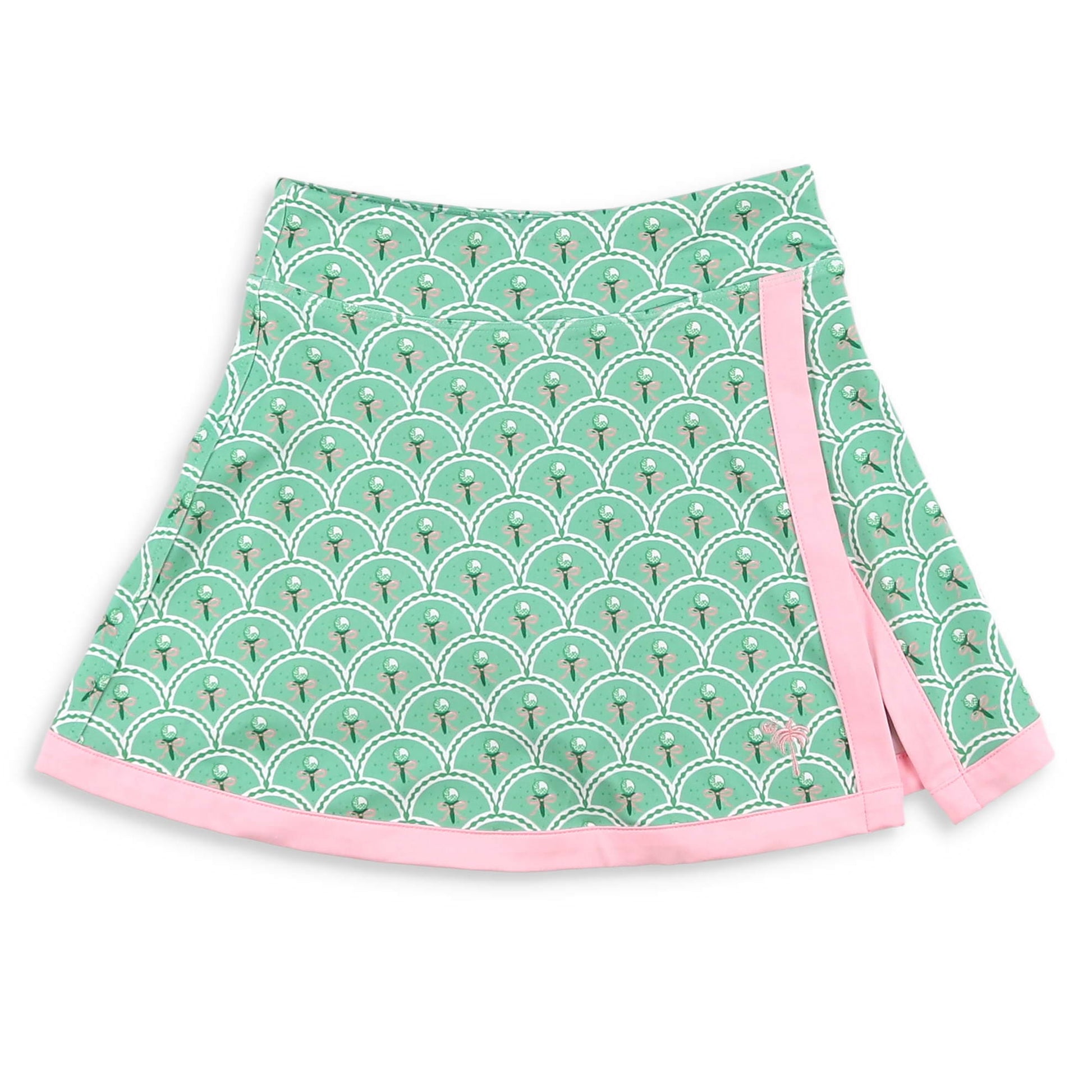 This classic and practical Skort features a golf tee and golf ball print on green cool performance fabric, matching under skort shorts, pink trim on the front flap and the hem, a wide lined waist, and it's nice and stretchy, making this the most comfy summer outfit around! It brings girls shorts to a new level!