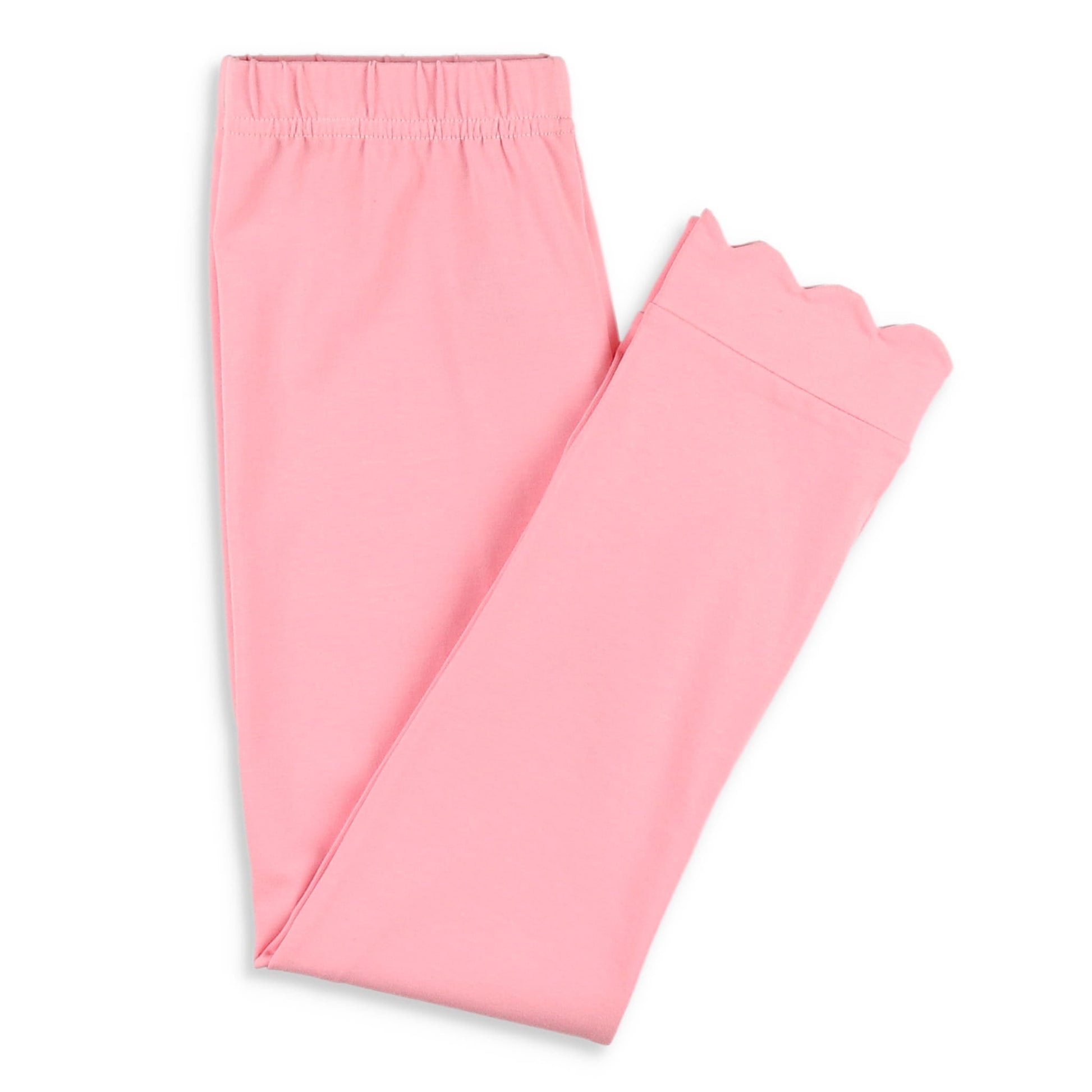 These easy-to-wear, comfortable elastic waist leggings, feature soft, cotton knit fabric in a versatile soft pink, with flared legs for bigger girls (L-14) legs or scalloped hem legs for little girls (XXS-M).