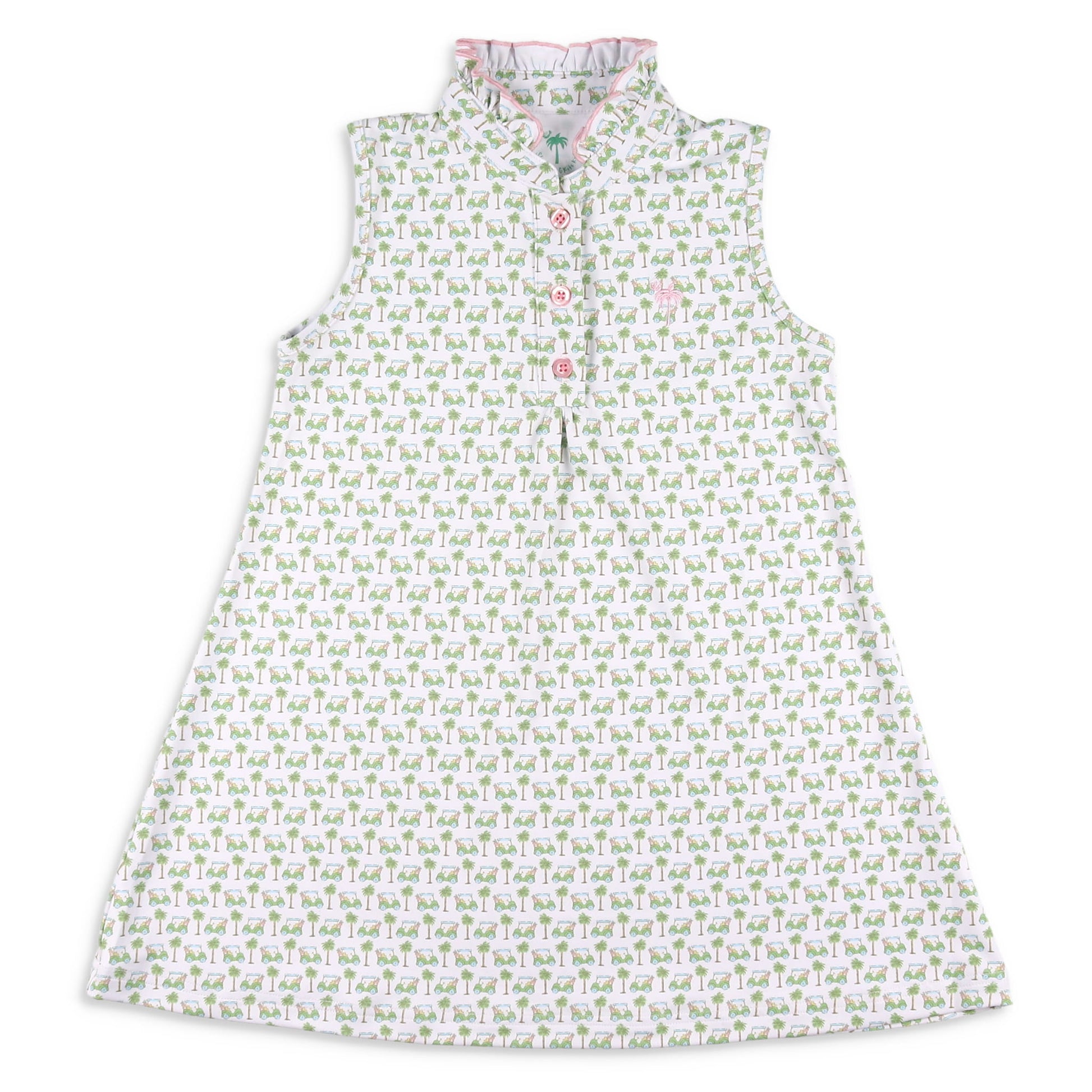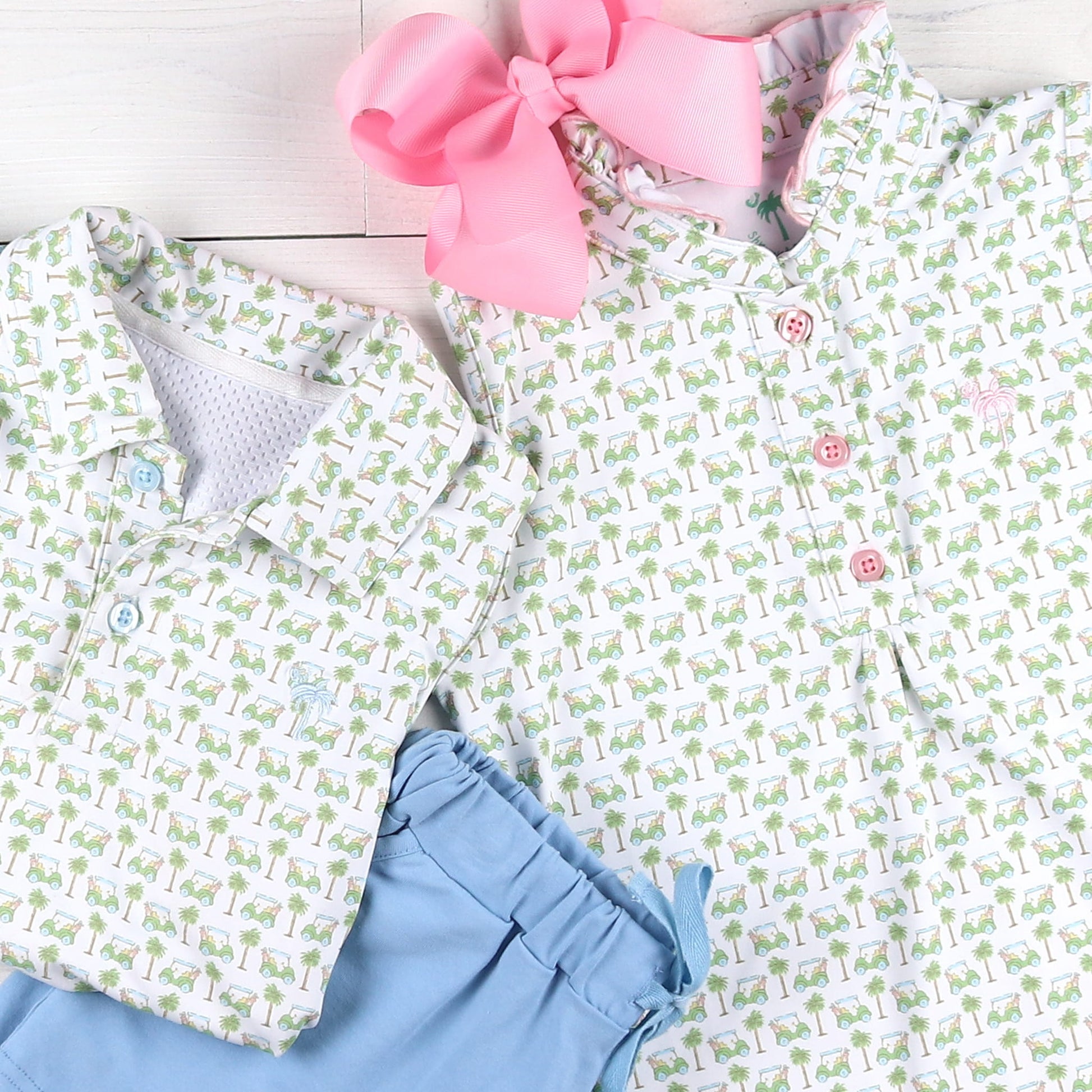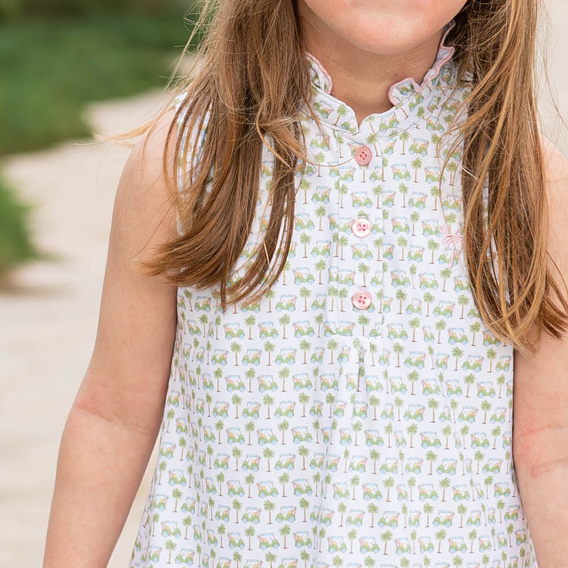 Featuring a green golf cart and palm tree print on white, a front pink palmetto tree and shrimp logo, three custom pink front buttons, and a darling pink serge trim ruffle collar, makes it perfect for any activity.
