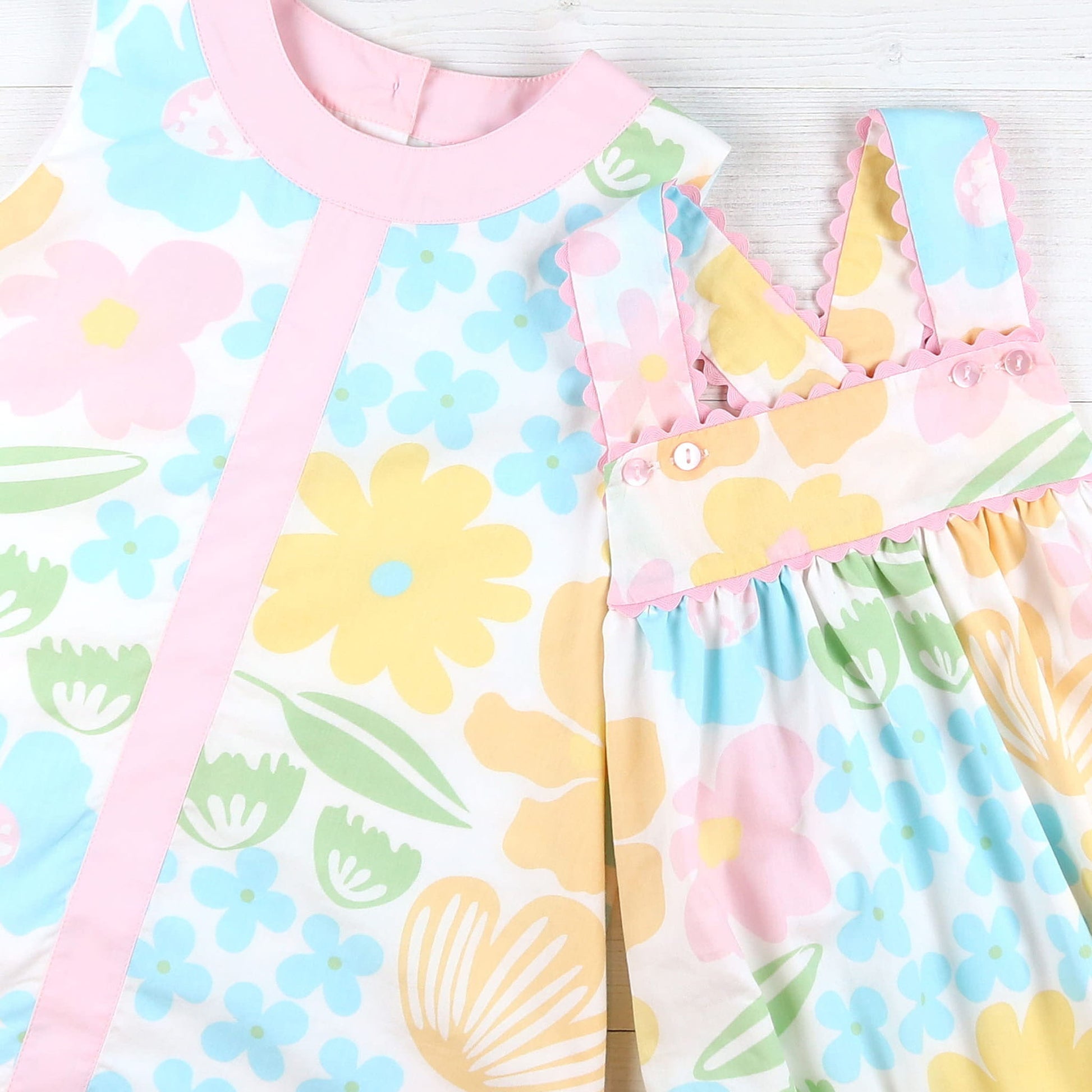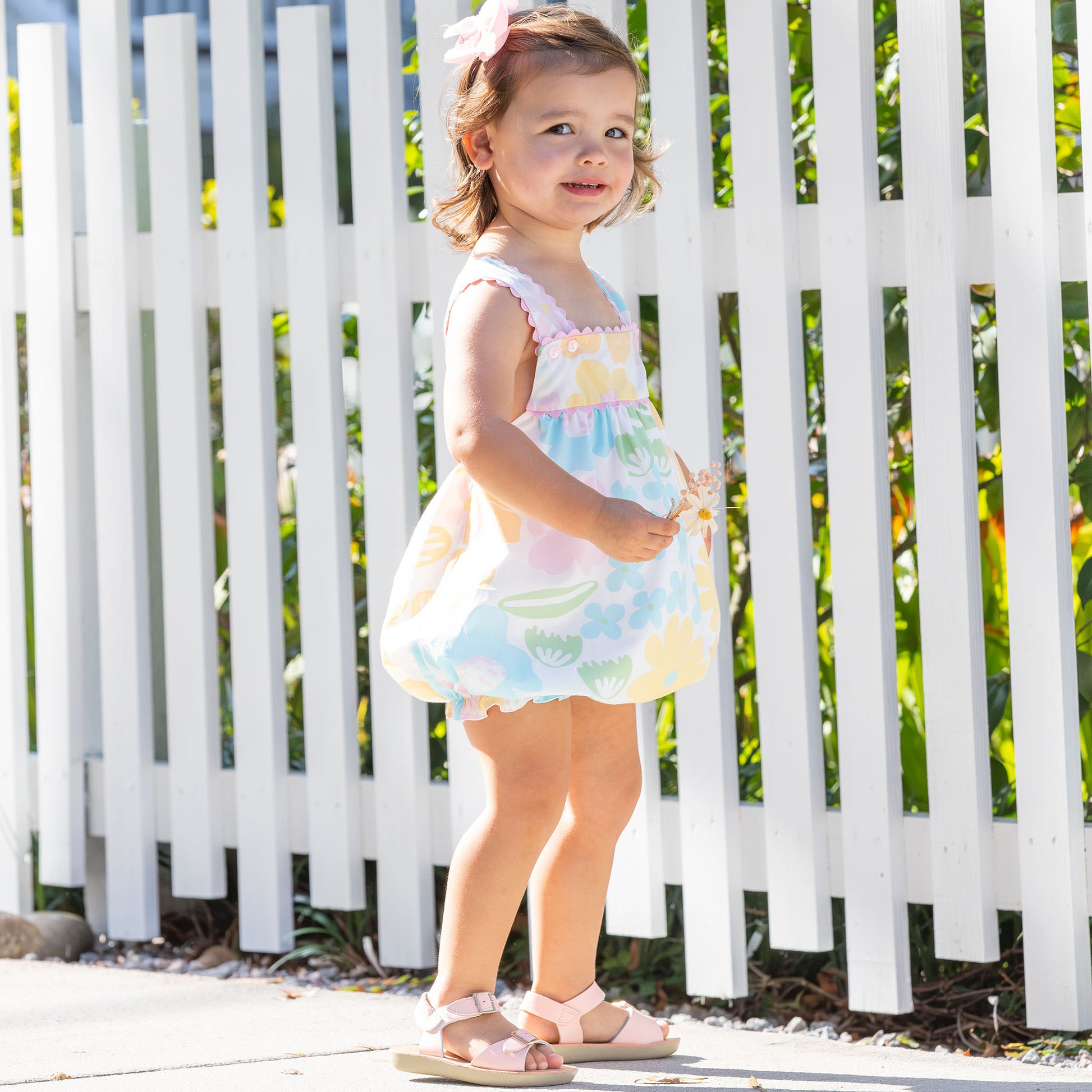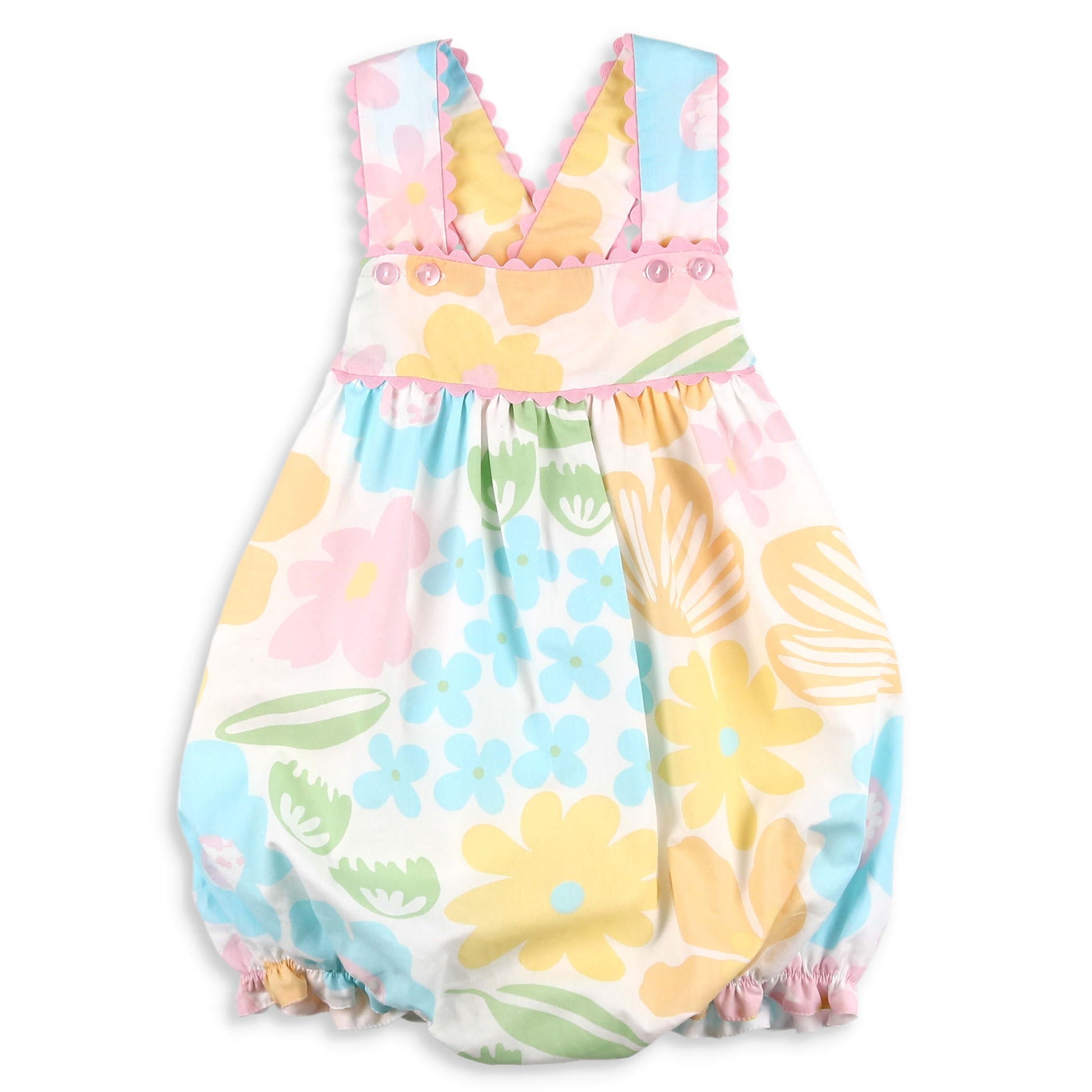 This sweet, vintage style girls baby bubble, or girls toddler bubble features a pastel floral print in pink, blue and yellow on white cotton fabric with pink ric rac trim on the neckline and the shoulder straps, adorable ruffle legs, and custom buttons at the front, making this summer bubble as fun as it is cute!