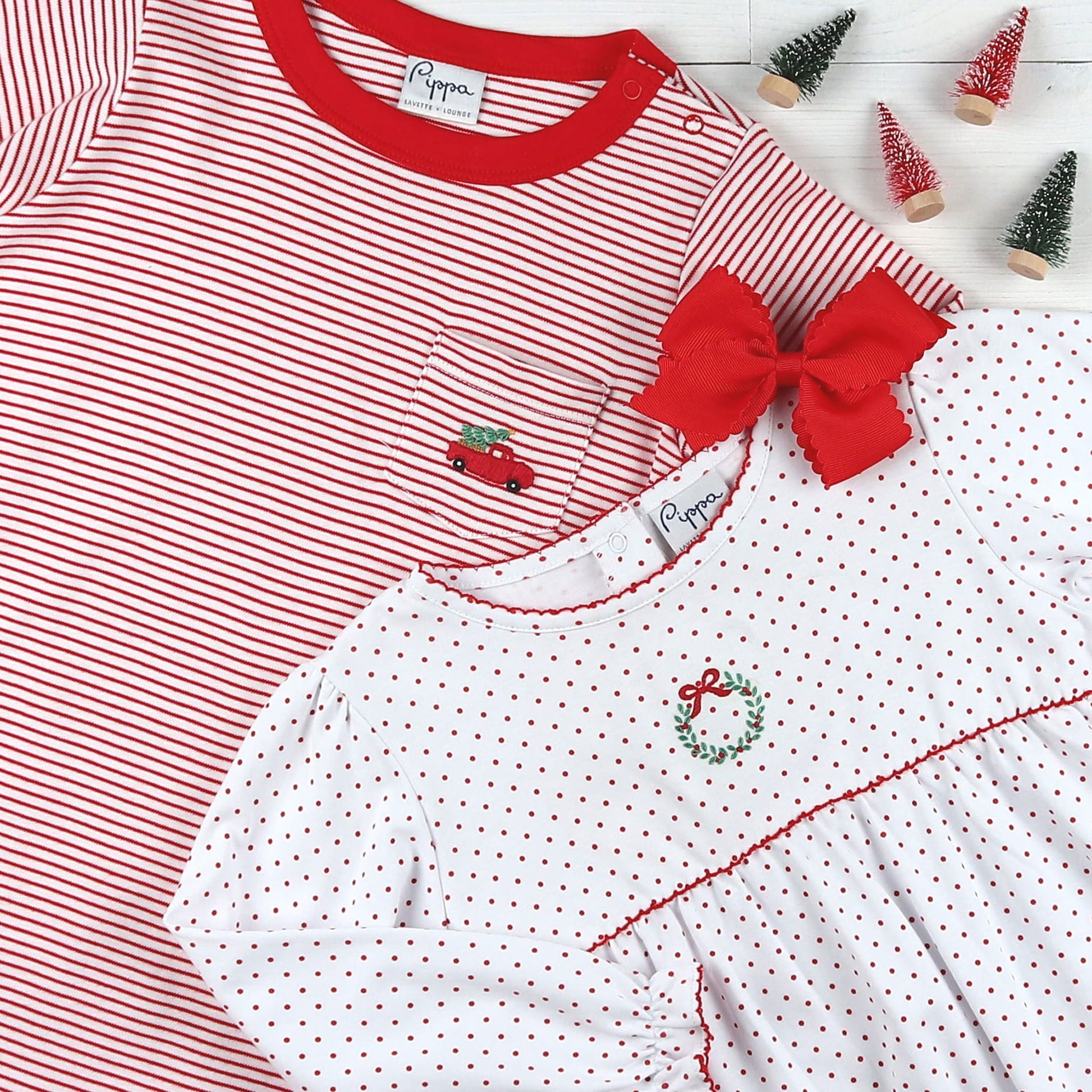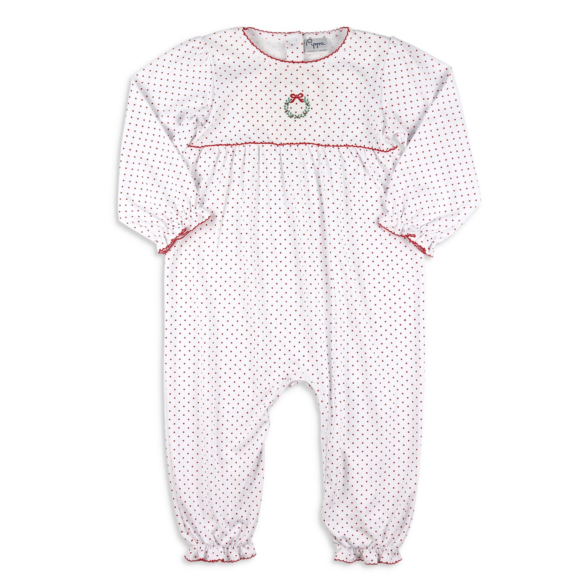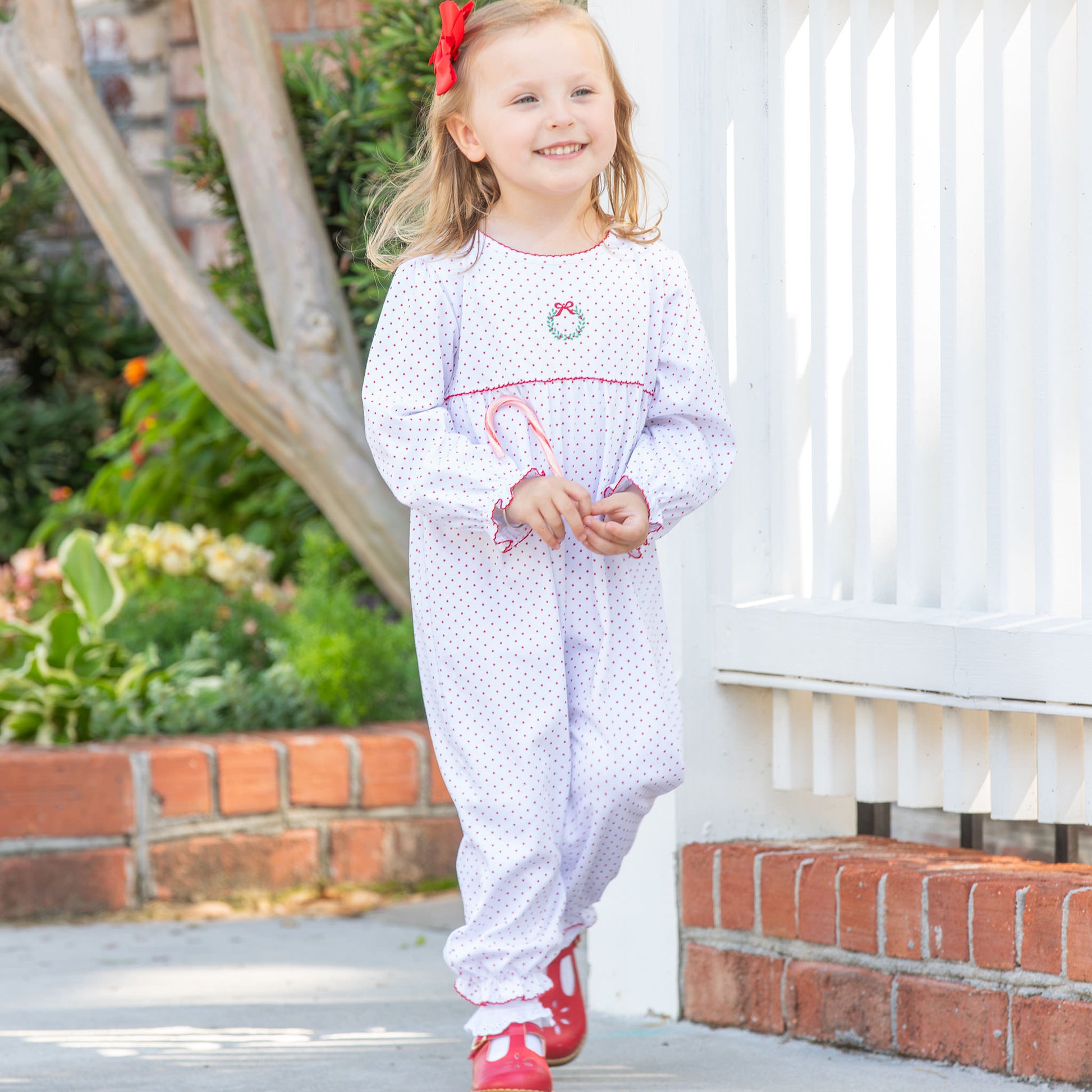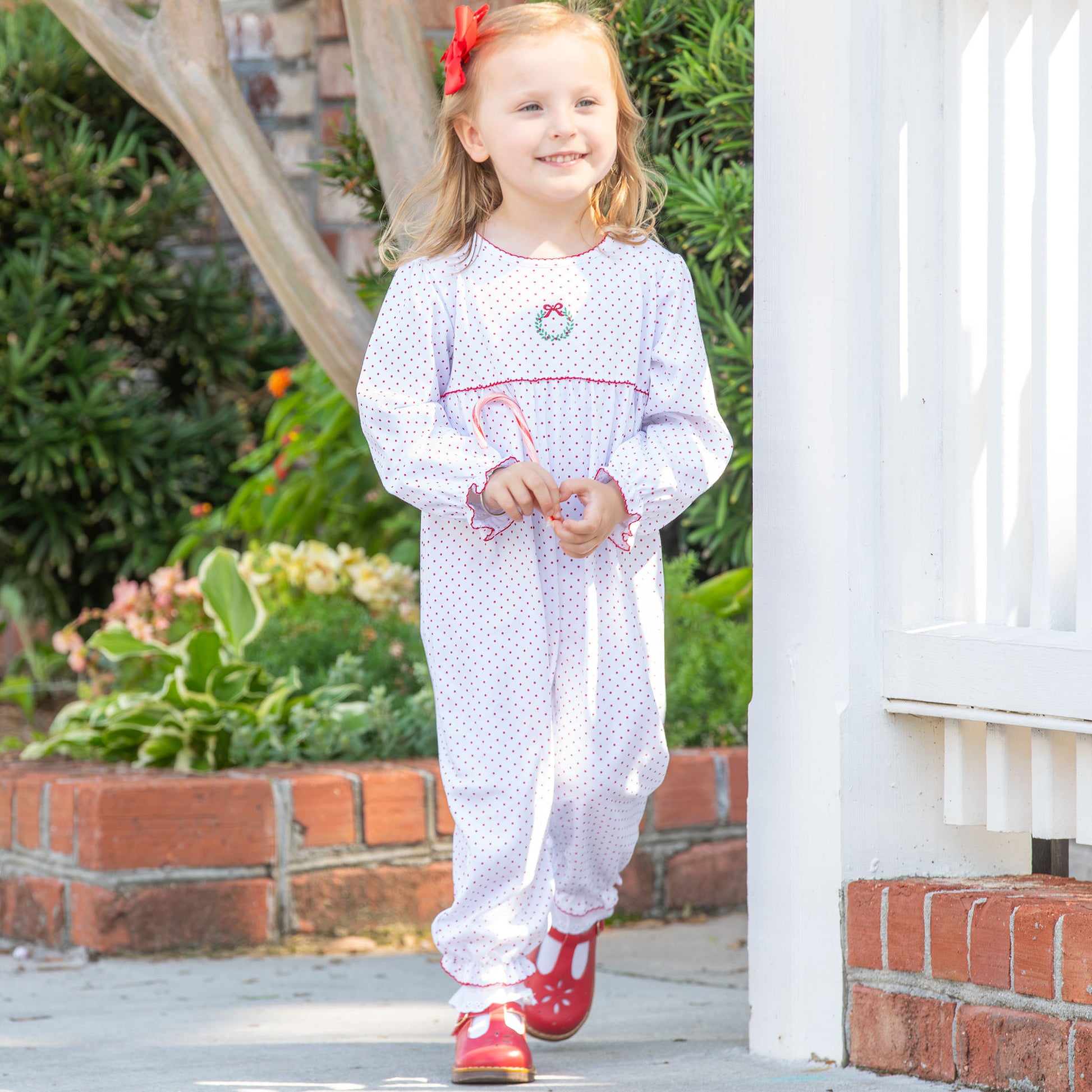 Featuring red polka dots on white super soft Pima cotton, with red picot trimming the neckline, the long ruffle sleeves, ruffle legs, and across the chest, along with an embroidered Christmas wreath on the front.ย The snaps at the back and snaps at the legs, makes this so easy for quick changes! This classic outfit will be one of your little girl's favorite go to comfy outfits.