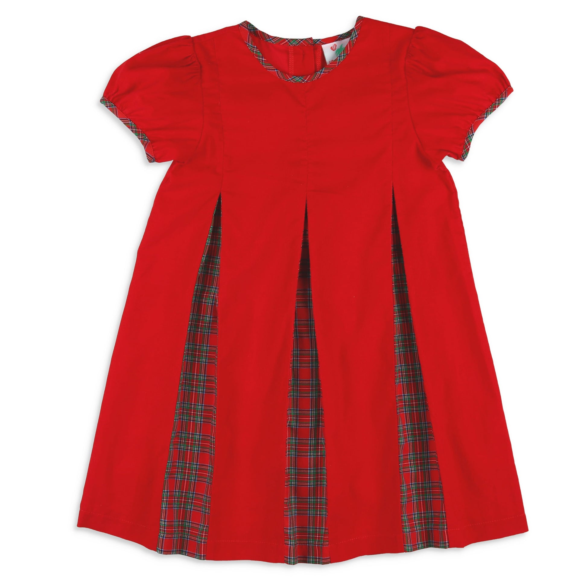 The flattering, classic dress in Christmas red cotton, features tartan plaid trim around the neckline, trimming the short puff sleeves, and the plaid comes in soft, cotton/poly fabric. The tartan plaid accenting the inside of the pleats down the front makes it even more festive!