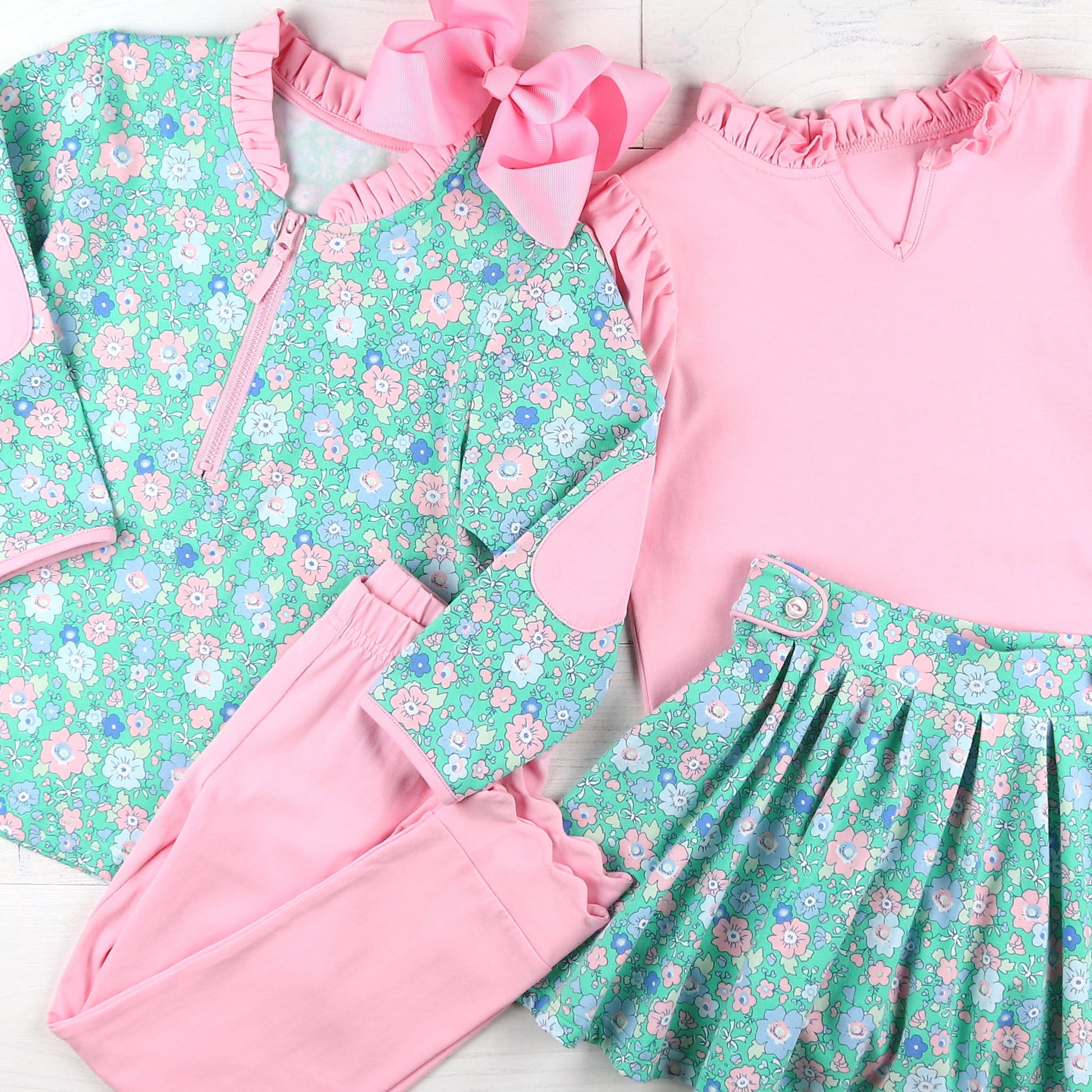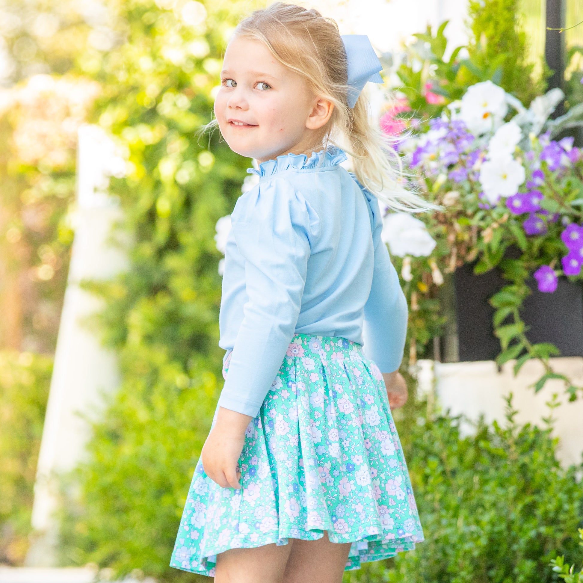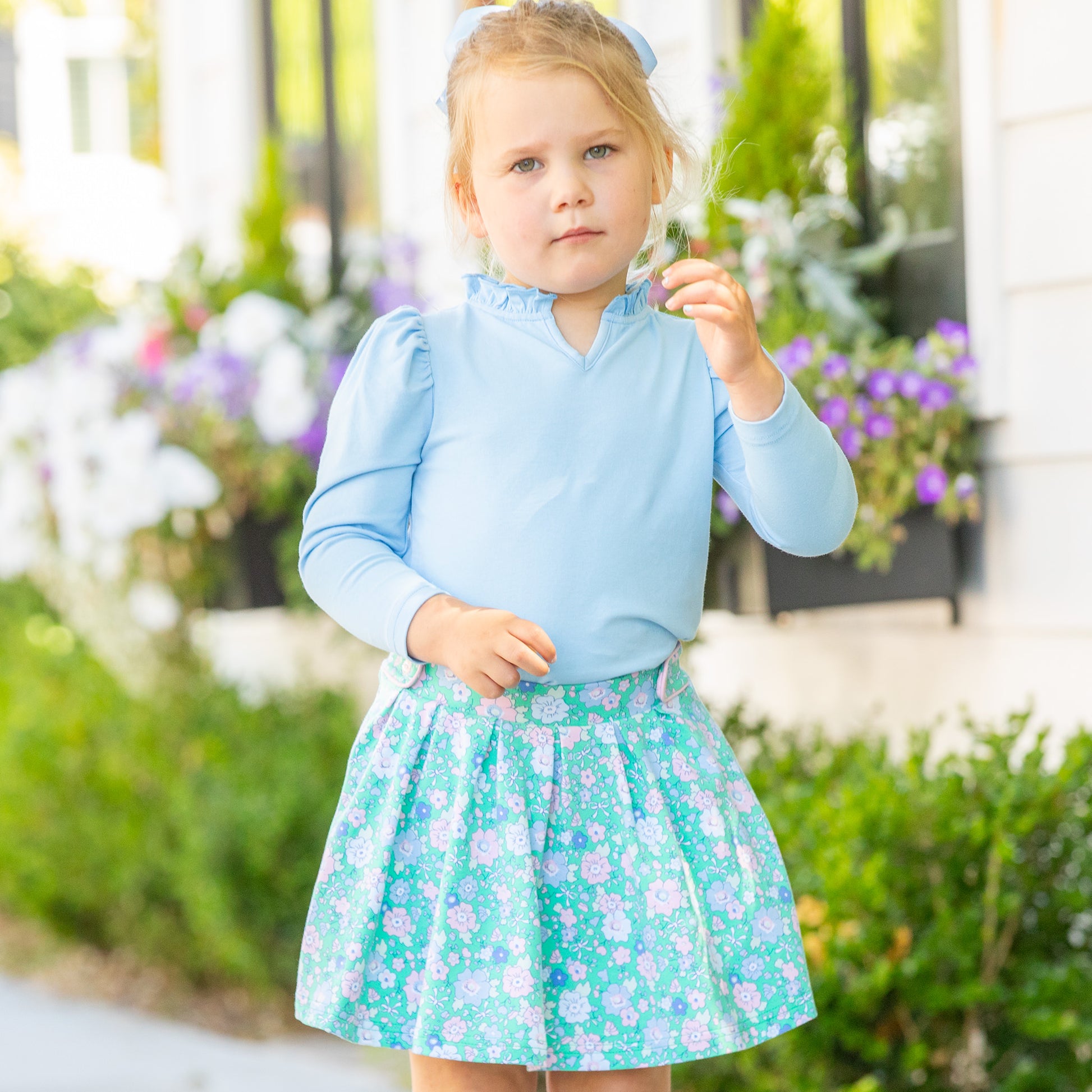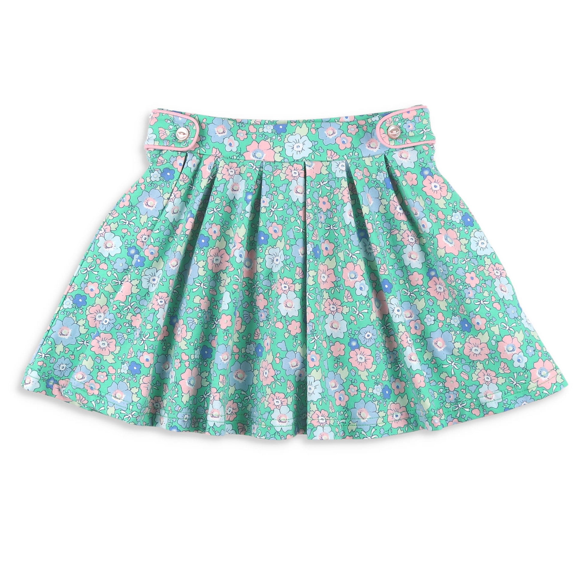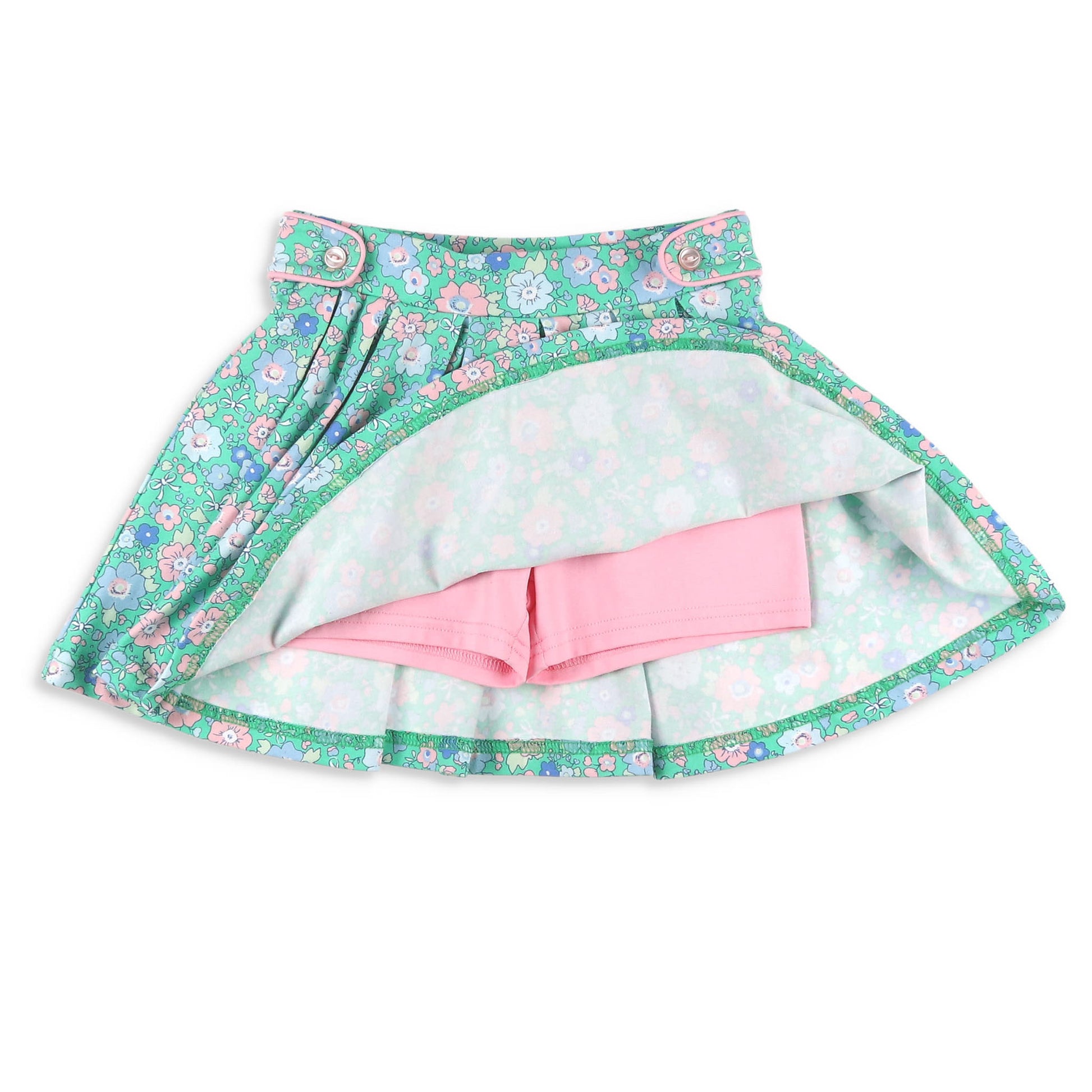 This feminine skort, feature a soft fabric in blues, pink, and a white delicate floral print on green cotton knit, with pink piping along the button tabs at the easy elastic waist, is fully pleated, and includes under skirt pink pants. Pair with our Girls Blue Lagoon Ruffle Neck Top or our Girls Ballet Pink Ruffle Neck Top for an adorable look!