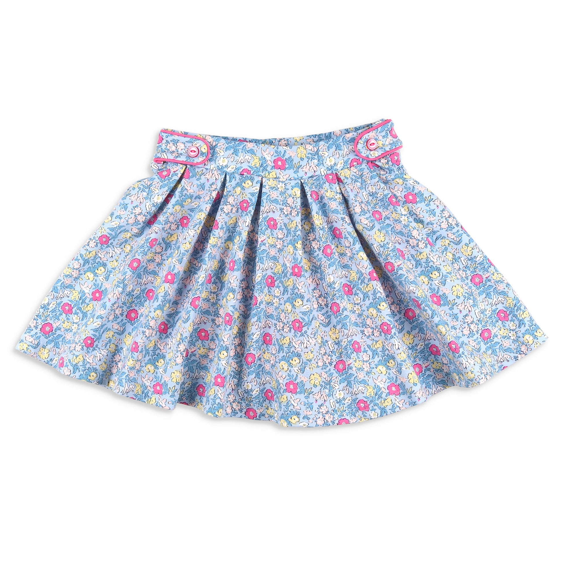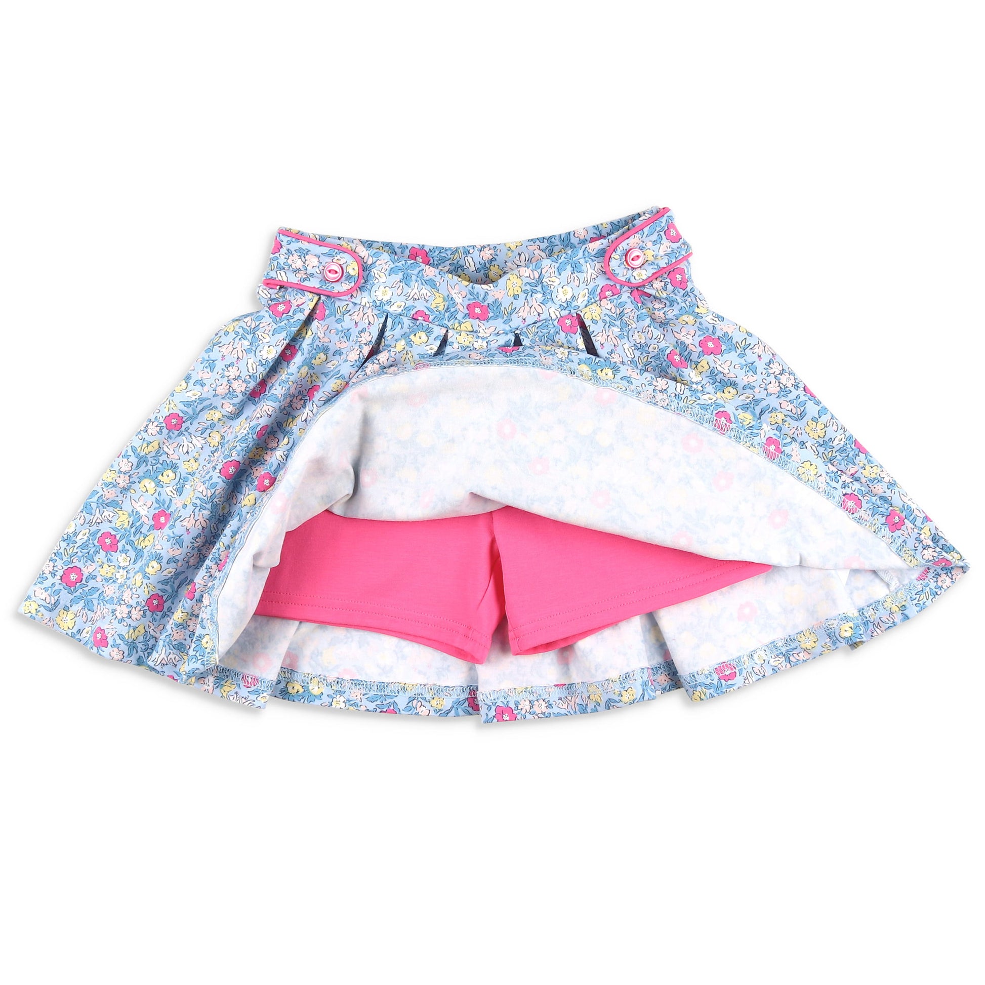 This playful skort features soft, cotton knit fabric in a pink, blue, yellow, and white floral print on light blue knit fabric, with raspberry pink piping trim along the button tabs at the waist, an elastic waist fully pleated, and under skort raspberry pink pants for that added comfort, all creating a sporty picture! Â