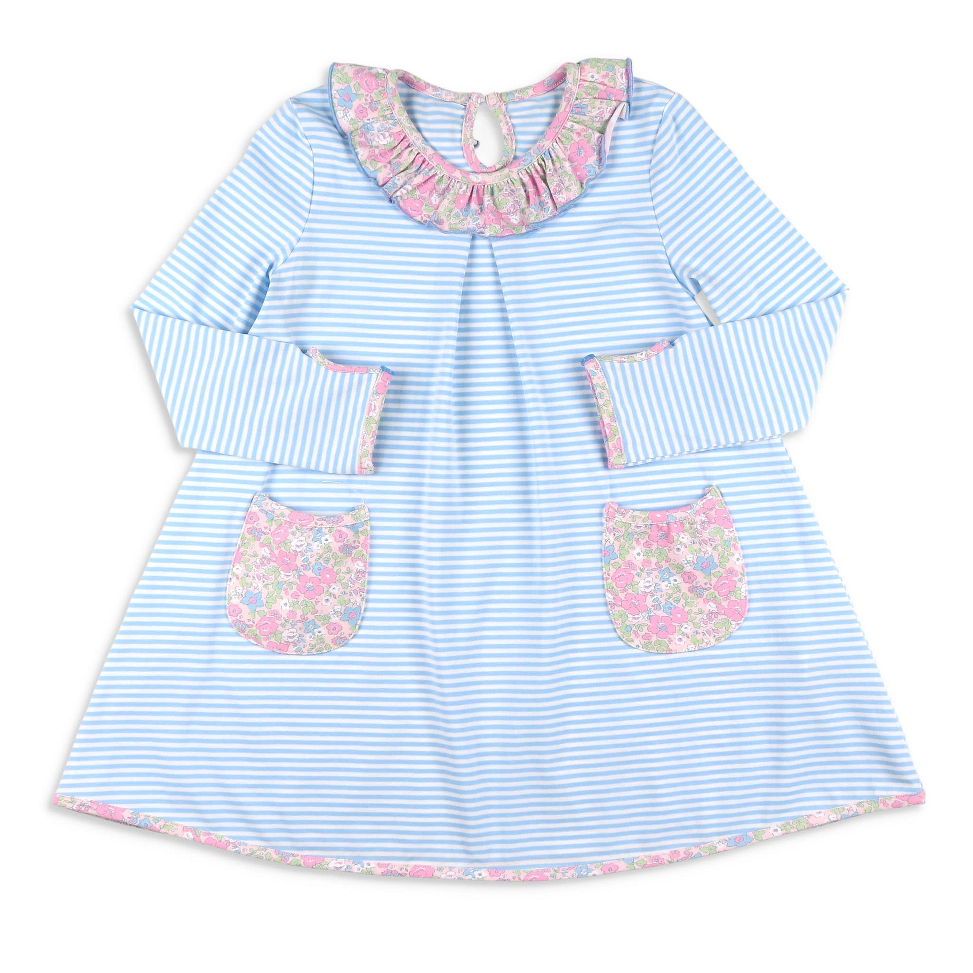 This feminine dress, feature a soft fabric in blue and white stripe, a delicate blue serge trimmed floral ruffle collar, floral trimmed hem, keyhole long sleeves, and trimming the keyhole back. The fun floral front pockets and front pleat makes this truly adorable, and will surely become one of her favorite outfits.