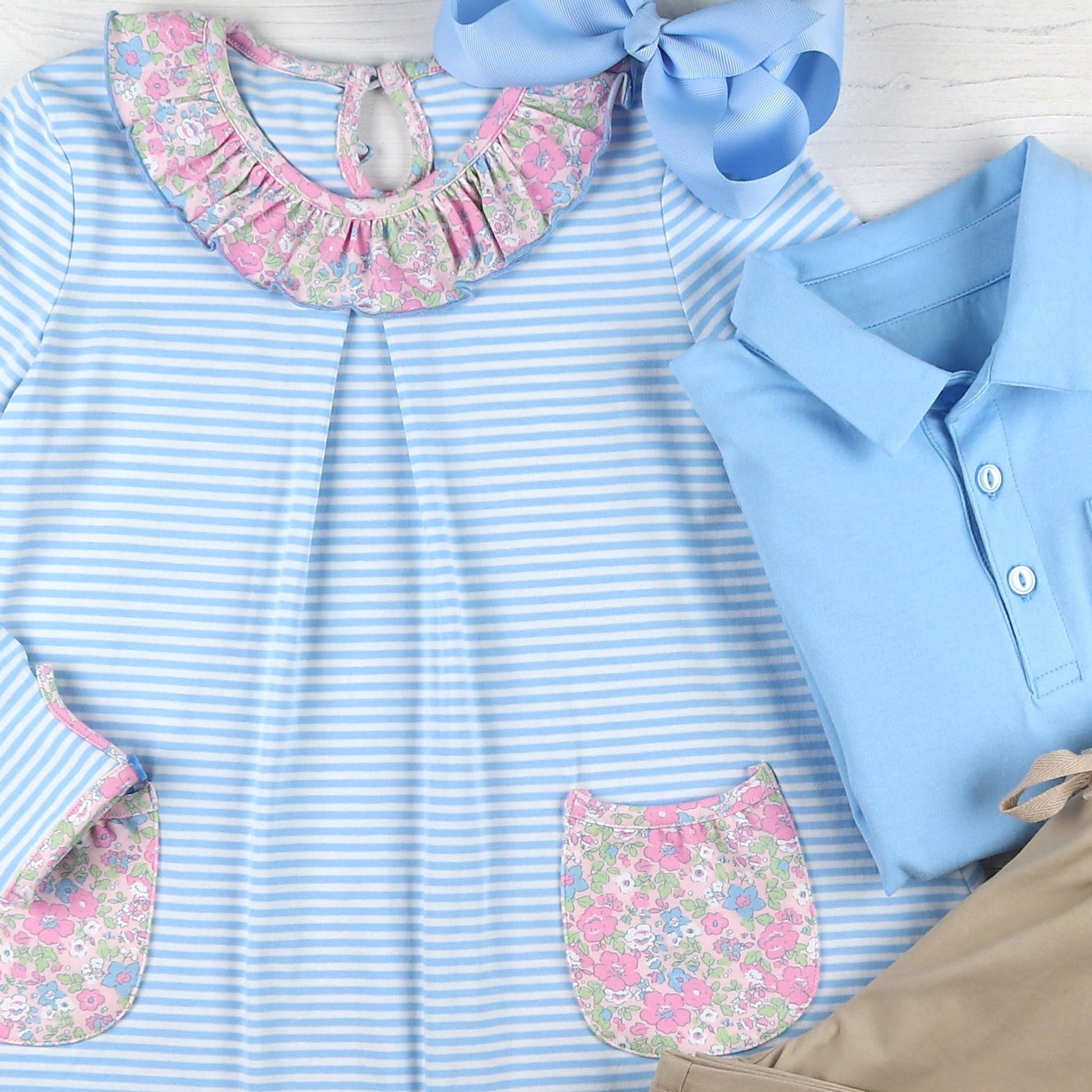 The fall is a really great time to plant cold weather vibrant flowers. Your daughter just could get motivated to help with the flower garden in this sweet Girls Pocket Dress-Blue Stripe, while staying totally comfy.