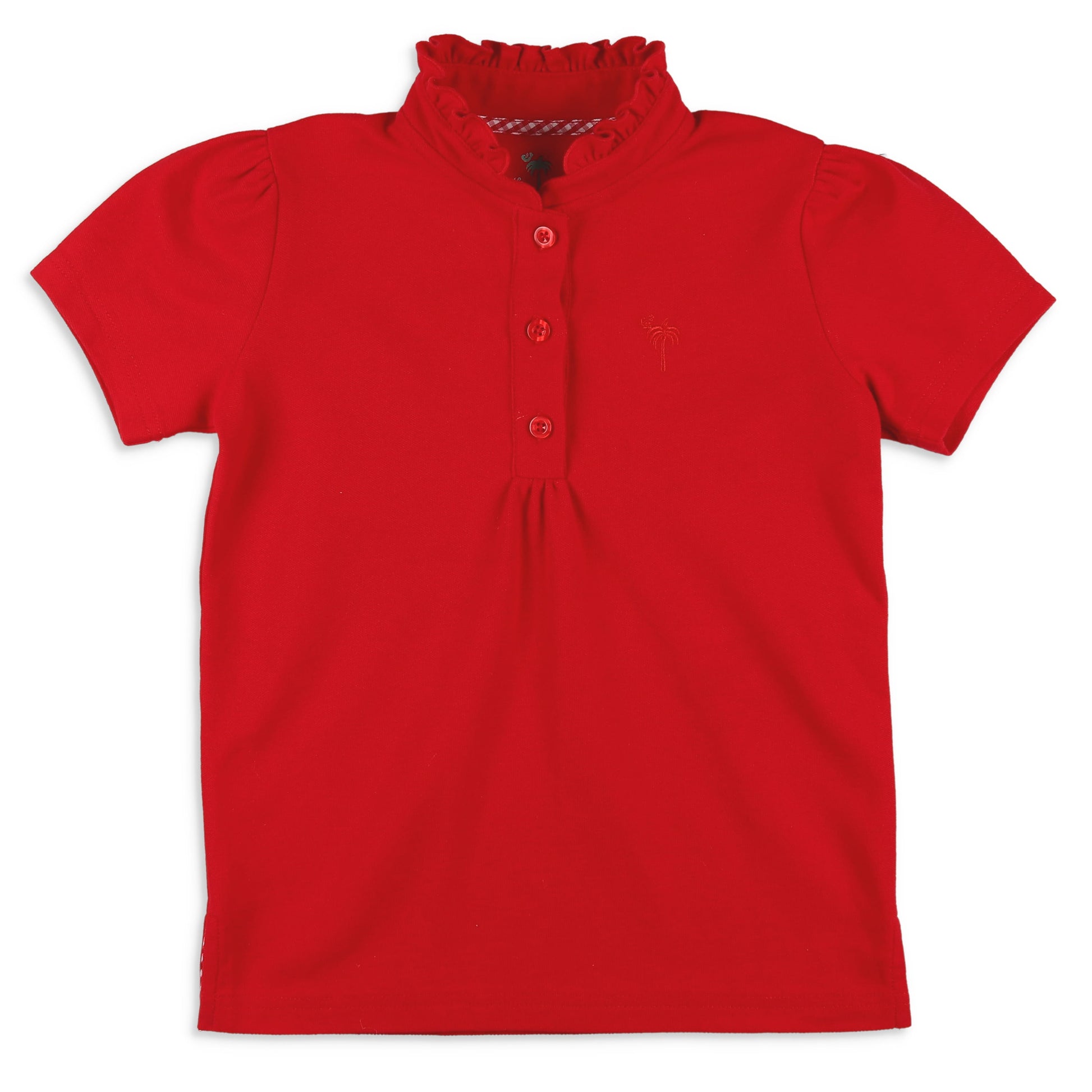 This versatile top features soft, poly/cotton blend fabric in red, a ruffle neck, a palmetto tree and shrimp moon front logo, and three custom front buttons making it perfect for pairing with shorts, skorts, skirts, or pants.