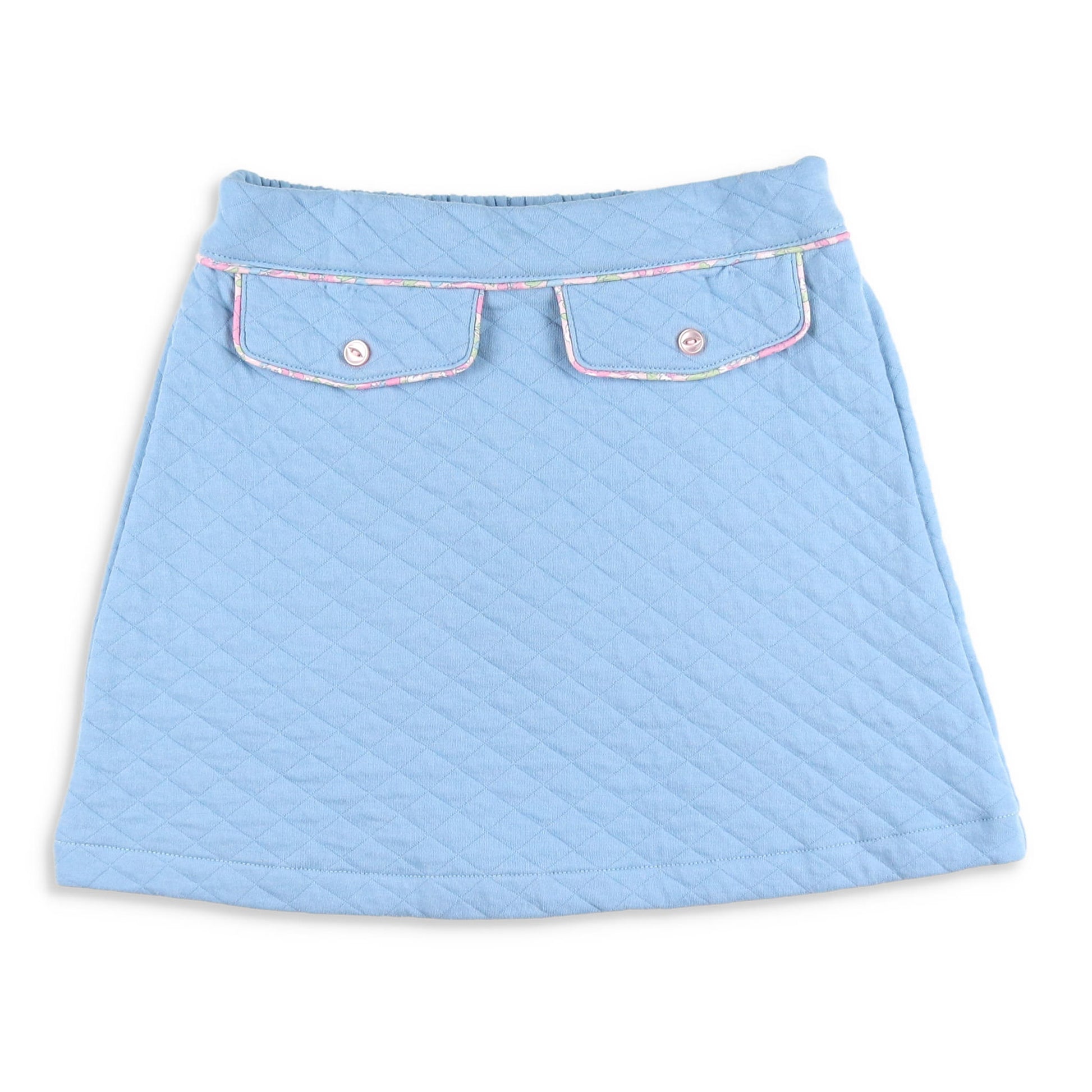 This sweet, feminine skirt, features a soft, quilted 100% cotton fabric in an ocean blue, with a floral piping trimmed flaps on faux pocket and trim at the waist, creating that special vintage look. Pair with our Girls Ruffle Neck Top-Blushing Blooms or other blouses for total comfort and cuteness!