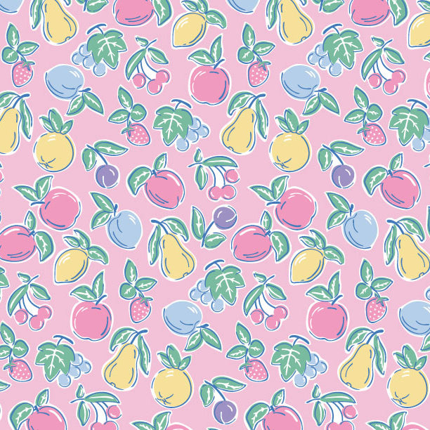 - Colorful fruit print on pink knit fabric