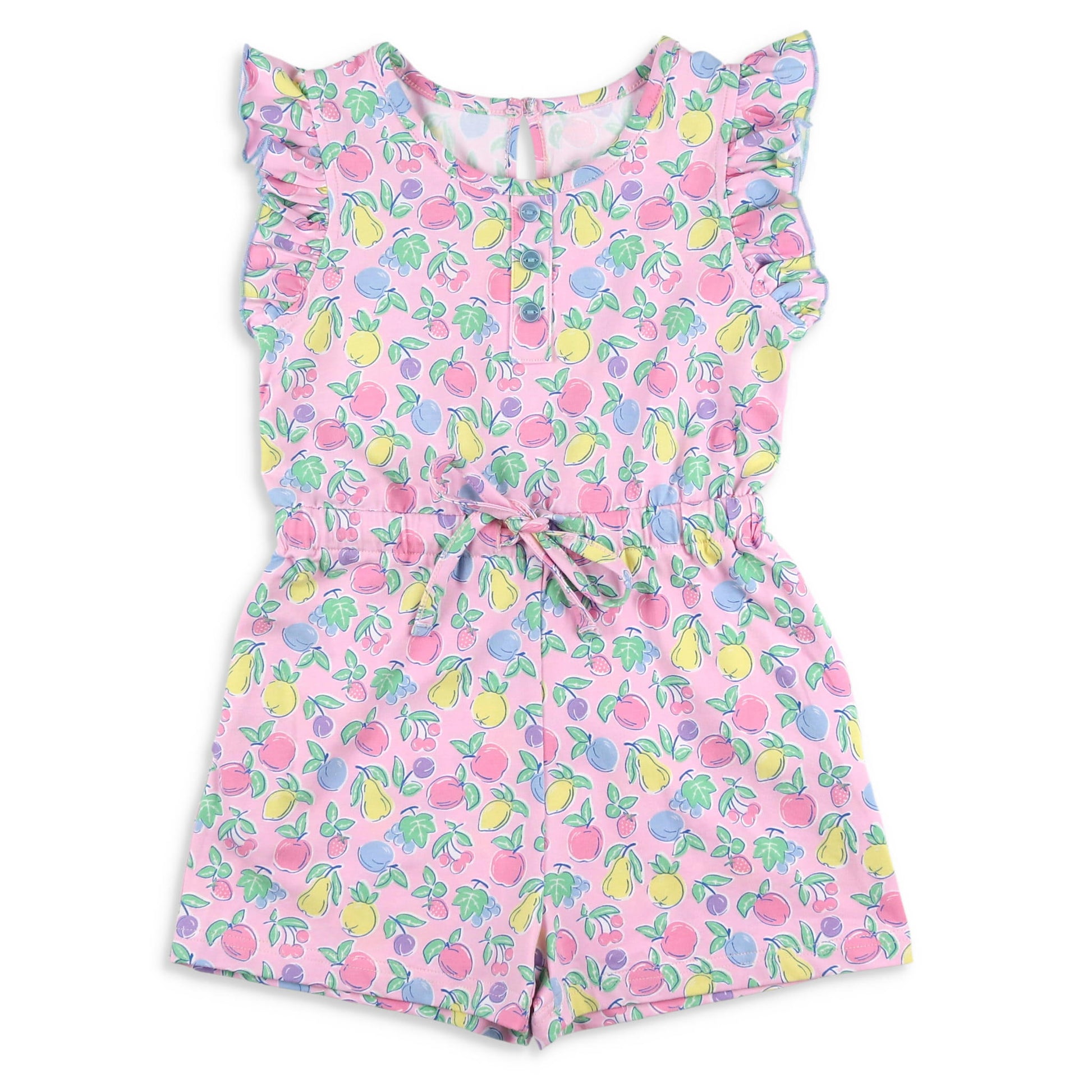 This whimsical one piece features soft, cotton knit fabric in a colorful fruit print on pink knit, with sweet blue serge finished ruffle sleeves, a button tab and three custom buttons at the front, and a gathered waist with a tie drawstring all creating a darling picture! The fun keyhole back, just makes this romper even more special.